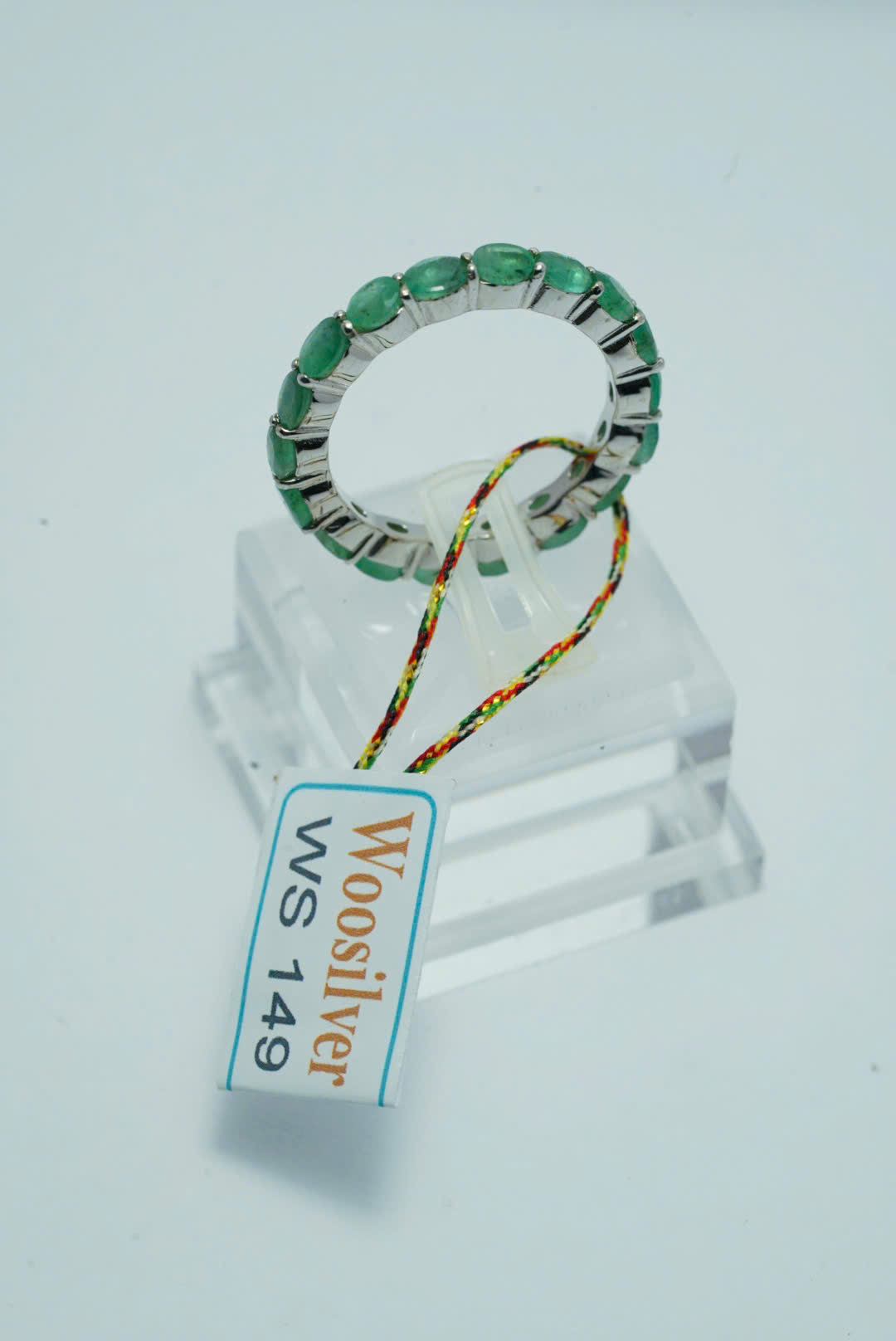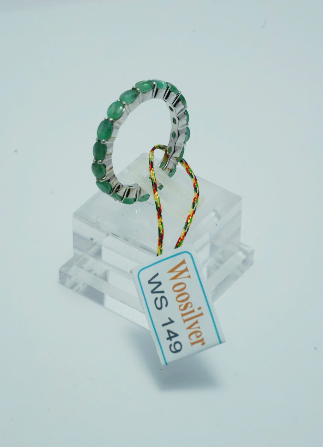Chiếc nhẫn bạc này gây ấn tượng mạnh với thiết kế dãy đá ngọc lục bảo xanh rực rỡ bao quanh toàn bộ vòng nhẫn. Mỗi viên đá ngọc lục bảo được cắt tròn, sắp xếp liền kề thành một vòng liên tục, mang lại cảm giác sang trọng và quý phái. Ngọc lục bảo, được biết đến như viên đá của sự tái sinh và trí tuệ, biểu tượng của hy vọng và may mắn, tỏa ra vẻ đẹp thiên nhiên đầy sức sống. Thiết kế vòng không chỉ thể hiện sự thanh lịch mà còn mang đến vẻ đẹp vượt thời gian, là lựa chọn hoàn hảo cho những dịp quan trọng hoặc để thể hiện phong cách tinh tế của người đeo chiếc nhẫn này mang lại sự thoải mái thoải mái và tôn vinh bàn tay của người sở hữu.