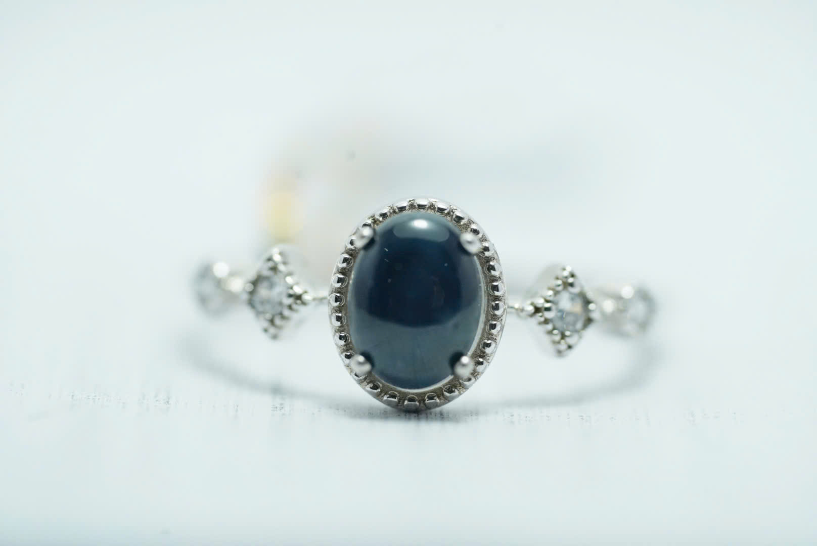 Viền đá được thiết kế dạng hạt tròn cổ điển, gợi cảm giác sang trọng nhẹ nhàng. Hai bên thân nhẫn được điểm xuyết bằng hai viên đá trắng cắt hình vuông gắn chấu nổi bật – giúp tổng thể hài hòa, mang vẻ đẹp nhẹ nhàng mà không kém phần nổi bật.
