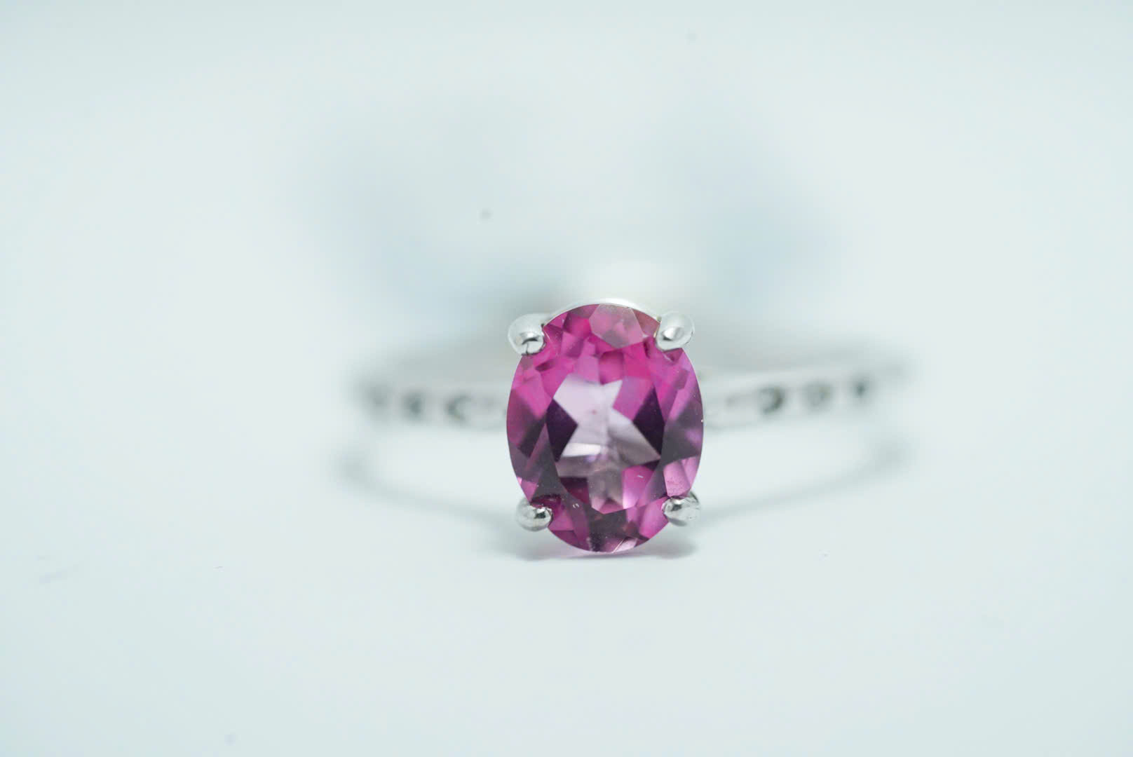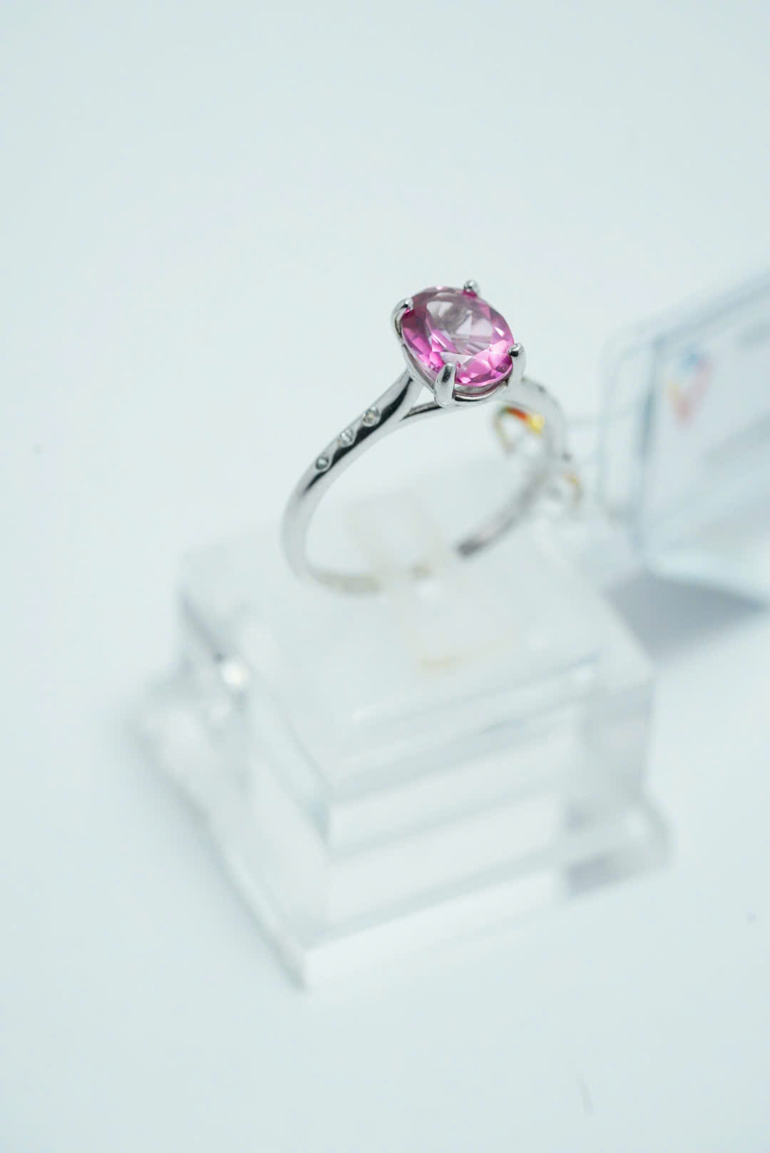 Viên đá Topaz hồng chủ đạo được cắt giác hình oval tinh xảo, có độ trong suốt cao và phản chiếu ánh sáng lung linh, tạo nên điểm nhấn hoàn hảo cho đôi tay.