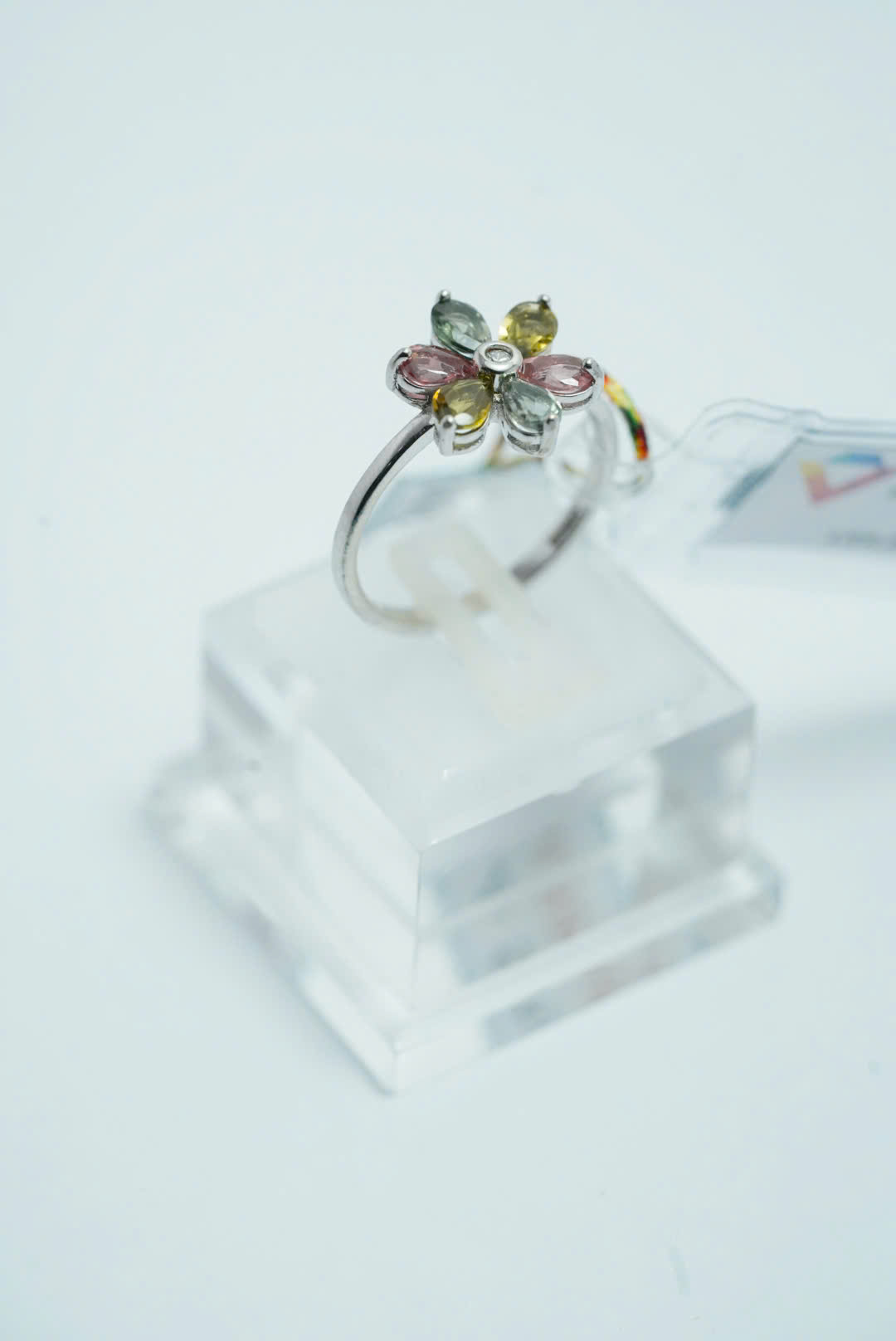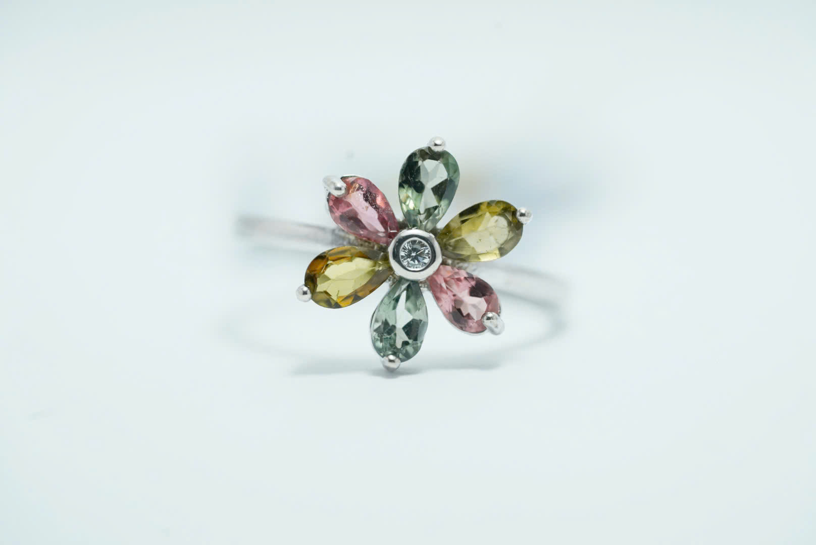 Chiếc nhẫn đá Tourmaline S925 nổi bật với thiết kế hoa 6 cánh mềm mại, mỗi cánh hoa là một viên đá Tourmaline màu tự nhiên được cắt hình giọt lệ tinh xảo.