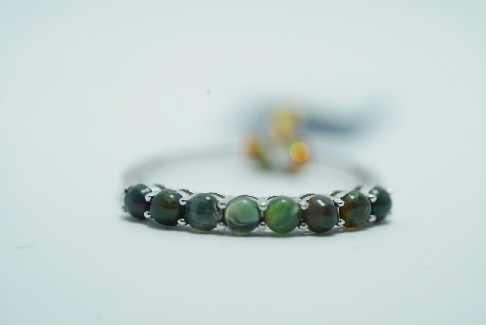 Được thiết kế với 9 viên đá tròn nhỏ xếp liên tiếp, chiếc nhẫn tạo nên một “dải ngân hà thu nhỏ” với sự chuyển sắc linh hoạt từ xanh rêu, nâu mật cho đến những ánh cam đỏ lấp lánh ẩn hiện dưới ánh sáng.