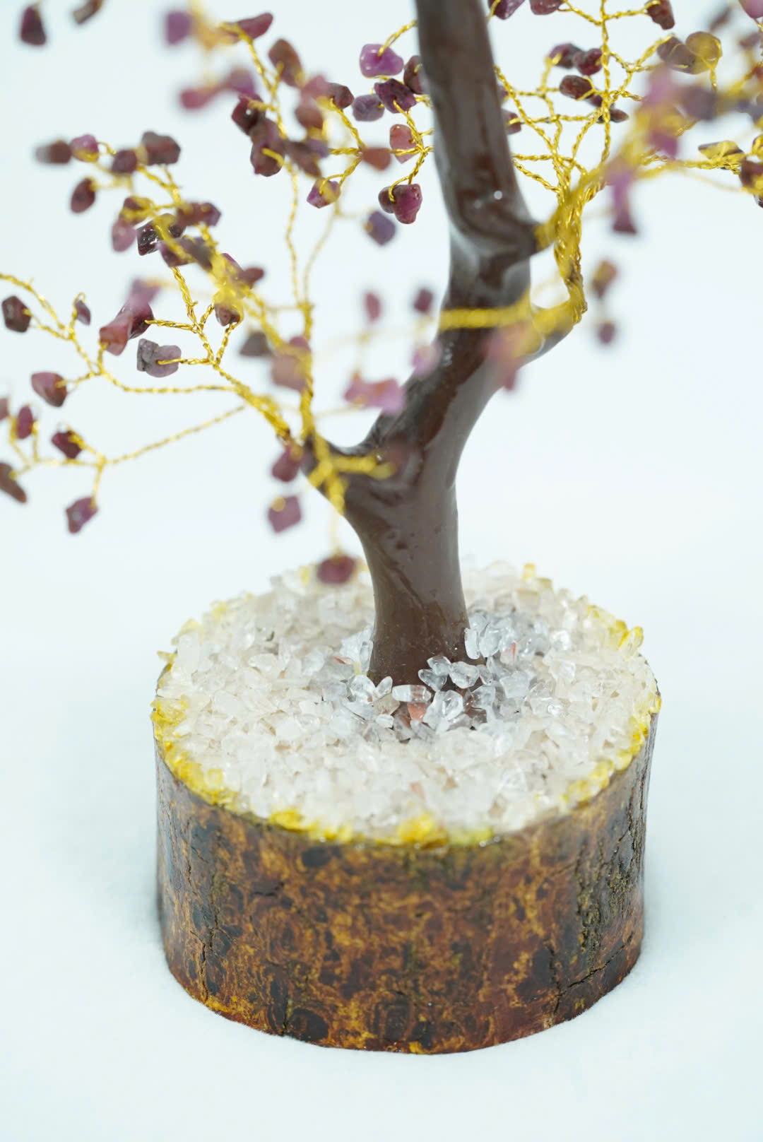 Đế cây được làm từ một khúc gỗ tự nhiên , với bề mặt được phủ một lớp đá trắng nhỏ, giúp cây đứng vững và tăng tính thẩm mỹ.
