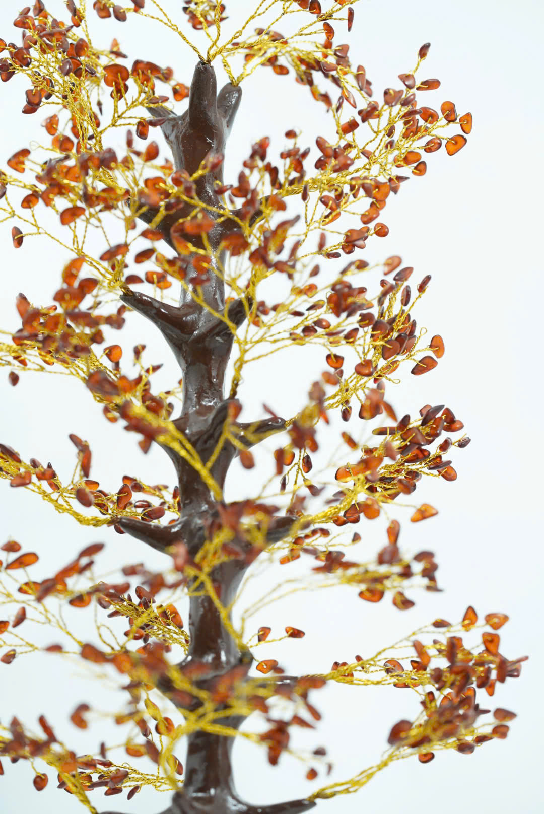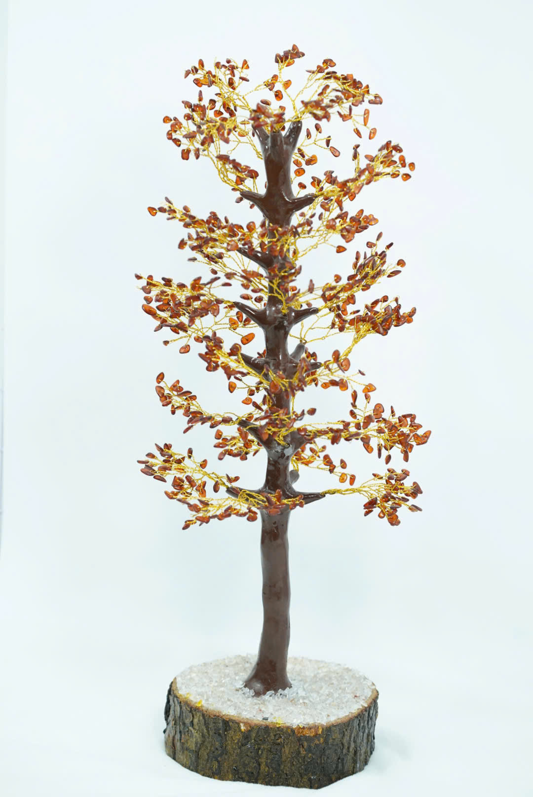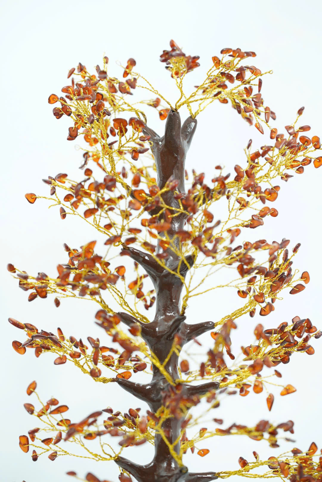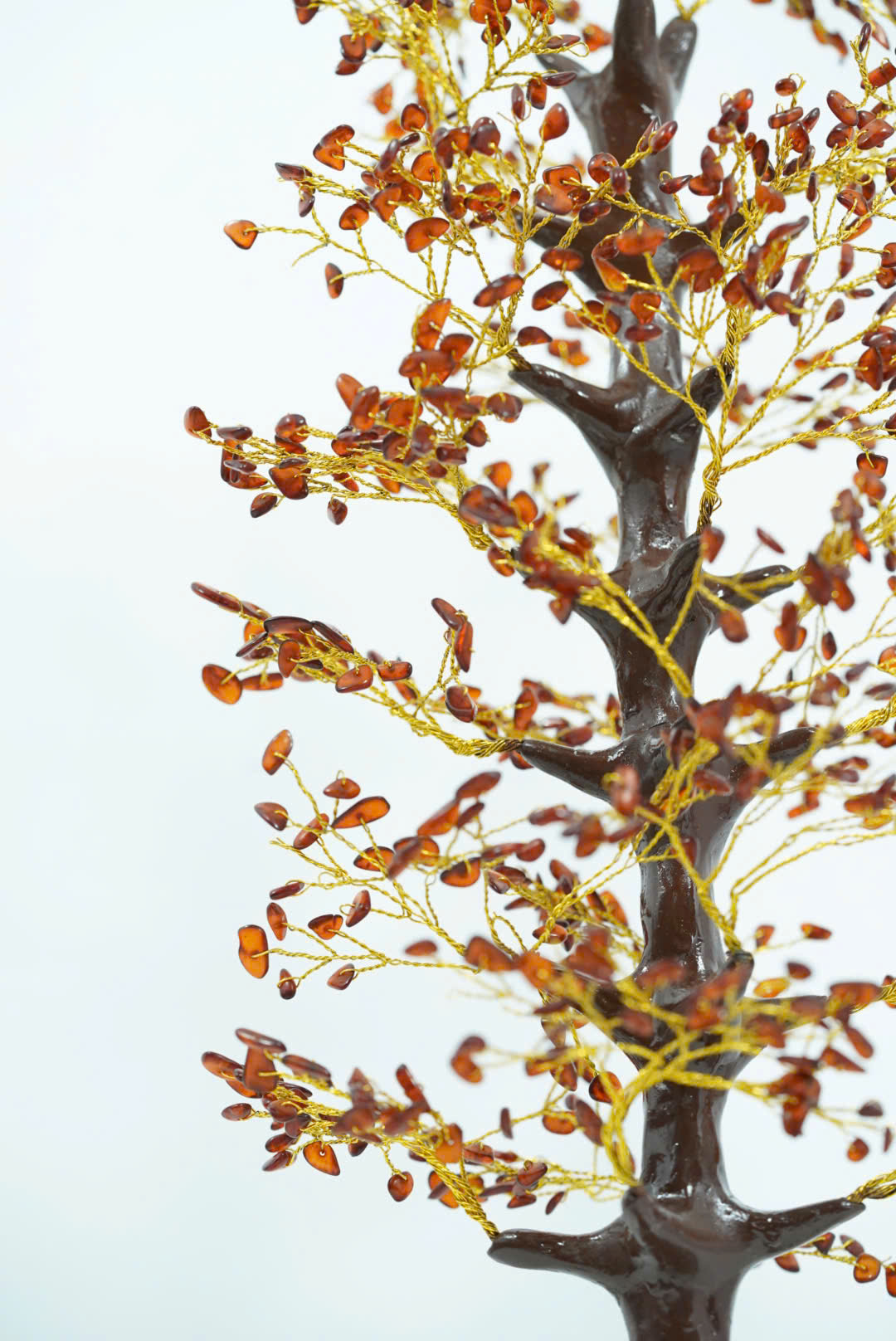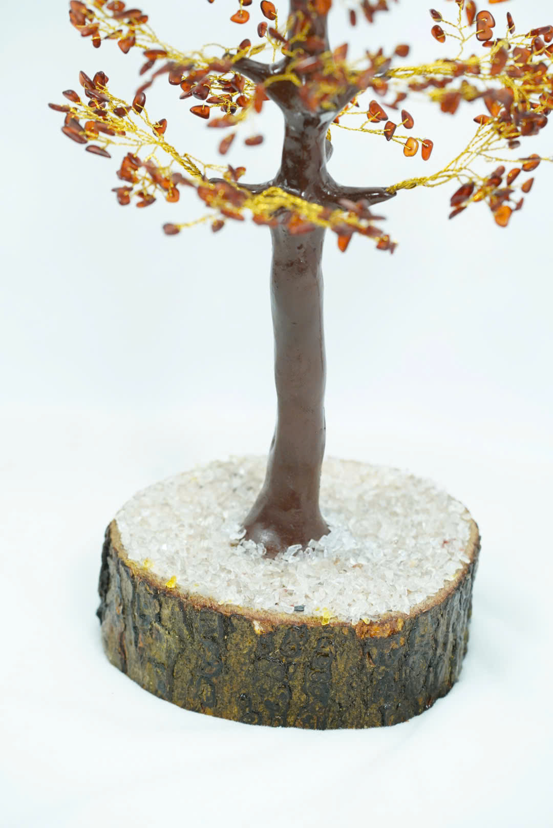 Lá được thay thế bằng những viên đá hổ phách tự nhiên, có màu cam vàng trong suốt. Đá hổ phách không chỉ mang lại vẻ đẹp cuốn hút mà còn mang ý nghĩa phong thủy, thu hút năng lượng tích cực và tài lộc.