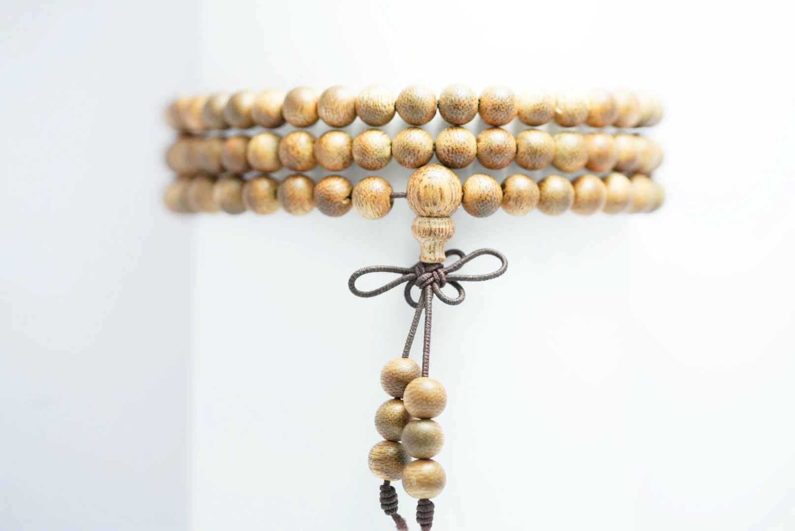 Chuỗi được xâu bằng sợi dây bền chắc, kết hợp cùng điểm nhấn là nút thắt hoa và các hạt trầm đính kèm tinh xảo ở phần đầu chuỗi, tạo nên tổng thể hài hòa và sang trọng.