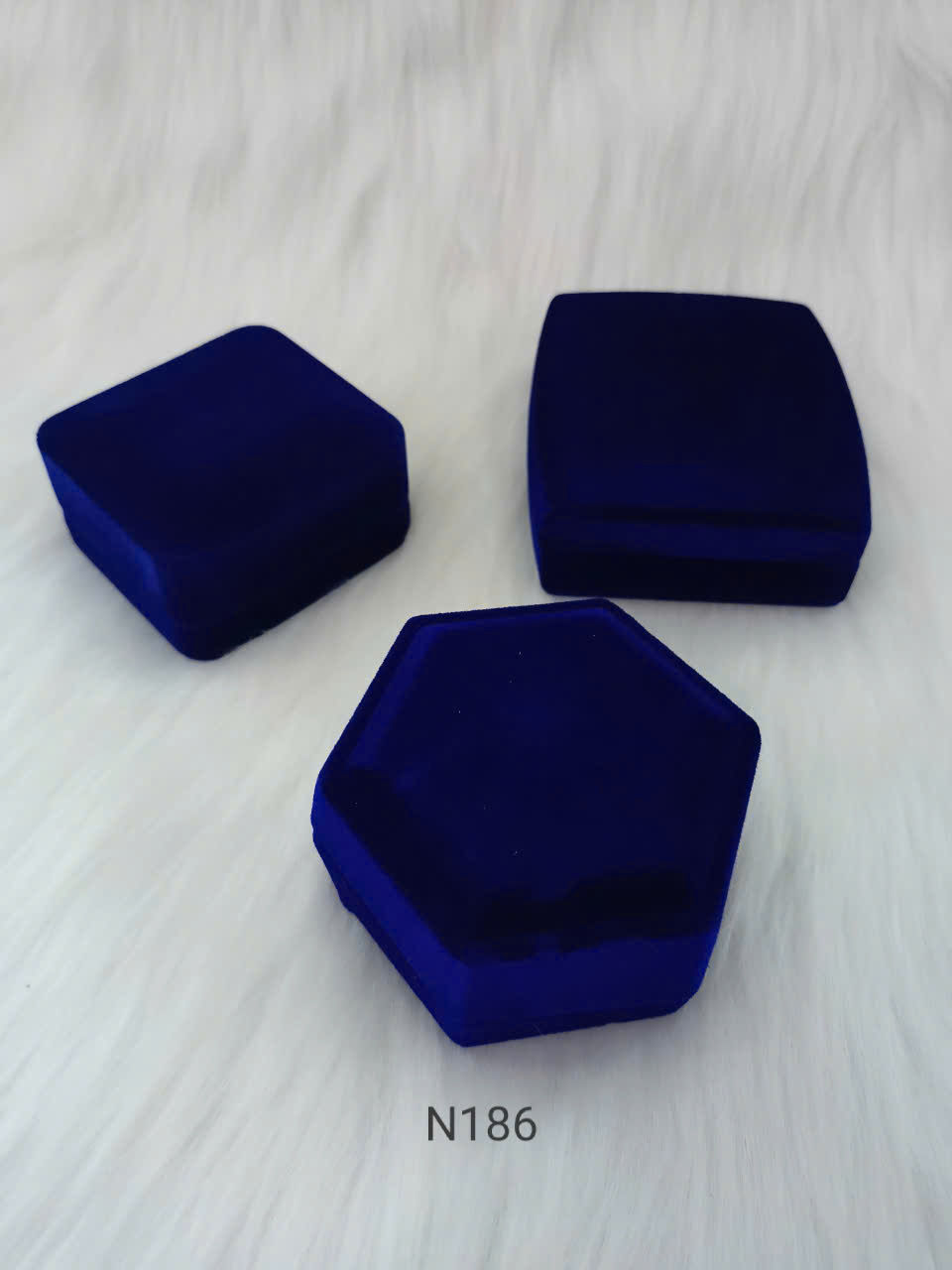 Combo 3 hộp nhung si Nhật N186 gồm ba hộp màu xanh dương hoàng gia với thiết kế sang trọng và đa dạng kiểu dáng: hộp vuông, hộp lục giác và hộp chữ nhật.
