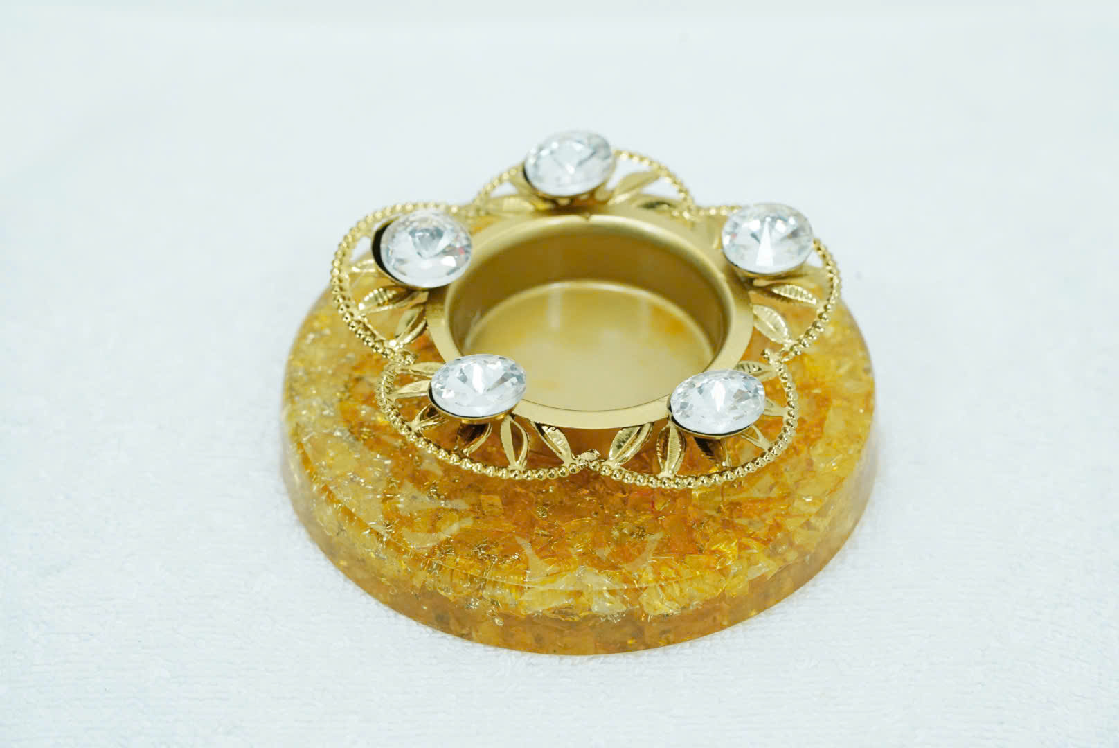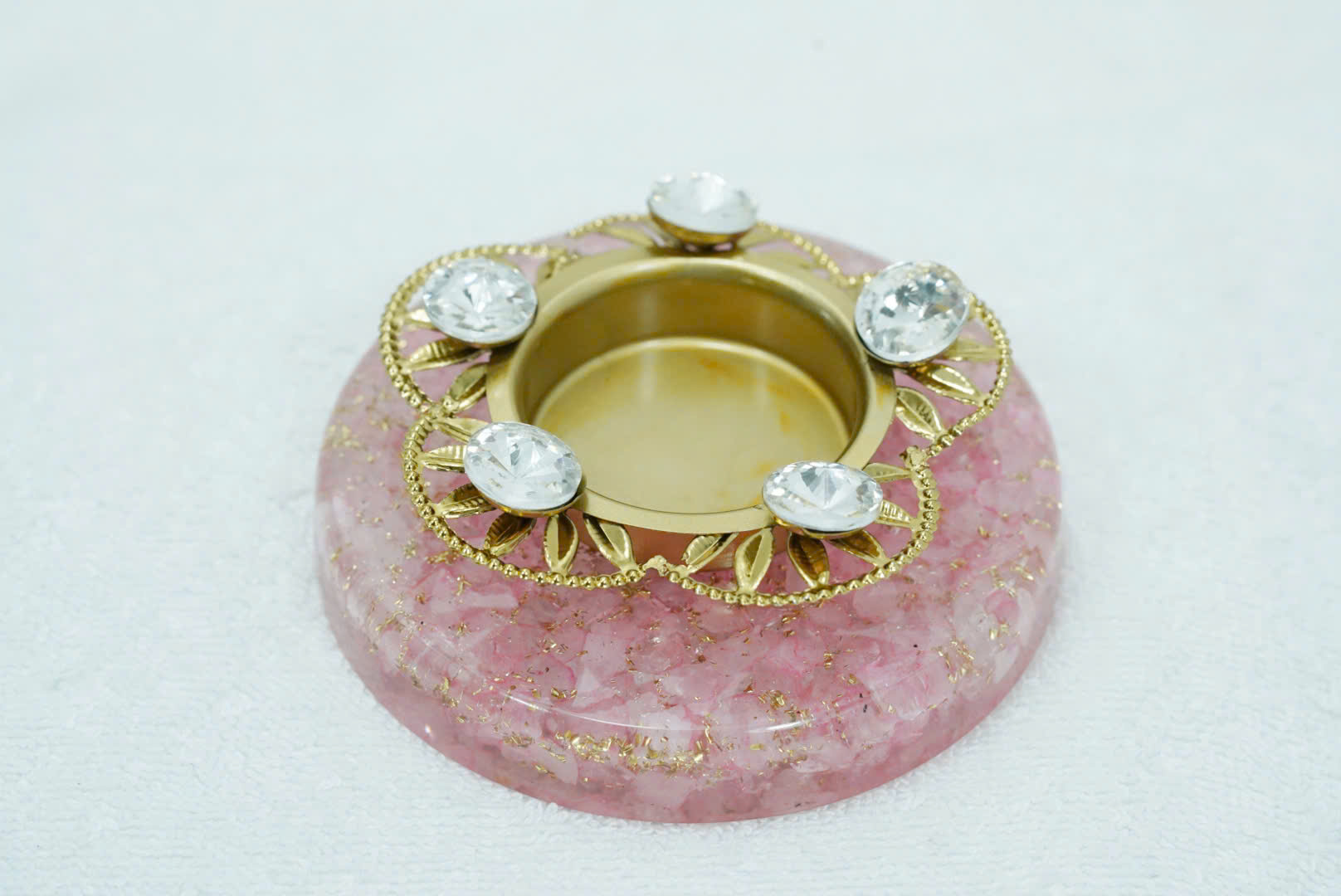 Đính pha lê lấp lánh : viền đế nến được đính kèm các viên đá pha lê sáng bóng, tạo nên vẻ ngoài rực rỡ và thu hút. Các thành viên pha lê đã cố định chắc chắn trên khung kim loại mạ vàng sang trọng.