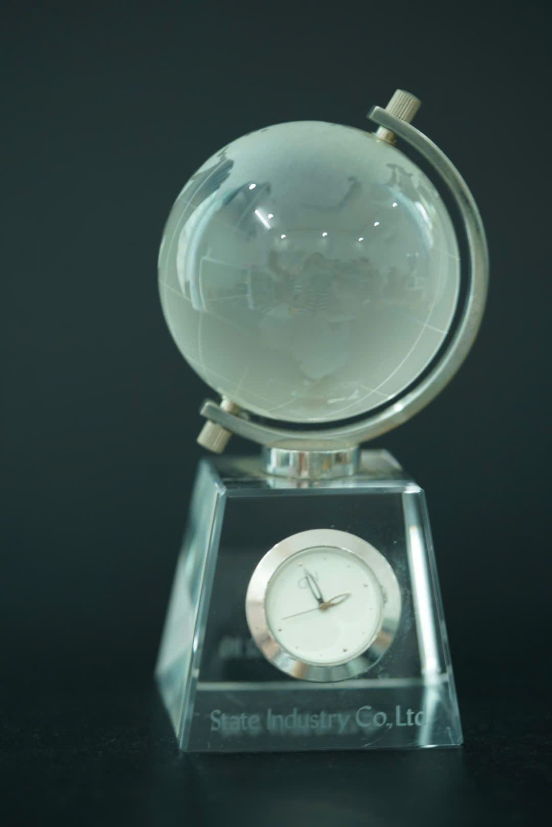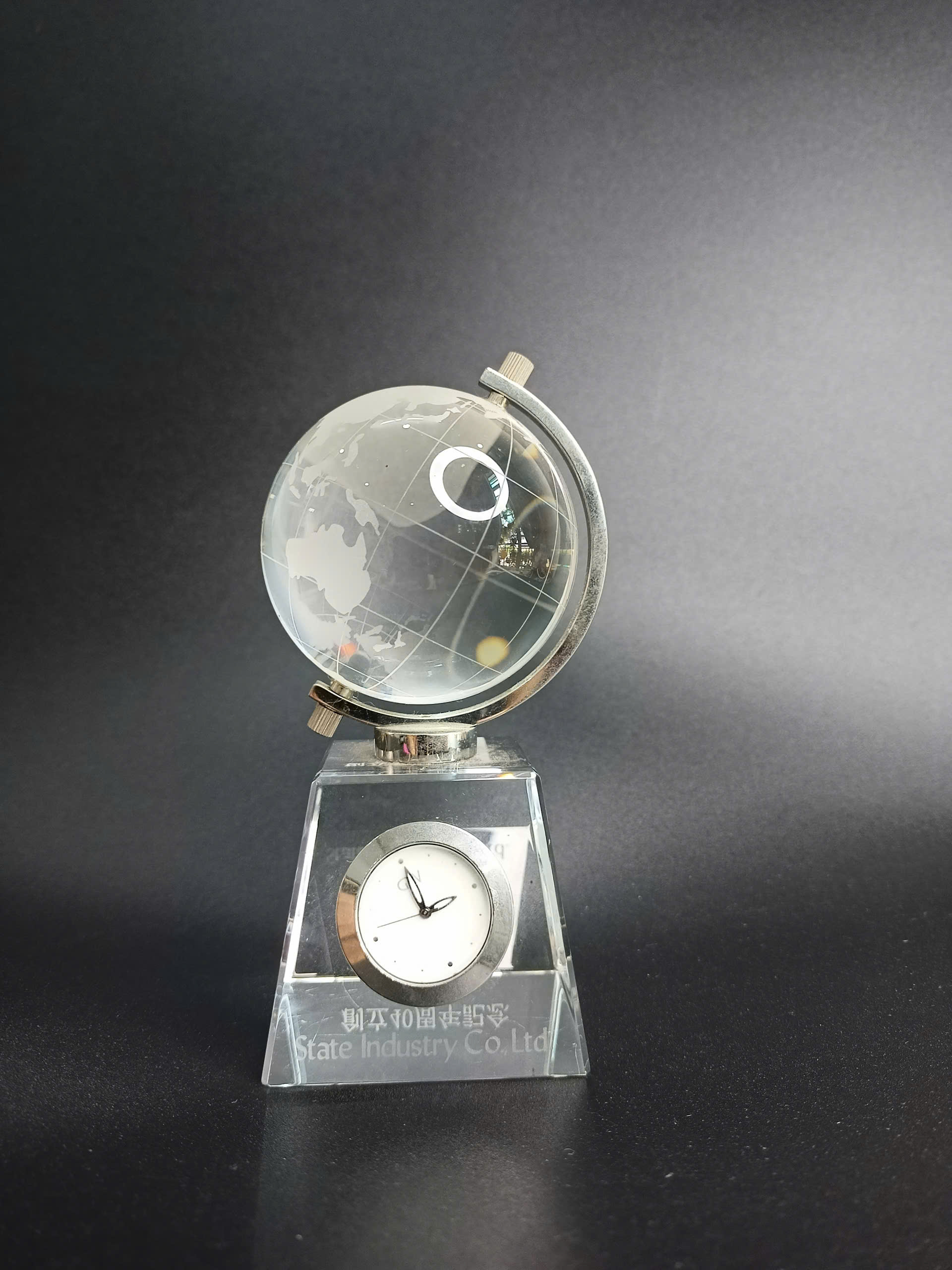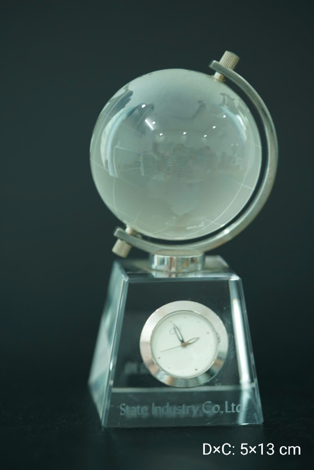 “Đồng hồ để bàn kết hợp quả cầu pha lê, một sản phẩm trang trí độc đáo và sang trọng, là sự kết hợp hoàn hảo giữa tính năng và nghệ thuật. Đồng hồ được thiết kế tinh xảo với phần chân đế làm từ pha lê trong suốt, mang đến sự sáng bóng và phản chiếu ánh sáng lung linh. Trên đỉnh là một quả cầu pha lê được khắc họa chi tiết bản đồ thế giới, tượng trưng cho sự bao quát và khám phá.