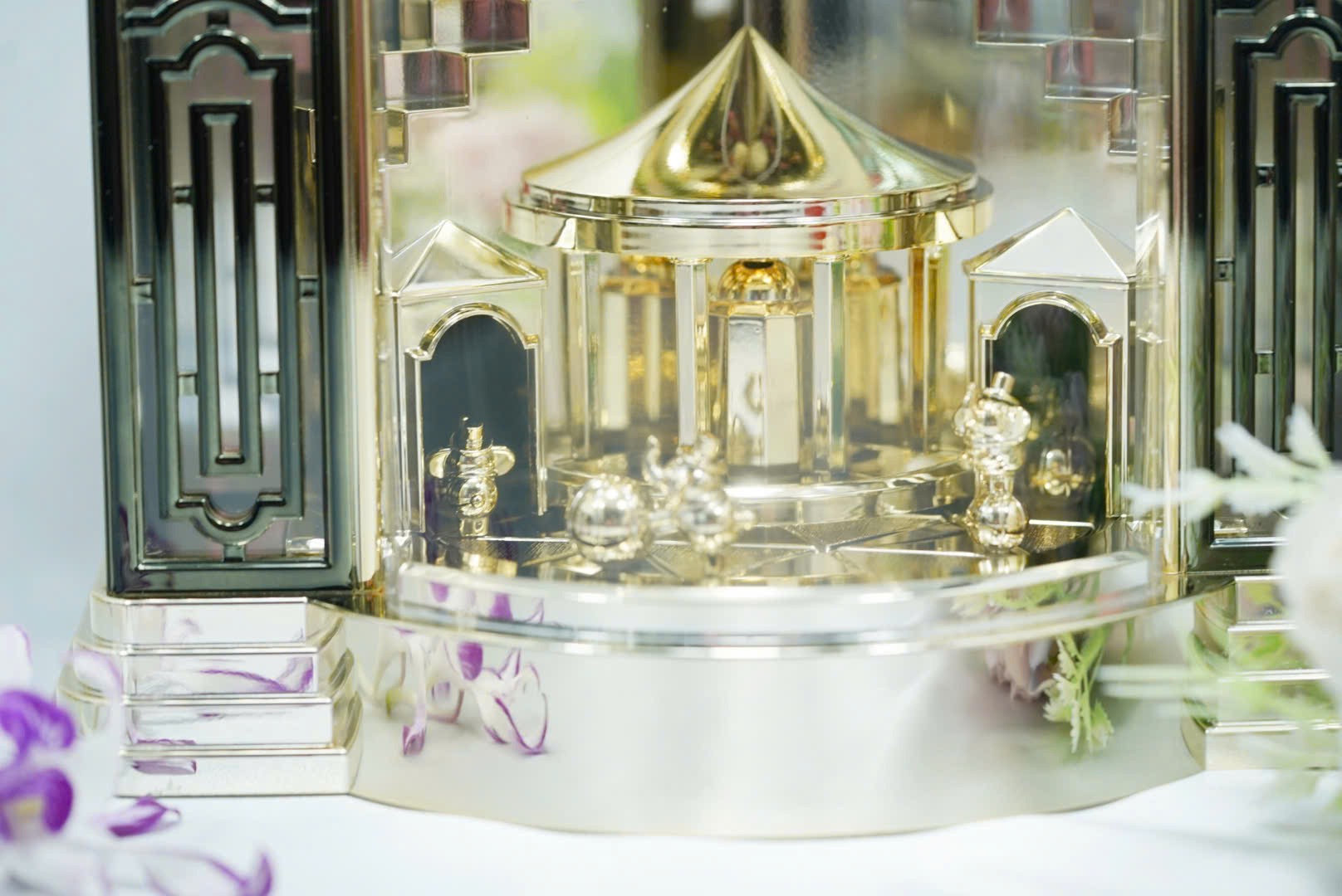 Phần quả lắc xoay trang trí bên dưới tạo hiệu ứng ánh sáng và chuyển động mềm mại, nổi bật khi trưng bày.