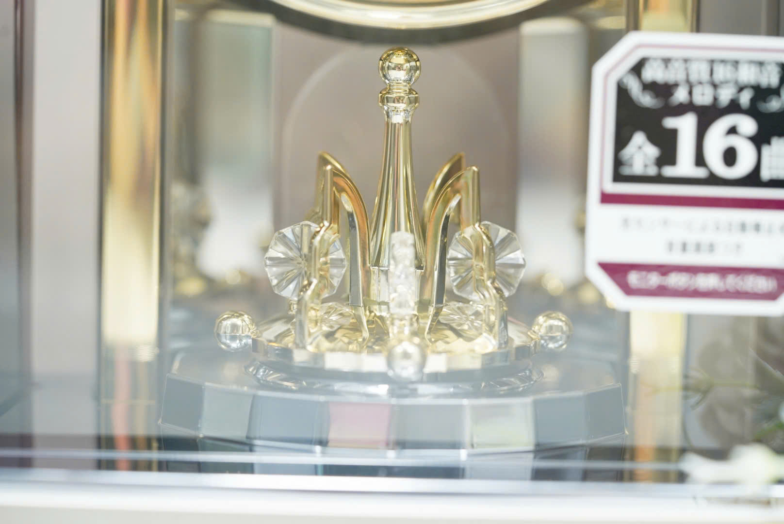 Cụm trang trí pha lê xoay bên dưới mặt đồng hồ tạo điểm nhấn nổi bật, phản chiếu ánh sáng đẹp mắt.