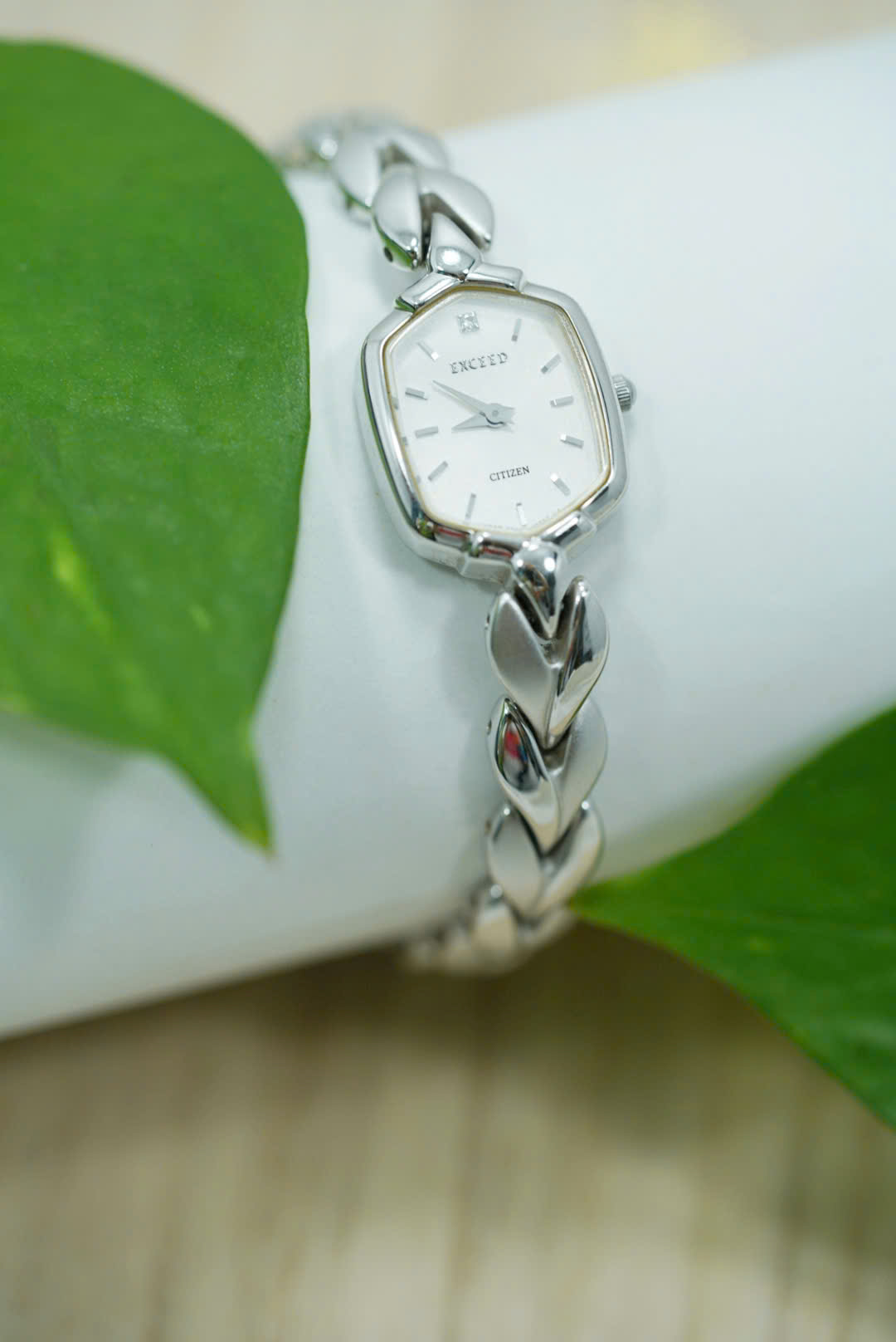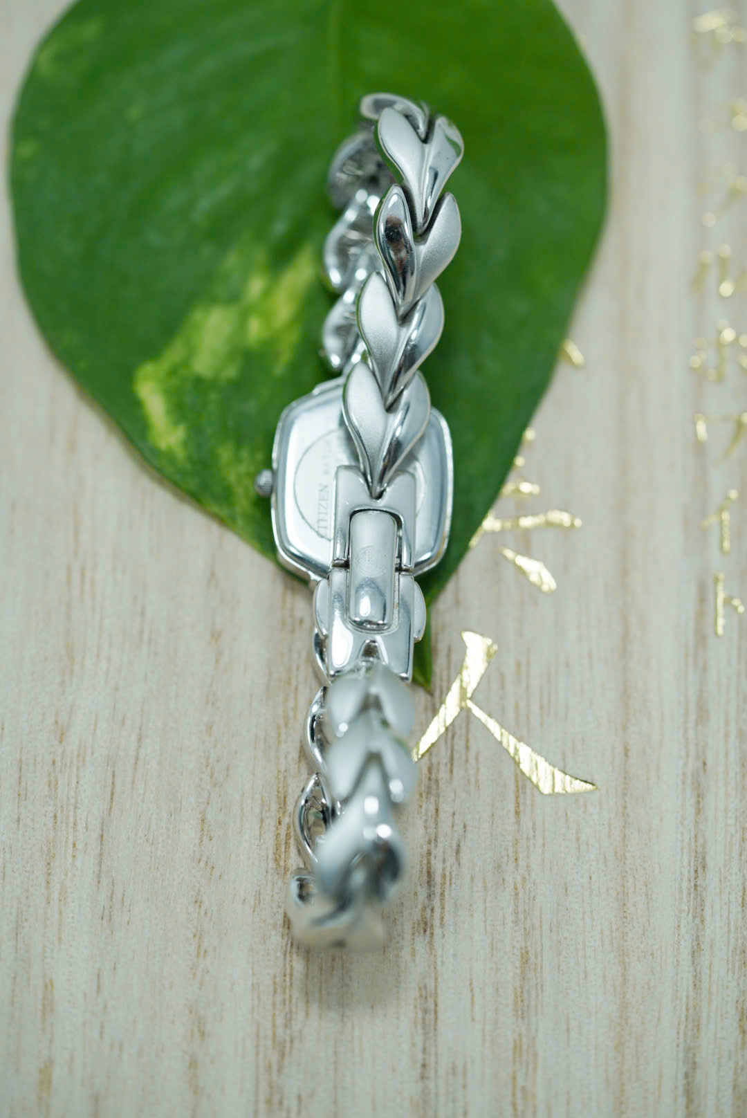 Dây đeo: Thiết kế mắt xích cách điệu hình lá mềm mại, chất liệu thép không gỉ mạ bạc sáng bóng, ôm cổ tay nhẹ nhàng như vòng trang sức.