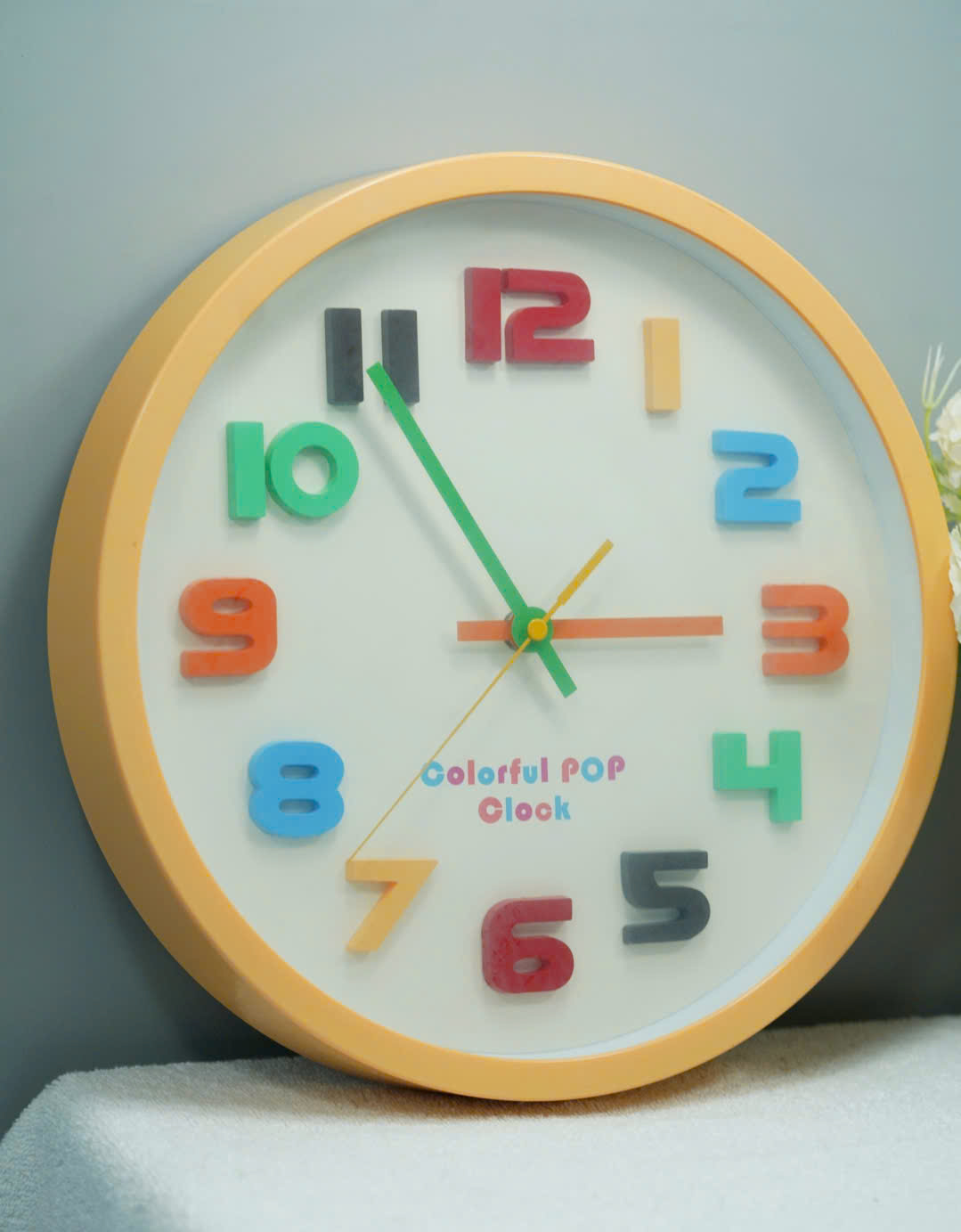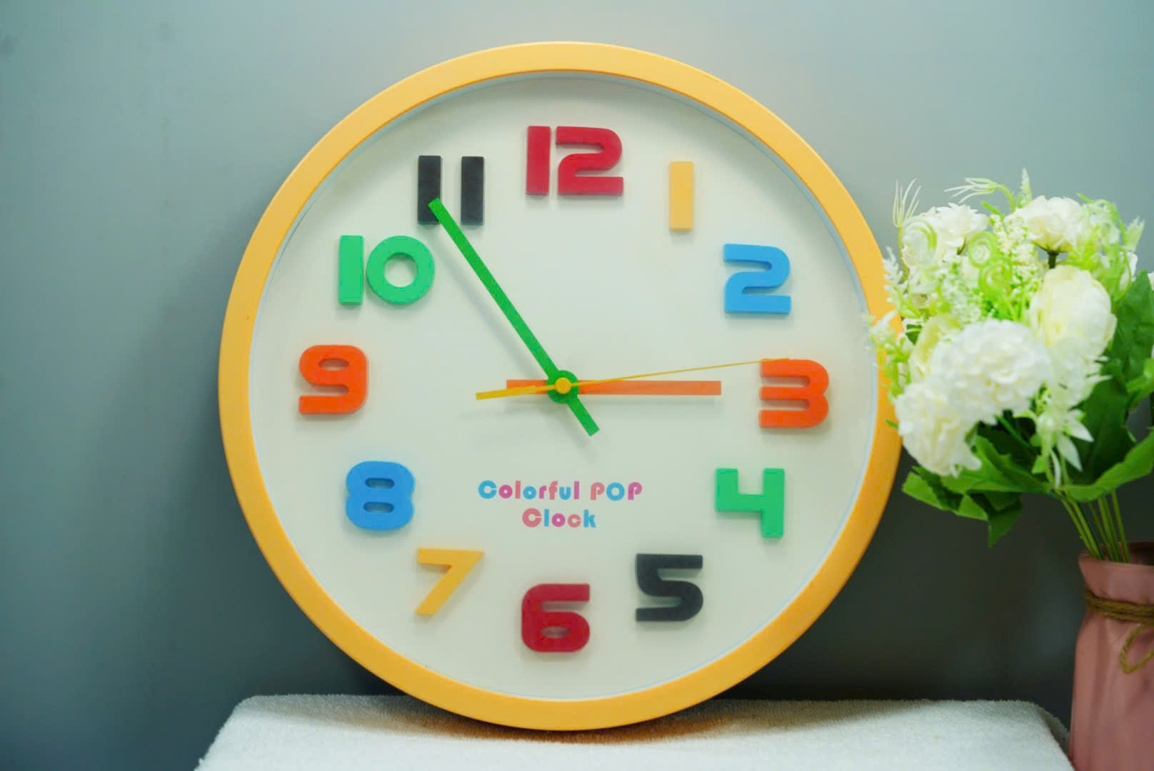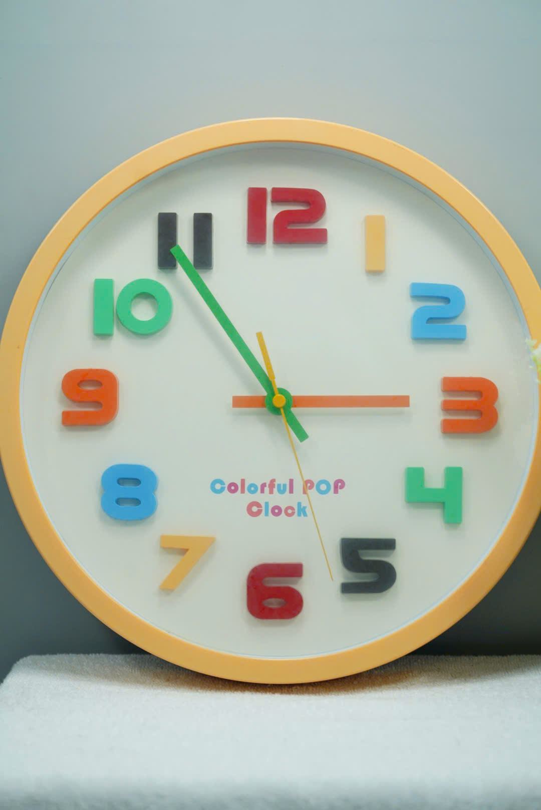 Mặt đồng hồ tròn nền trắng, điểm nhấn là các con số 3D nhiều màu sắc (đỏ, xanh, vàng, cam, đen) nổi bật và dễ nhìn.