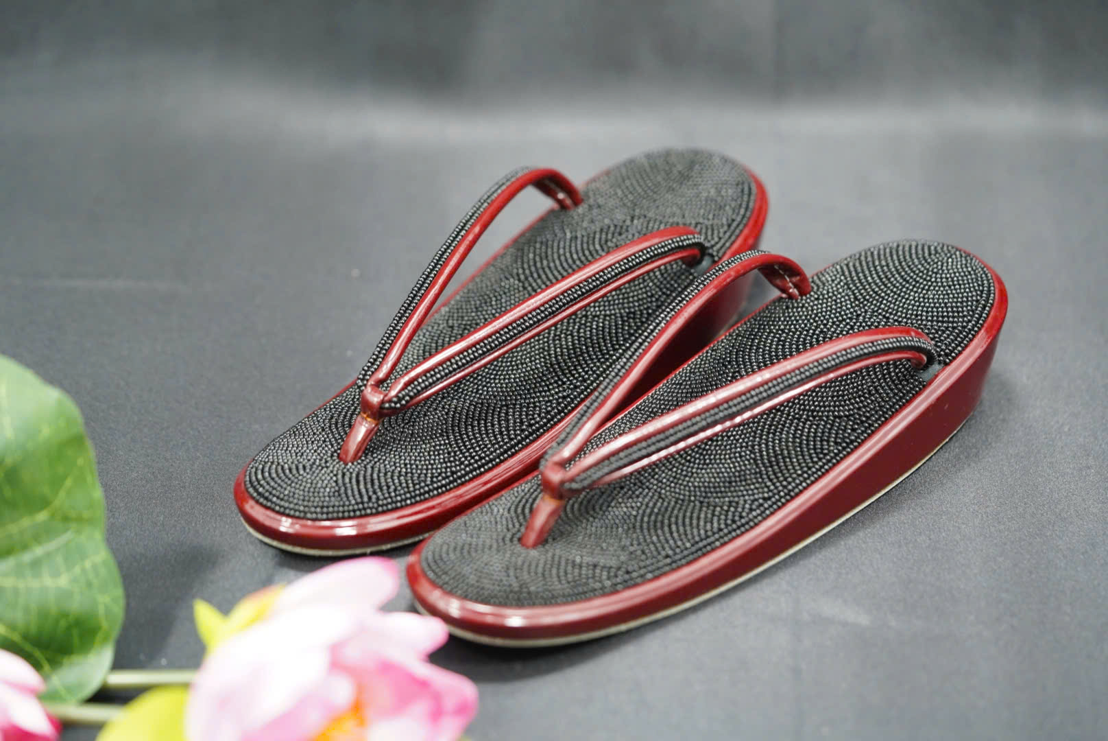 Quai guốc màu đỏ mận, dáng chéo đặc trưng phong cách Nhật, tạo cảm giác ôm chân và thẩm mỹ cao.