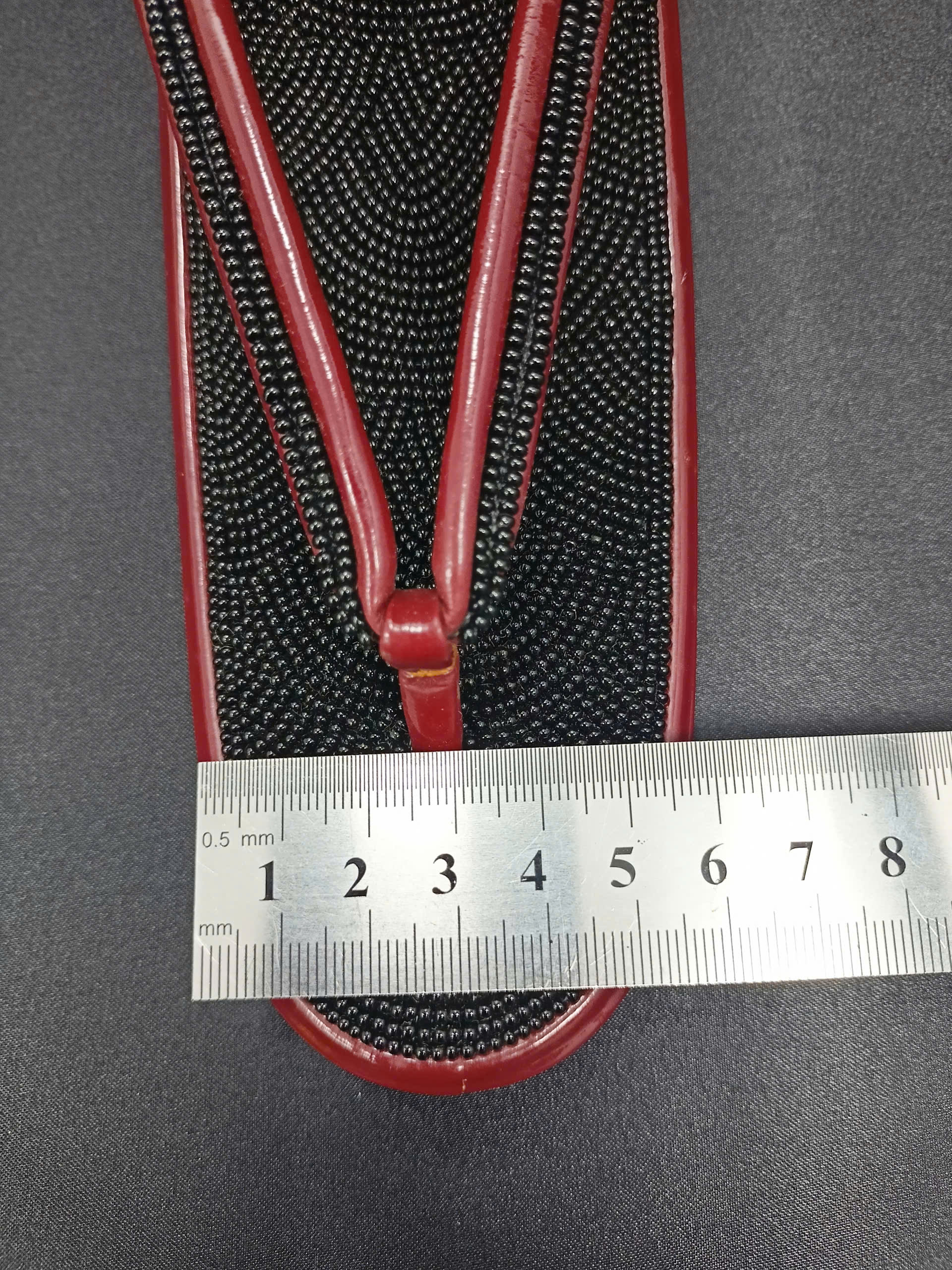 Phần viền guốc bo đỏ đồng bộ với quai, tạo tổng thể sang trọng và truyền thống.