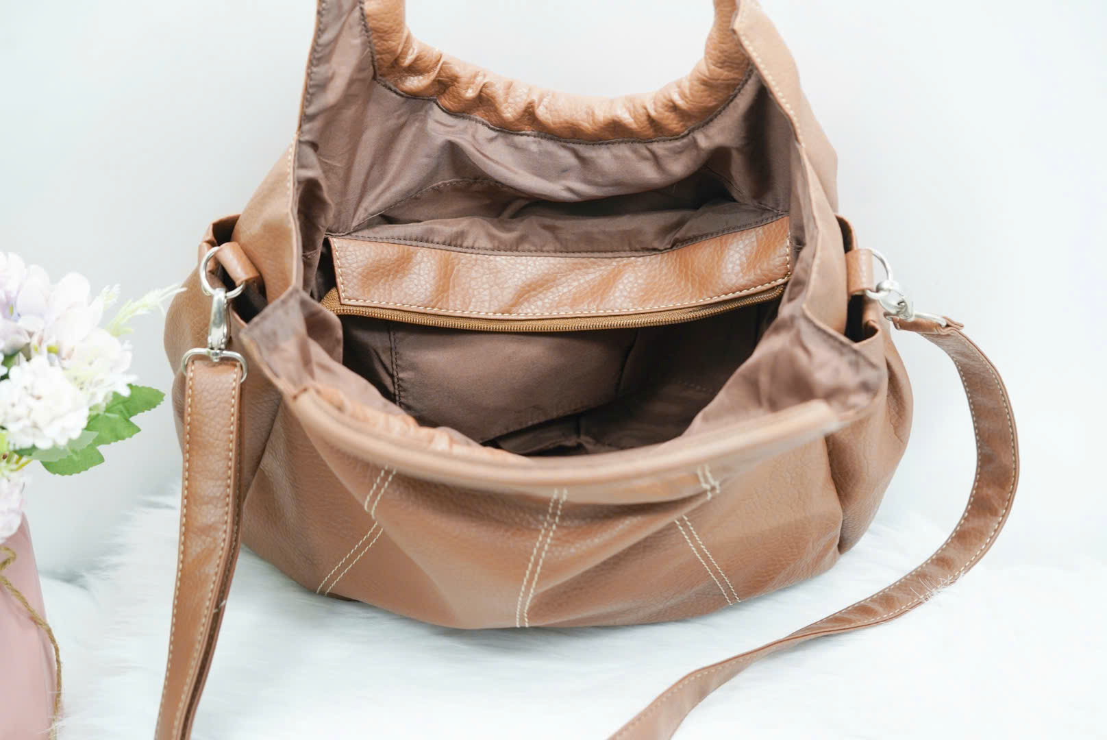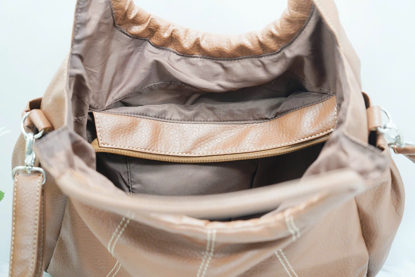 Lót trong vải dù dày dặn, màu nâu đồng bộ với tông túi, sạch và dễ bảo quản.