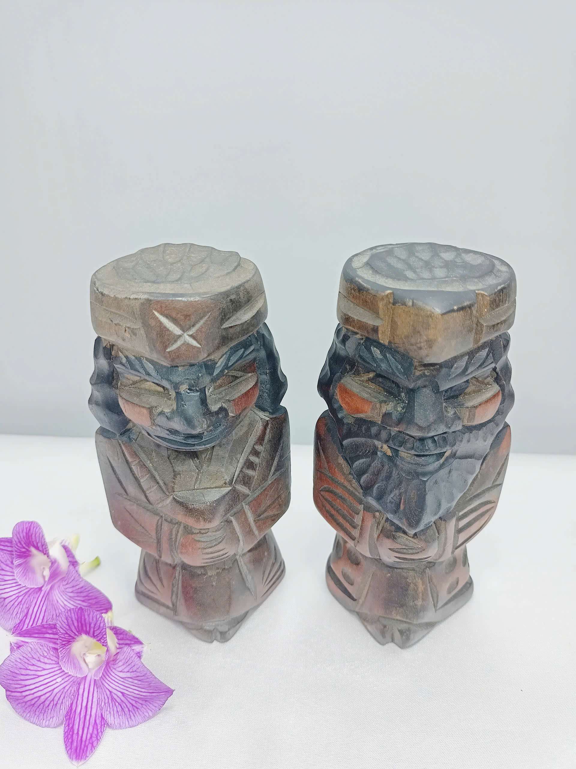 Đường nét khắc rõ ràng, biểu cảm khuôn mặt sinh động — một tượng nụ cười hiền hậu, một tượng vẻ uy nghi, tượng trưng cho âm – dương cân bằng, may mắn và bình an.