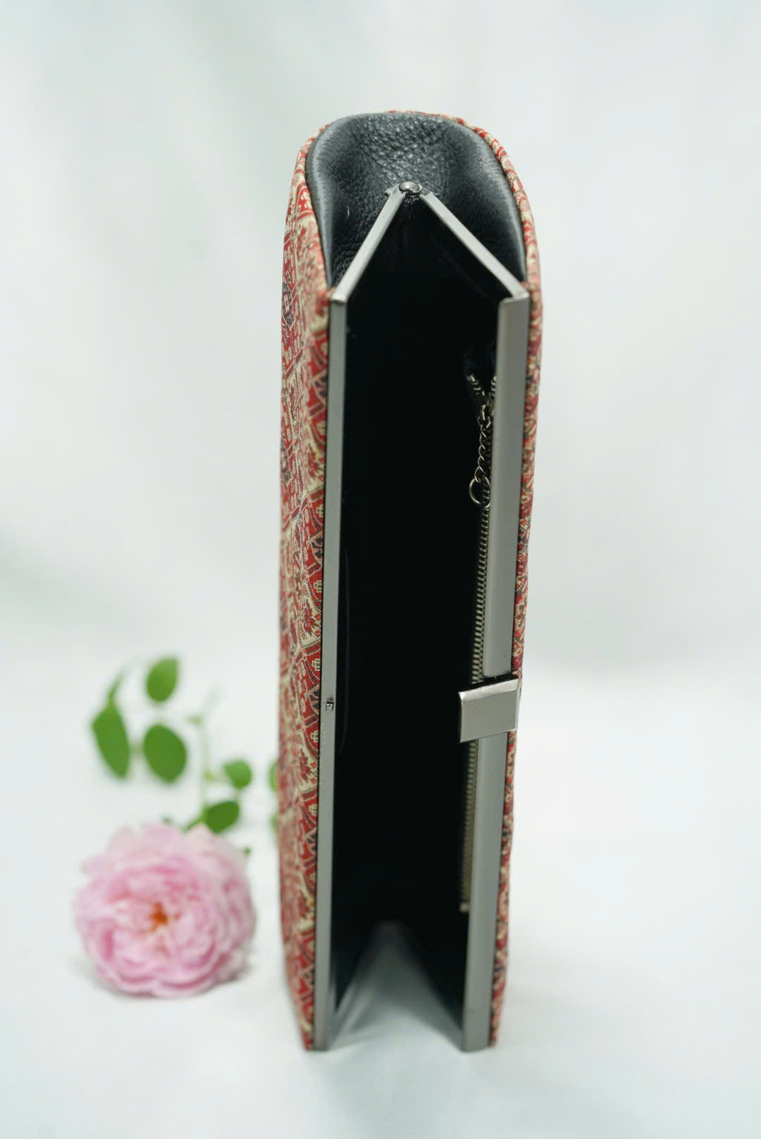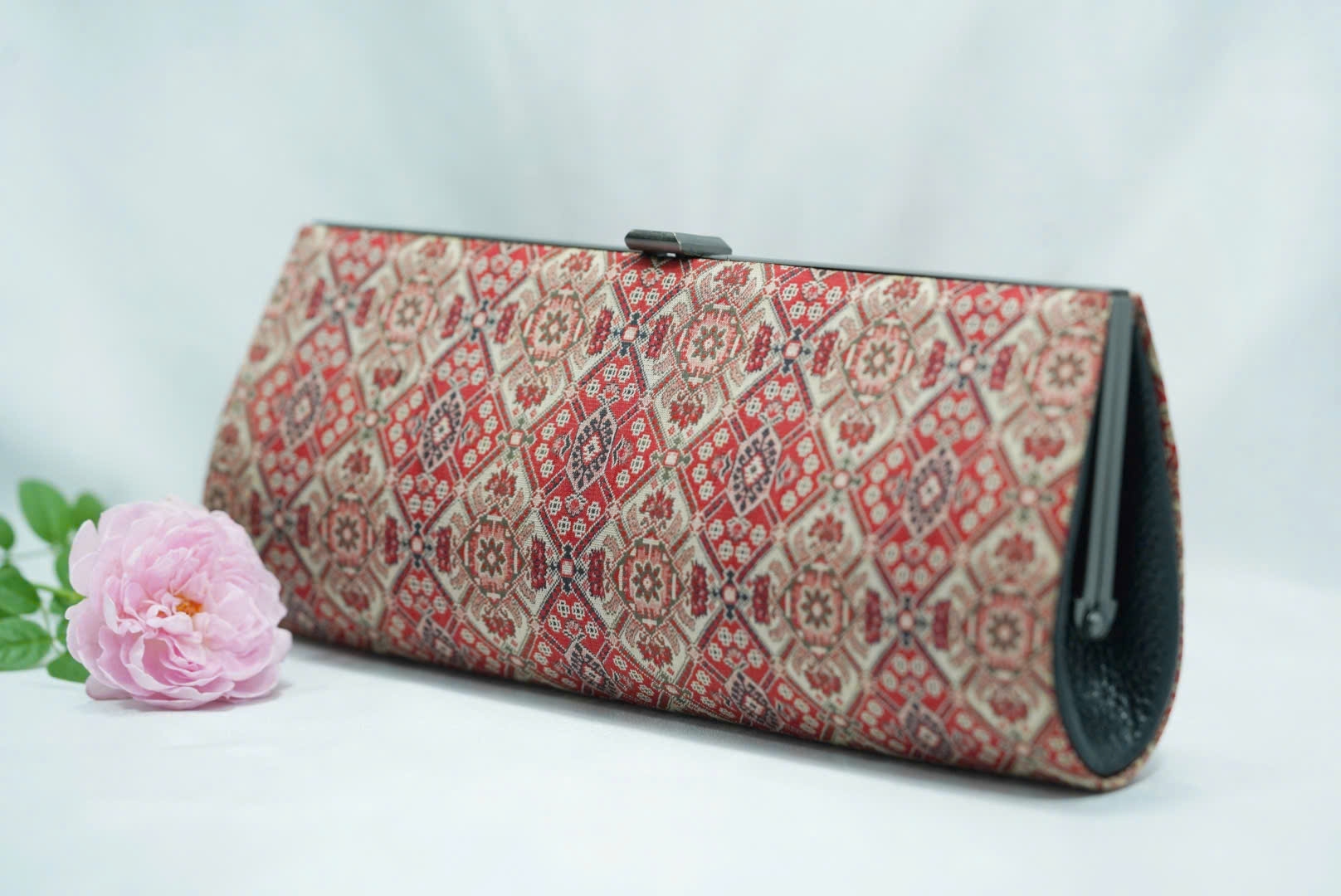 Chất liệu: Bề mặt ví là chất liệu vải dệt thổ cẩm với hoa văn cổ điển tông đỏ – be sang trọng; phần viền và nội thất bên trong sử dụng chất liệu da, cầm chắc tay, bền và giữ form tốt.