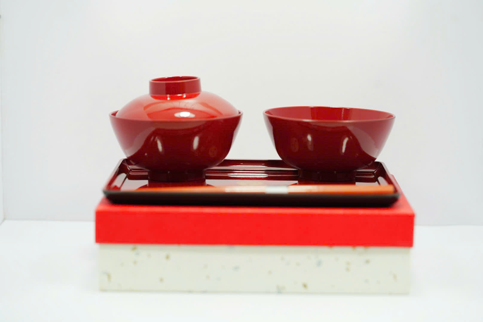 Bộ sơn mài si Nhật BGS66 gồm 1 khay, 2 tô, và 1 đôi đũa, đồng bộ về màu sắc và phong cách. Toàn bộ sản phẩm được chế tác từ nhựa sơn mài Nhật, phủ nhiều lớp sơn bóng mịn, tạo nên hiệu ứng ánh đỏ rực rỡ – biểu tượng cho may mắn, phú quý và tinh tế trong văn hóa Nhật Bản.
