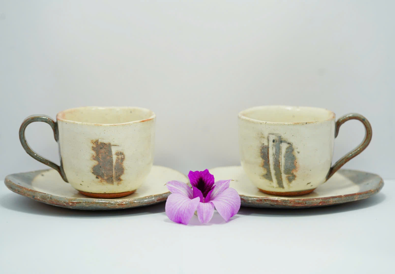 Tạo hình thủ công độc bản – Ly có miệng gợn nhẹ, tay cầm uốn cong tự nhiên, đĩa hình bầu méo nhẹ, thể hiện tinh thần tự do của nghệ nhân gốm.