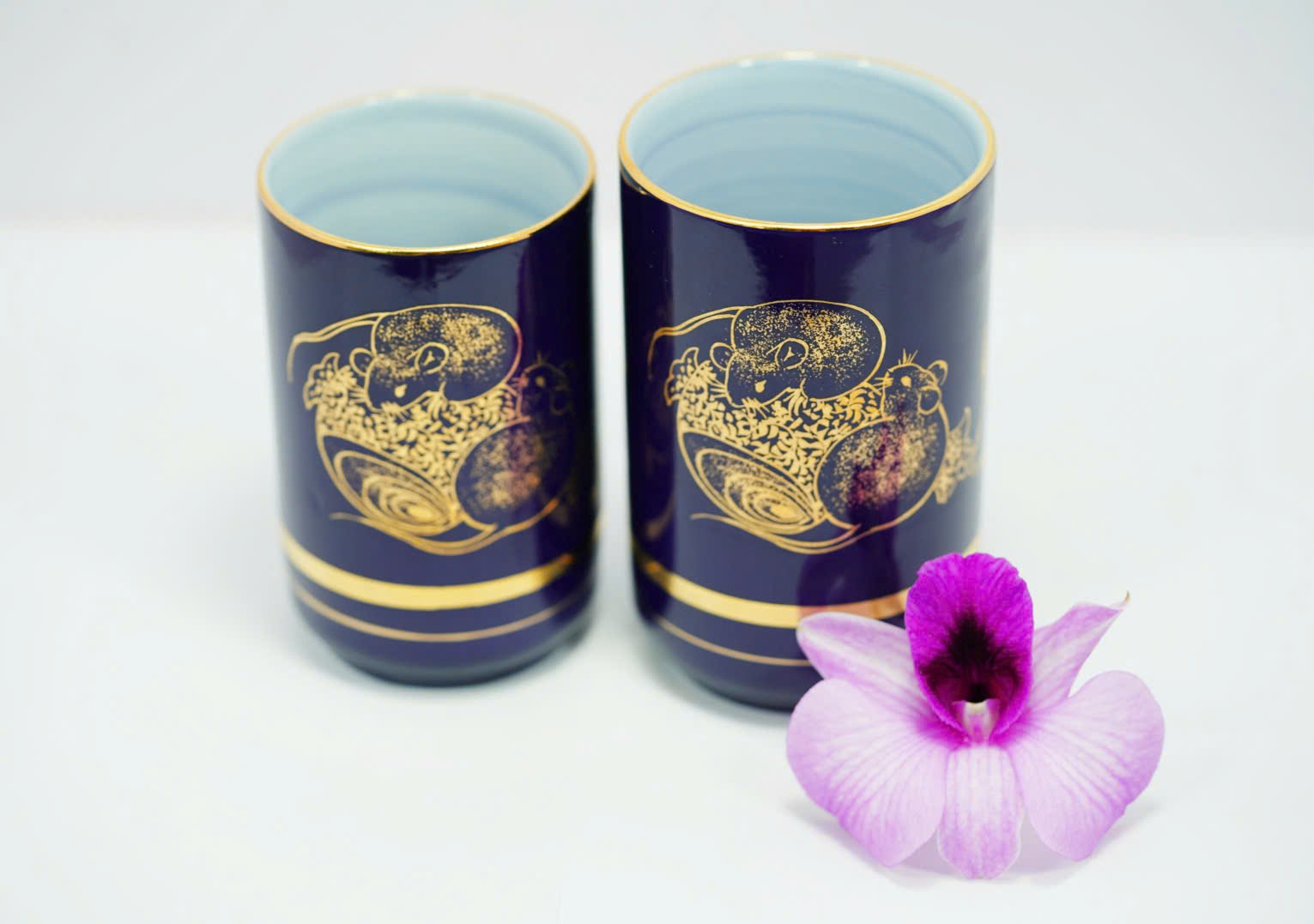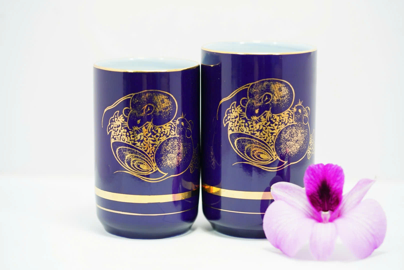 🌸Bộ ly gốm sứ Nhật BGS78 gồm hai ly thủ công tinh xảo, được chế tác từ gốm sứ cao cấp Nhật Bản. Nền men xanh lam đậm sang trọng, điểm nhấn là họa tiết chuột vàng – biểu tượng của sự thông minh, nhanh nhạy và tài lộc trong văn hóa Á Đông. Mỗi ly được tô điểm bằng đường viền vàng ánh kim tinh tế, thể hiện phong cách đẳng cấp và tinh tế.