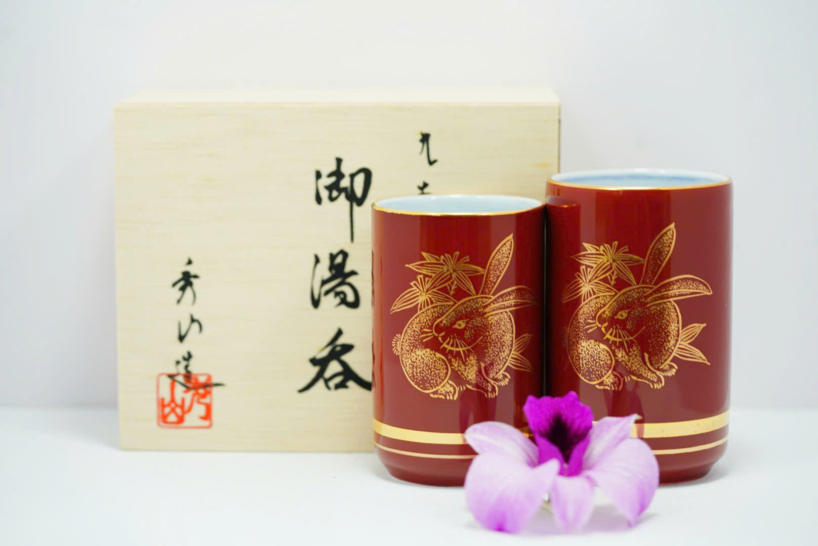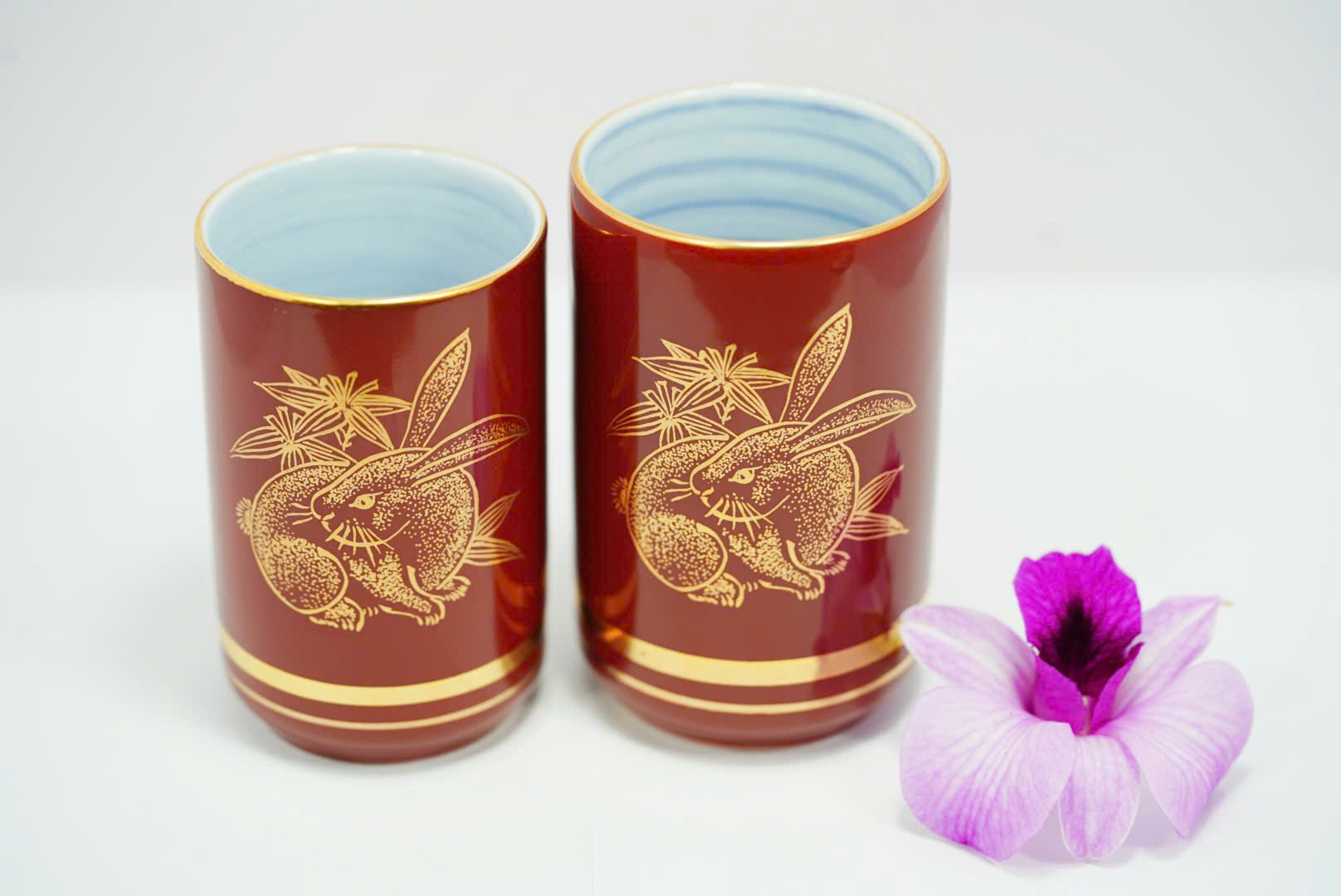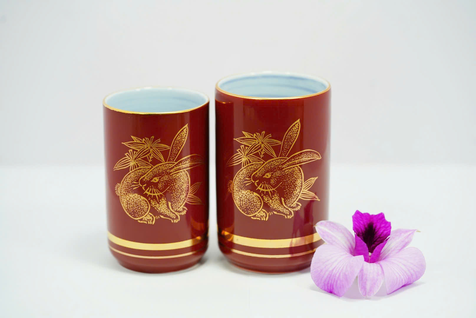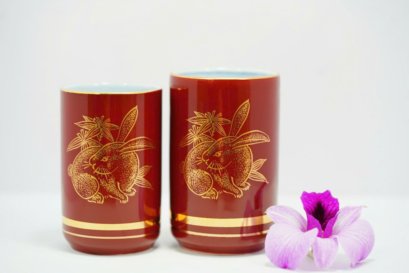 🌸 Bộ ly gồm hai ly gốm sứ cao cấp nhập khẩu từ Nhật Bản, được chế tác tinh xảo với nền men đỏ sẫm sang trọng, điểm nhấn là họa tiết thỏ vàng tượng trưng cho bình an, may mắn và tài lộc. Đường viền vàng ánh kim tạo nên vẻ quý phái, thích hợp cho cả sử dụng hằng ngày lẫn trưng bày nghệ thuật.