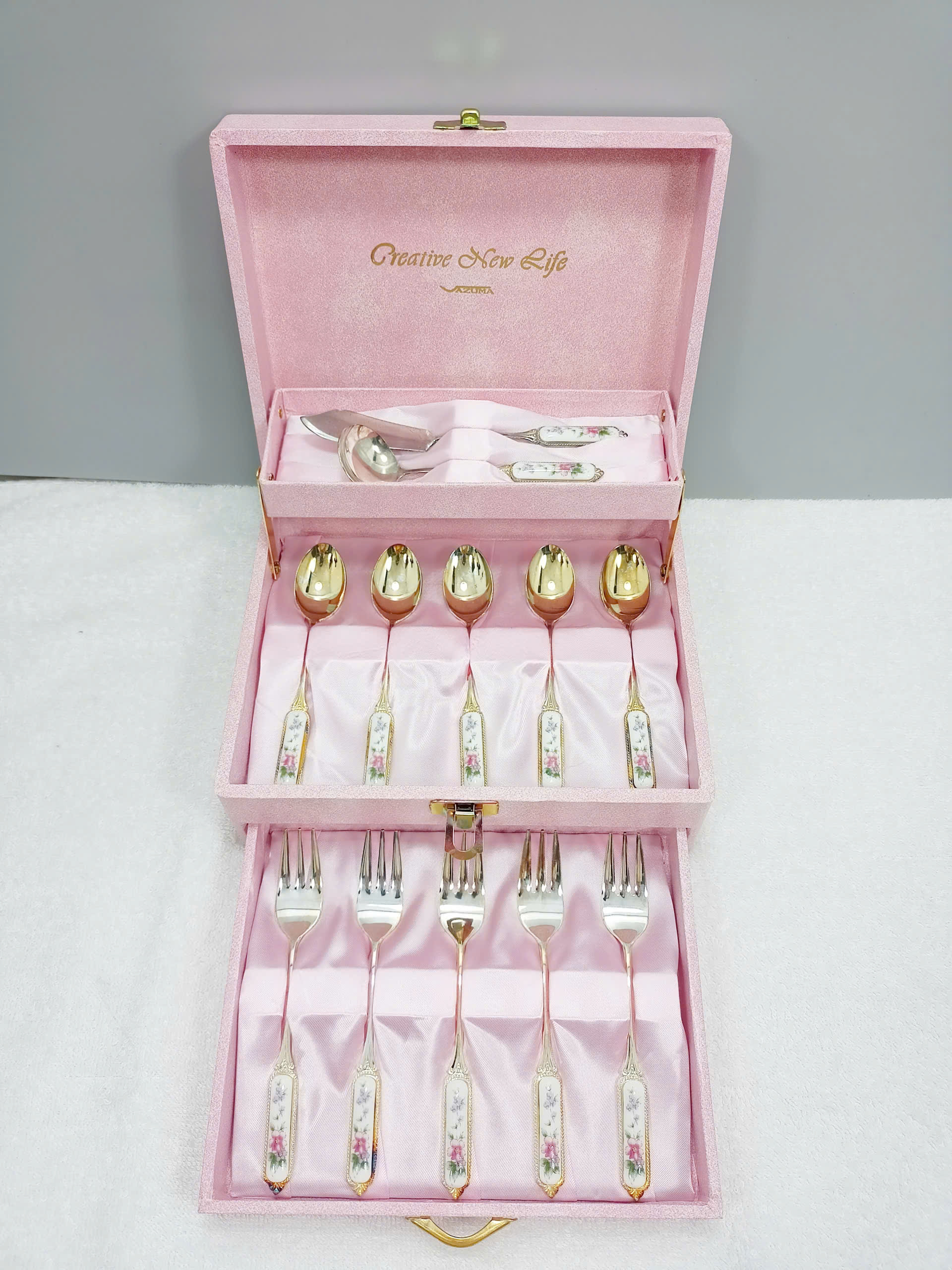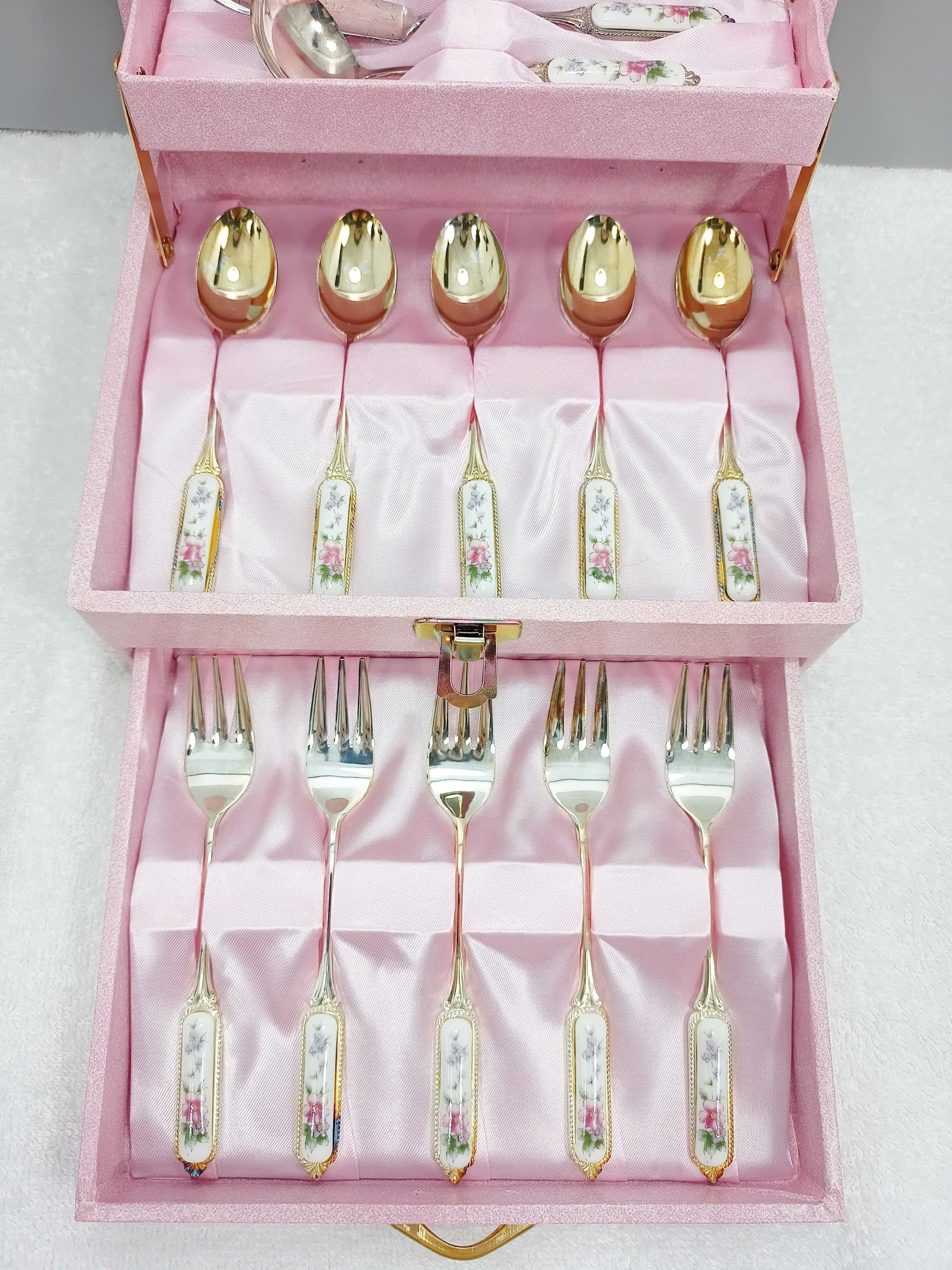 Bộ muỗng nĩa si Nhật CBHM1 là sản phẩm được thiết kế tinh tế, sang trọng theo phong cách hoàng gia châu Âu, kết hợp cán sứ họa tiết hoa hồng thanh lịch và đầu muỗng, nĩa, dao inox mạ vàng sáng bóng.