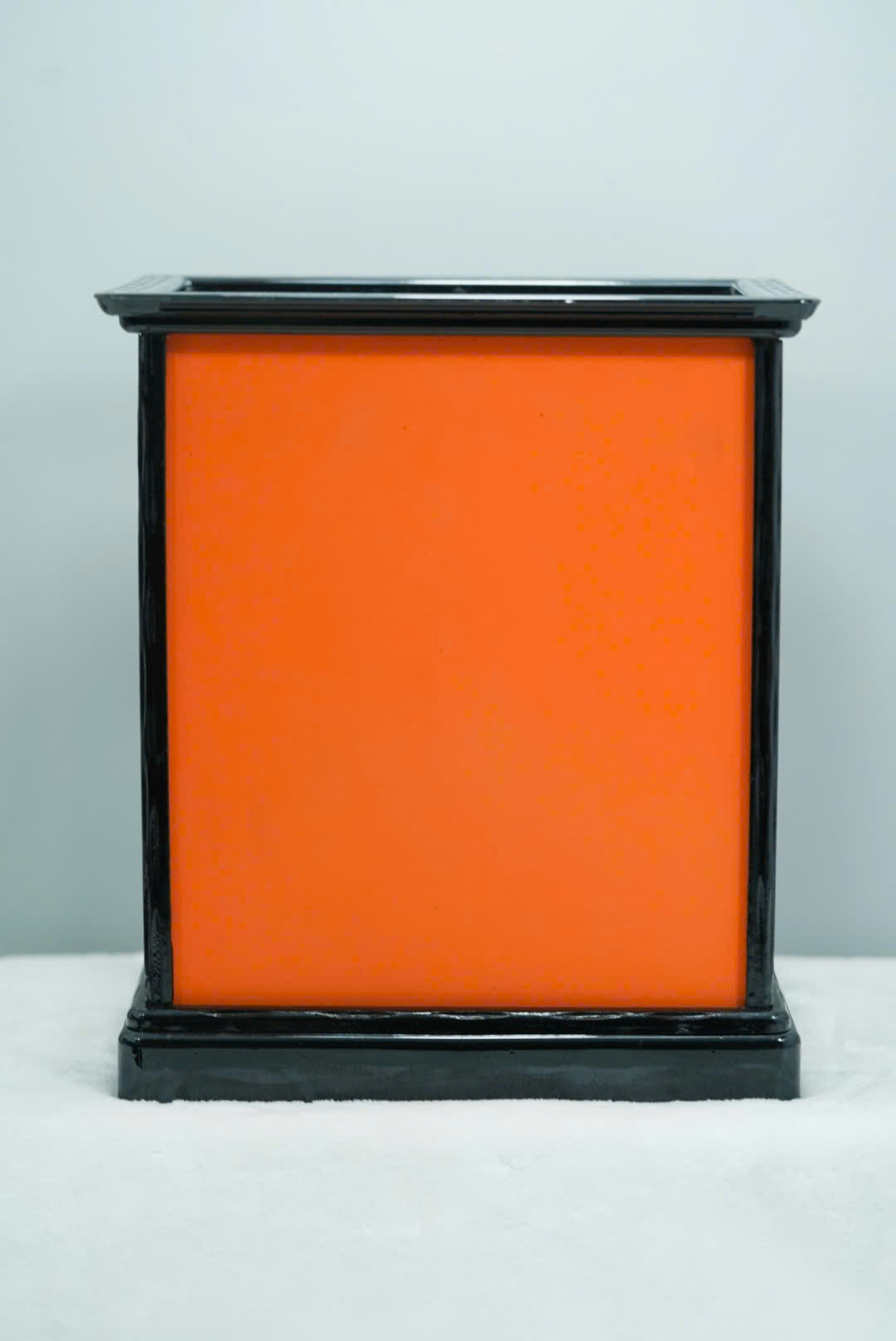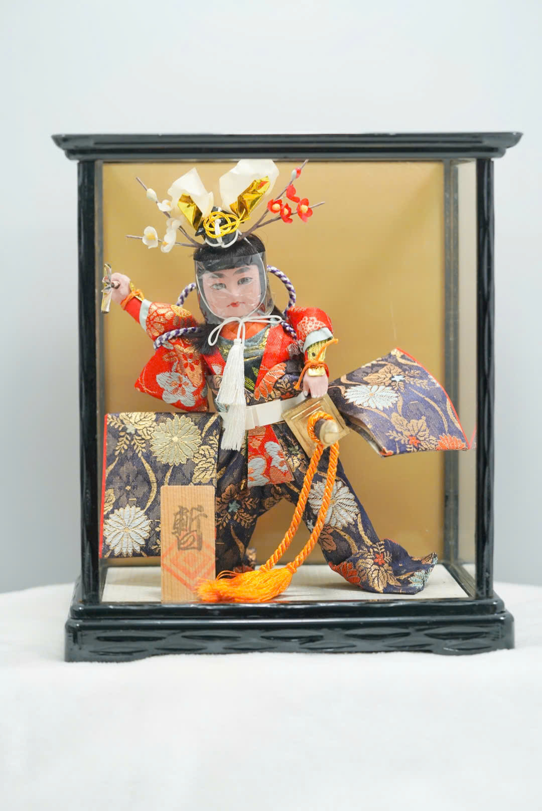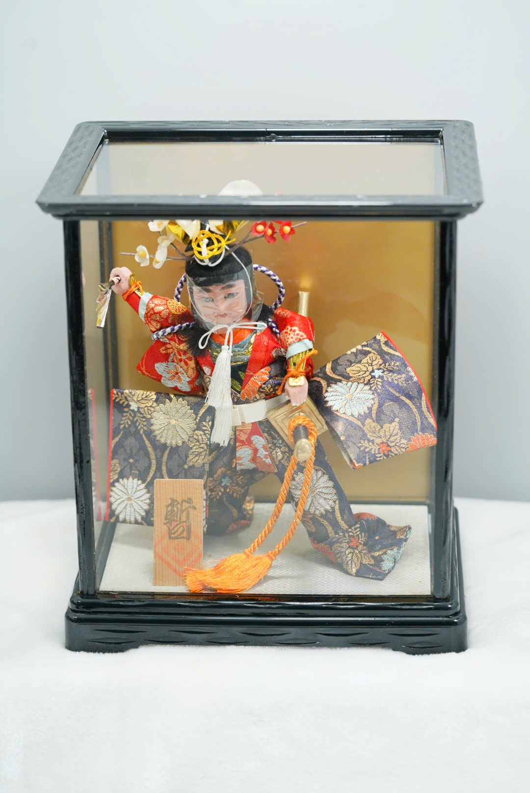 Chất liệu: Gỗ, vải gấm Nhật, nhựa tổng hợp, dây lụa, hộp kính mica khung gỗ sơn đen.