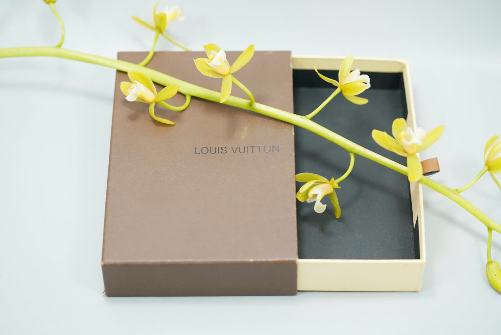 Chất liệu hộp cứng cáp, bề mặt màu nâu đặc trưng, logo LV in rõ nét.