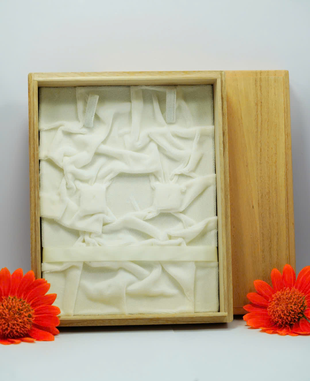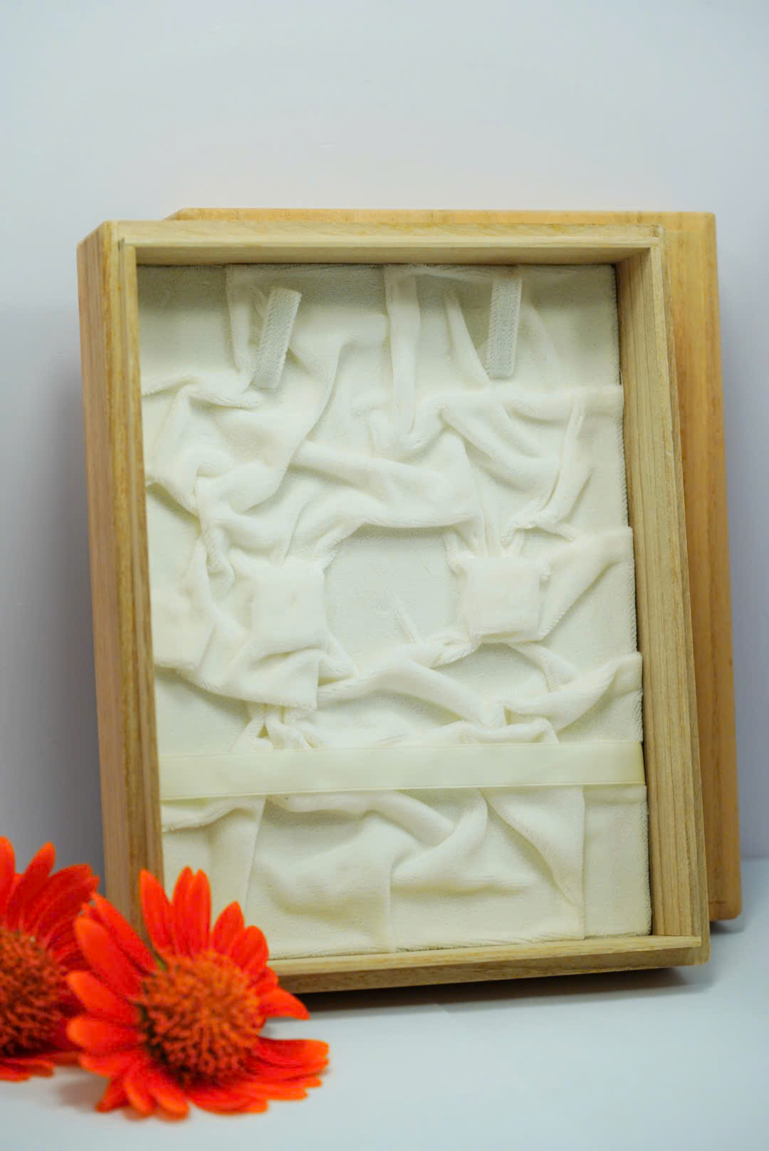 Bên trong: Lót nhung trắng mềm mịn, có nhiều khe giữ và dây cố định, giúp bảo quản trang sức hoặc kỷ vật an toàn.