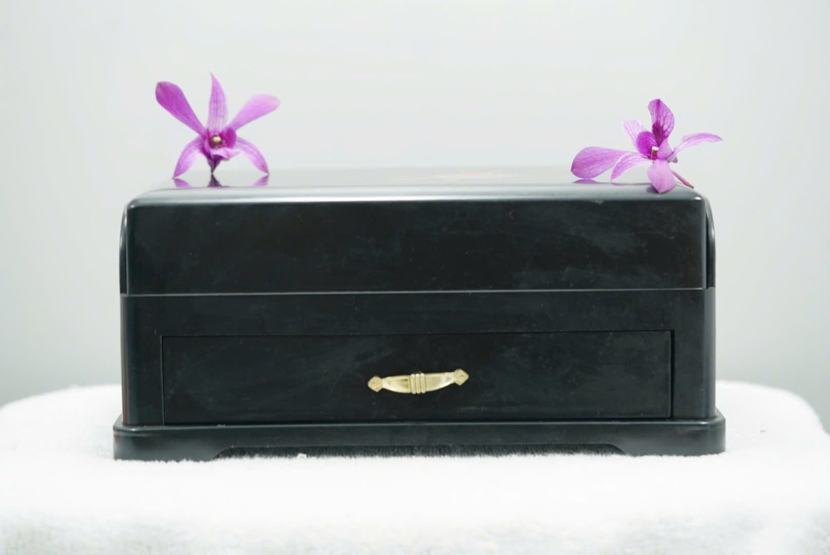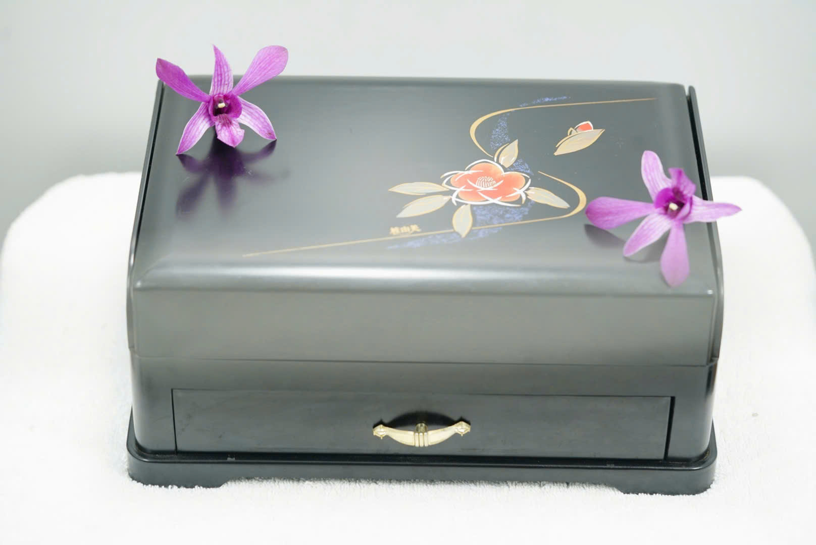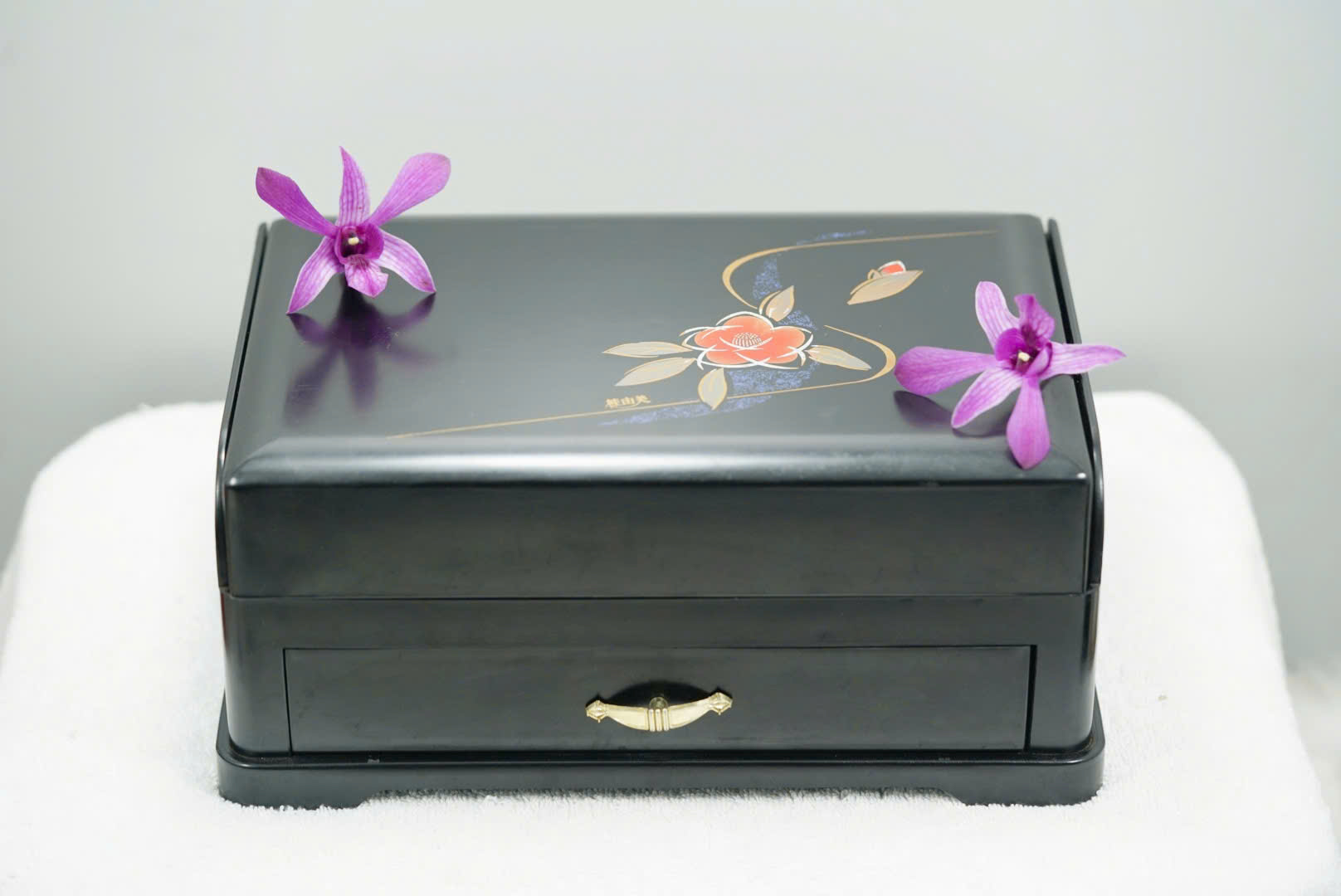 Hộp trang sức sơn mài với nền đen bóng huyền bí, được trang trí bằng họa tiết hoa đỏ phối vàng ánh kim mang đậm nét nghệ thuật Nhật Bản.