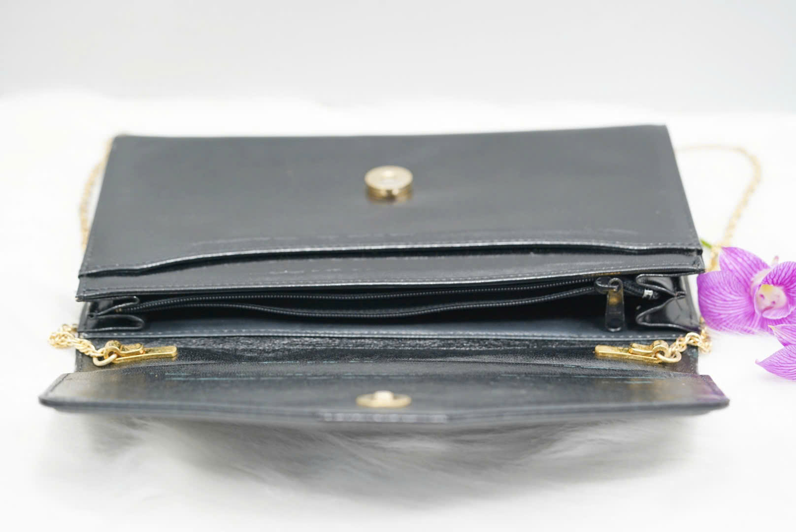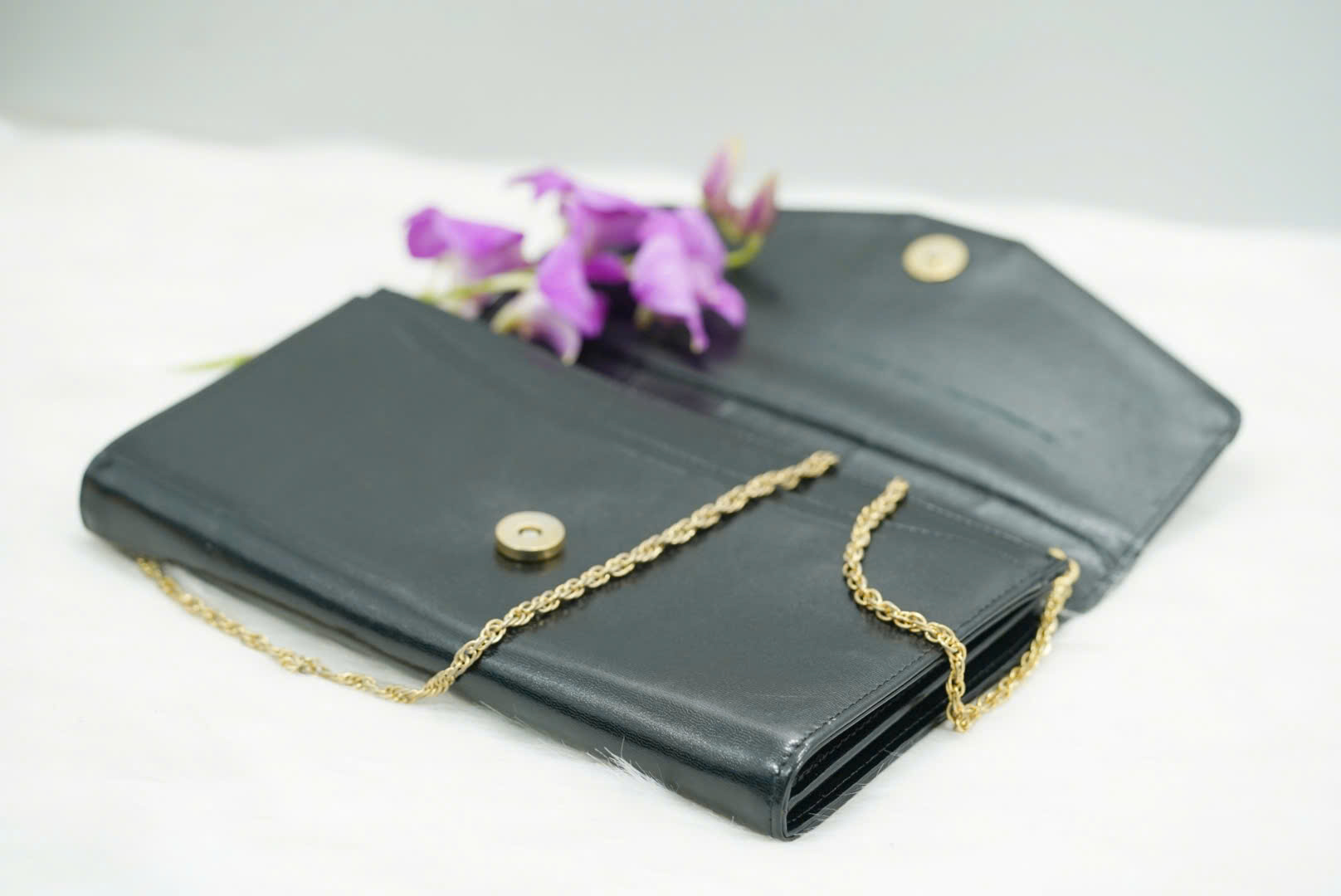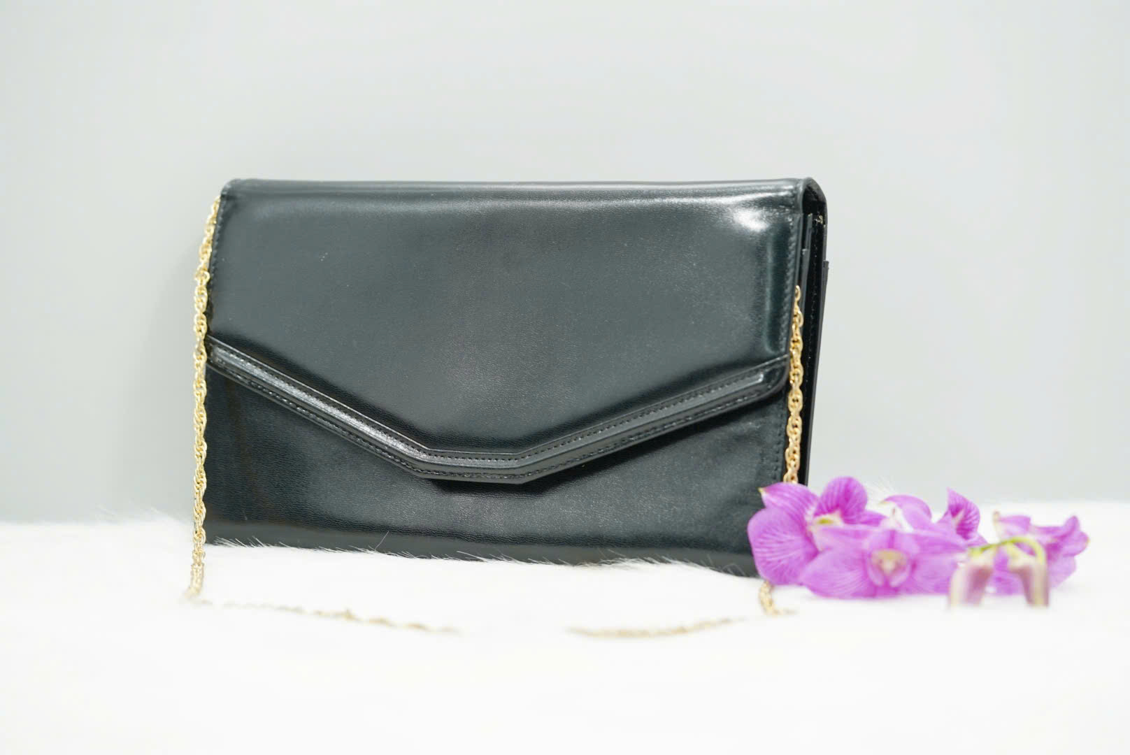Túi dạng hộp chữ nhật mỏng, nắp gập hình tam giác độc đáo, khóa bấm kim loại chắc chắn.