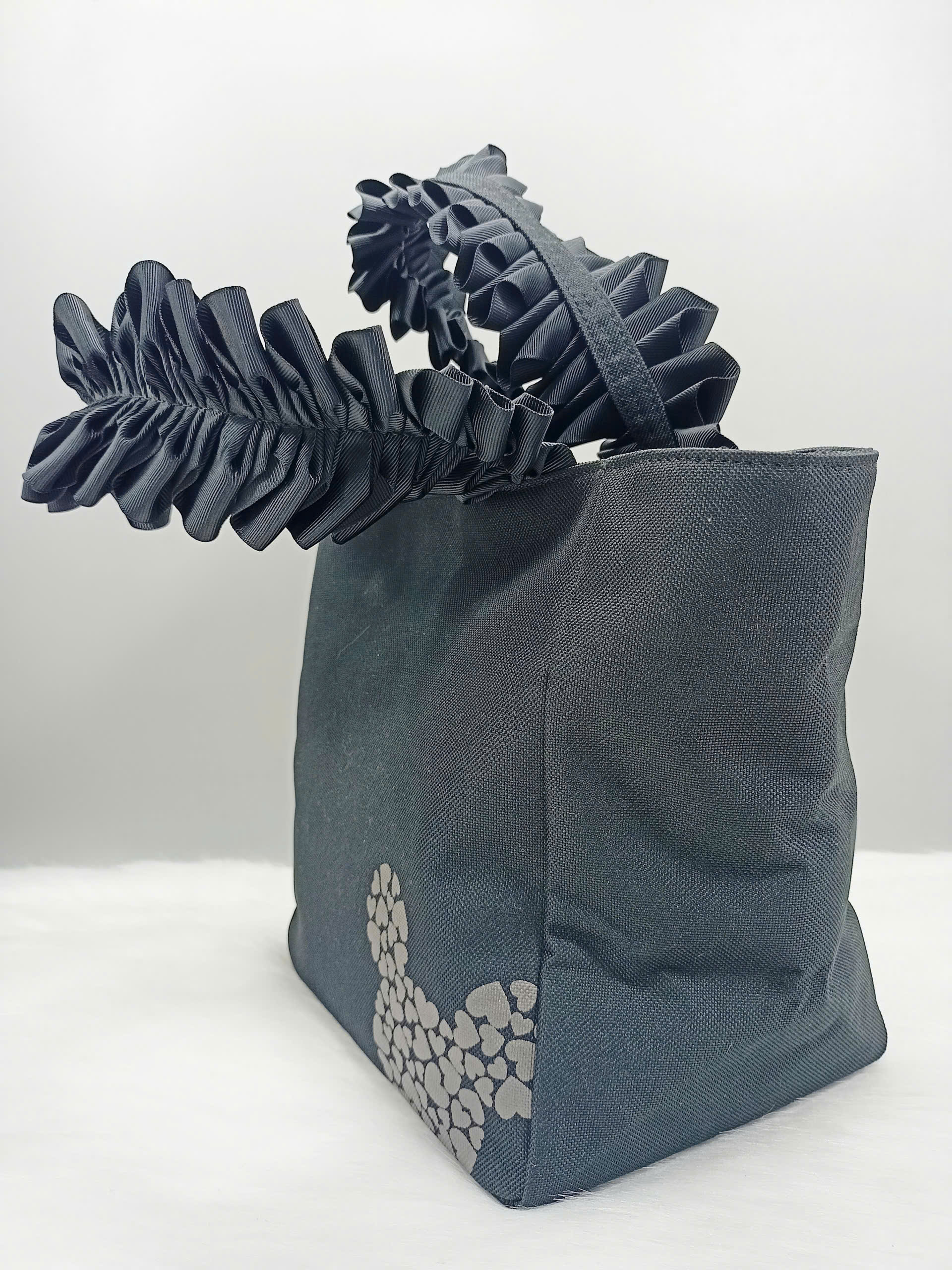 Mặt trước túi được in hình chuột Mickey cách điệu bằng họa tiết trái tim nhỏ xếp lại, vừa đáng yêu vừa sang trọng, phù hợp với phong cách trẻ trung, hiện đại.
