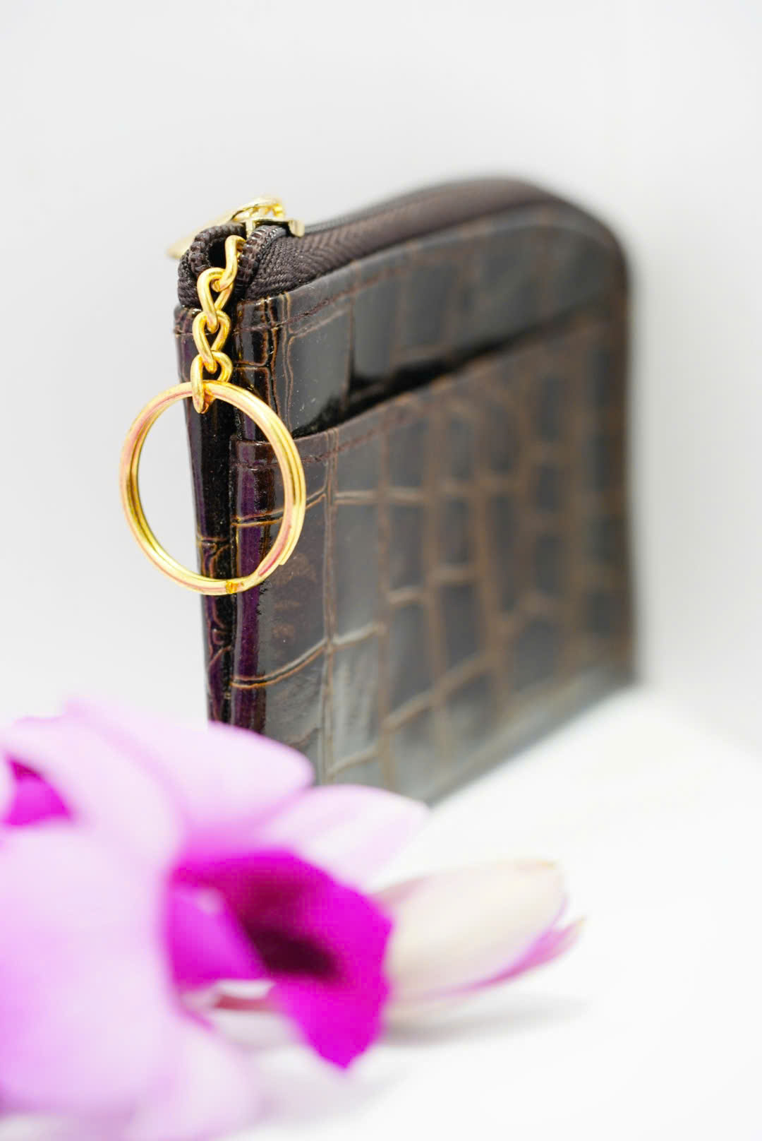 Ví có thêm móc khóa kim loại màu vàng sang trọng, có thể gắn vào chìa khóa xe, balo hoặc túi xách, vừa tiện lợi vừa tạo điểm nhấn tinh tế.