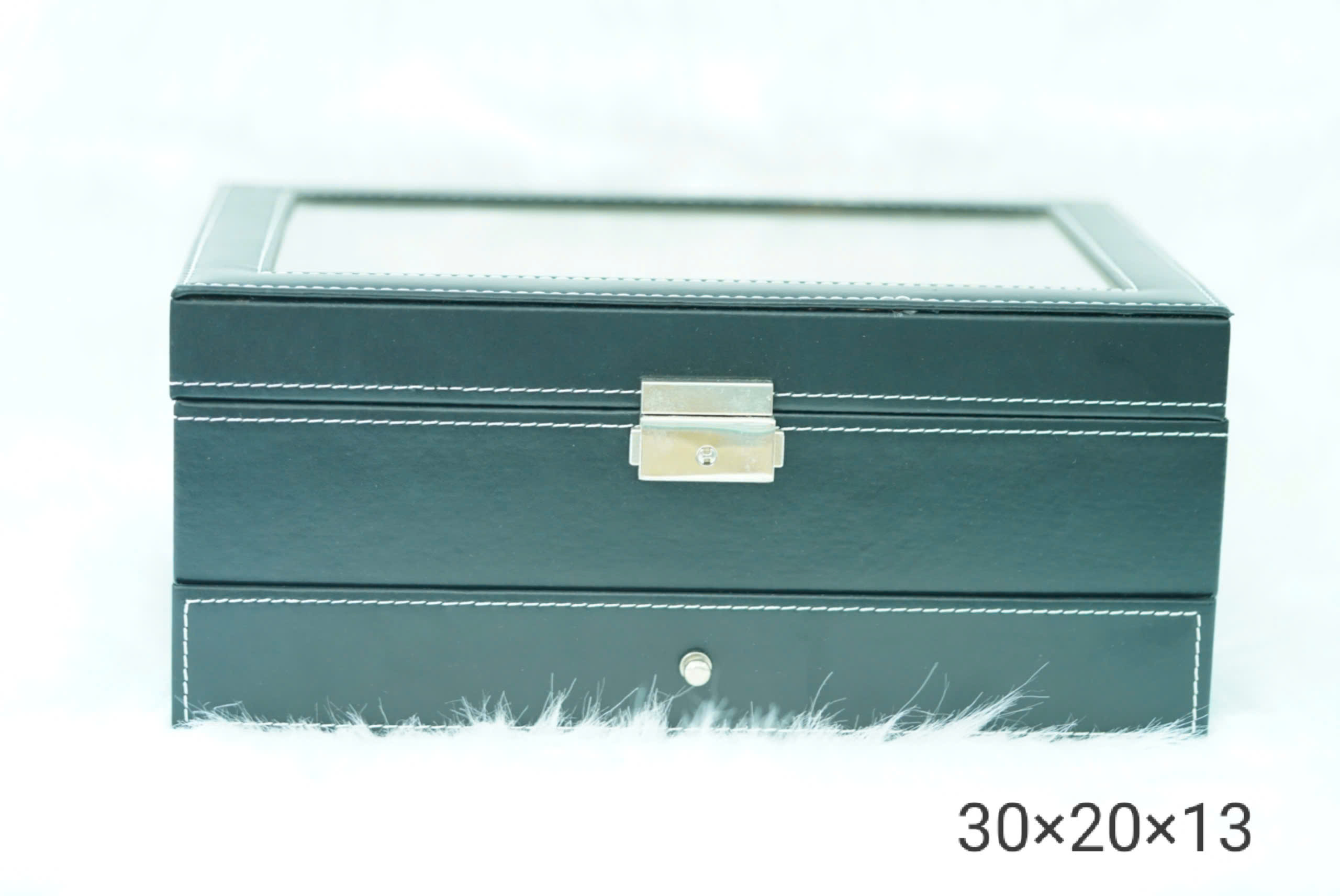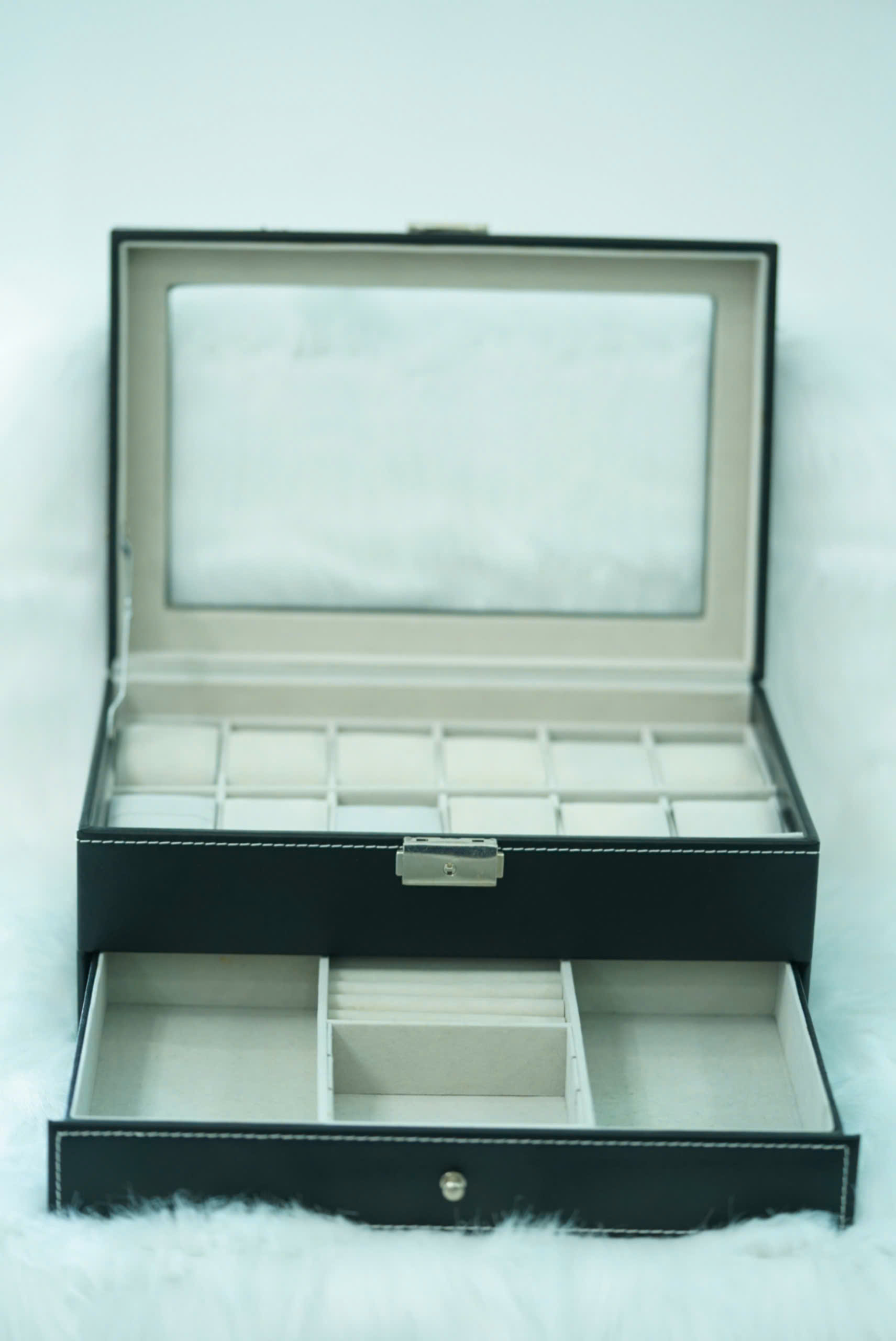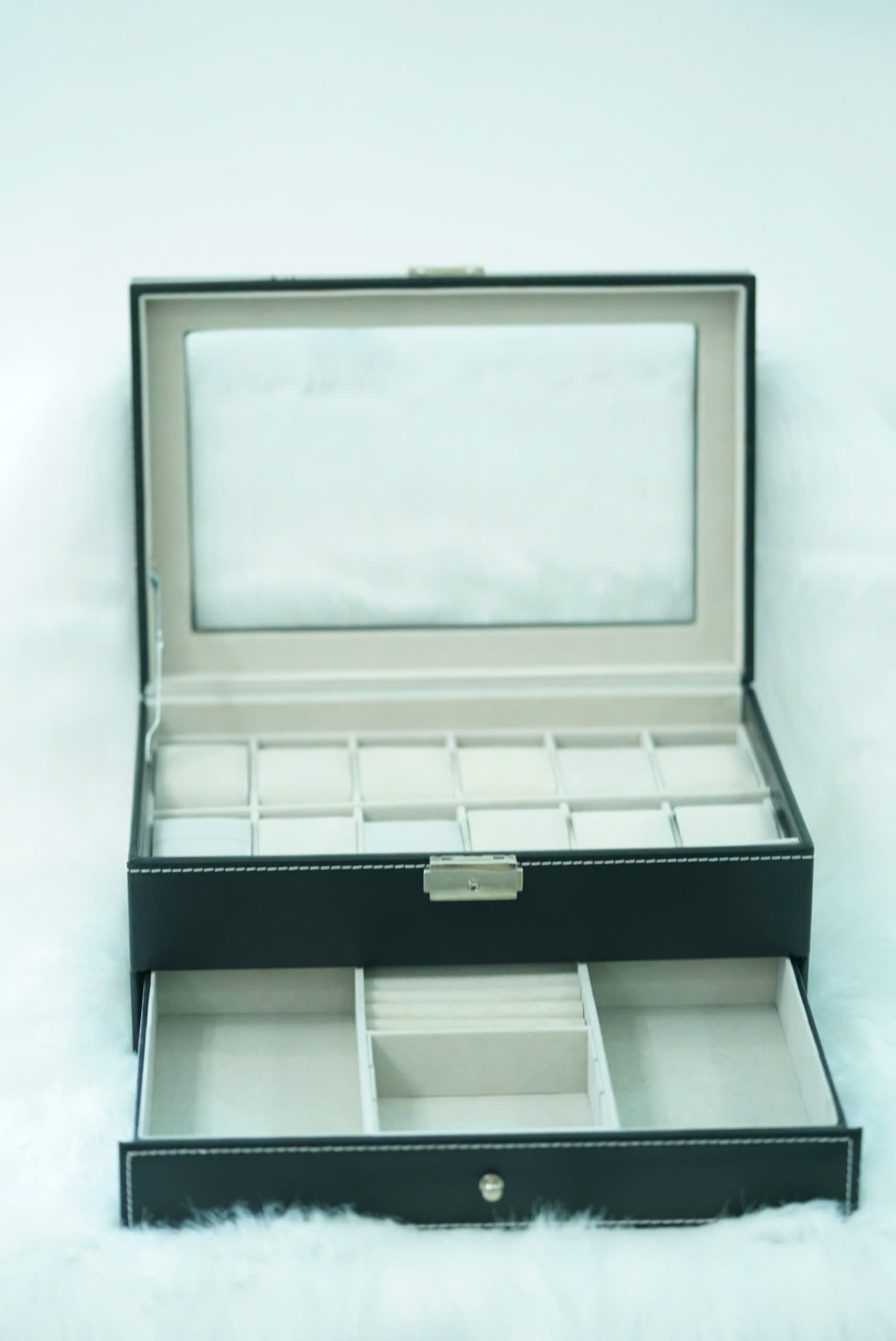 Nắp hộp có kính trong suốt, giúp dễ dàng quan sát bộ sưu tập đồng hồ bên trong.