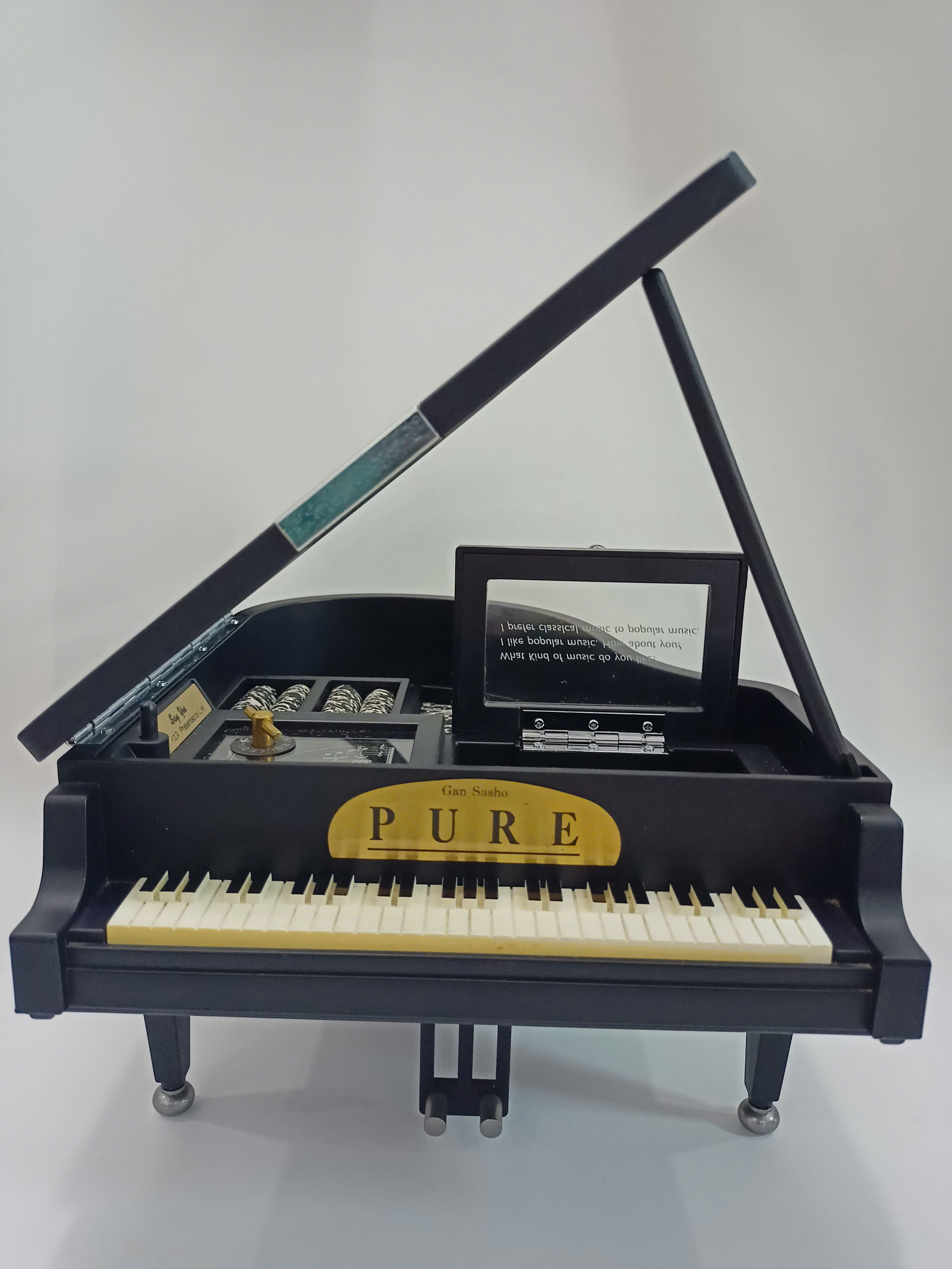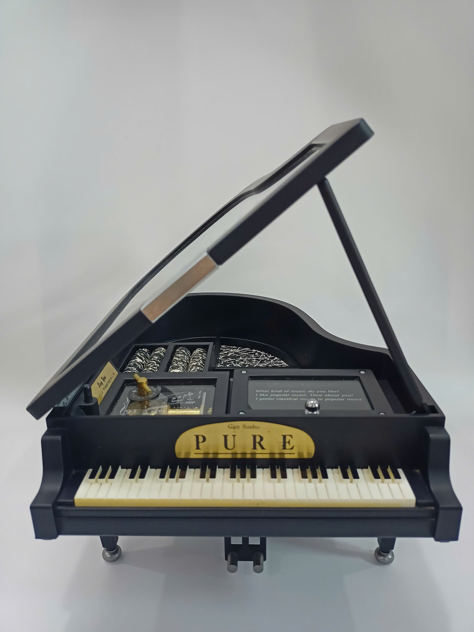 Thiết kế ấn tượng: Hộp trang sức được chế tác tinh xảo theo hình dáng đàn piano cánh lớn, mang phong cách cổ điển nhưng hiện đại. Màu đen sang trọng kết hợp với chi tiết nhãn gỗ in chữ PURE – Gan Sasho nổi bật.