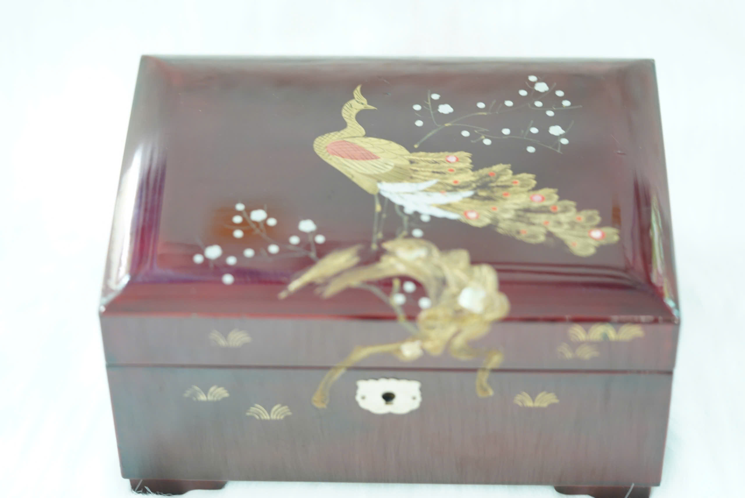 Trên nắp hộp được trang trí họa tiết chim công dát vàng, đậu trên cành hoa mai trắng, điểm thêm chi tiết nhũ vàng và sơn thủ công tinh tế, mang đậm phong cách nghệ thuật Nhật Bản.