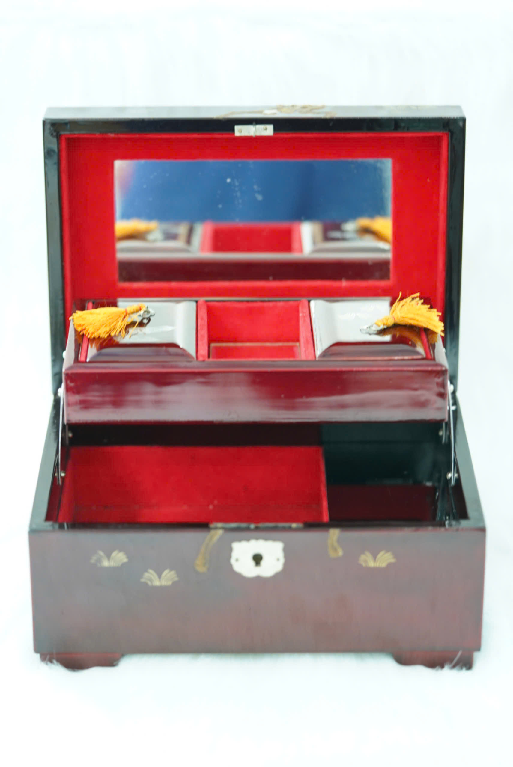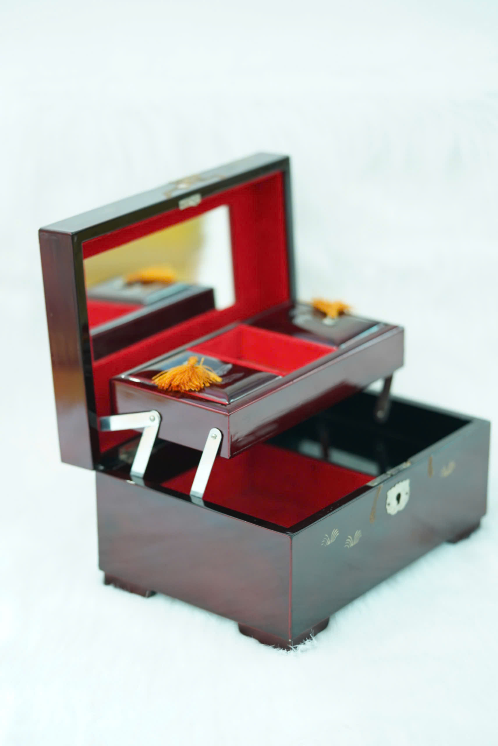 Tầng trên: có khay lắp rời với nhiều ngăn nhỏ, phù hợp để nhẫn, khuyên tai, hoặc các phụ kiện nhỏ. Hai bên khay có tua rua màu vàng cam trang trí tinh xảo.