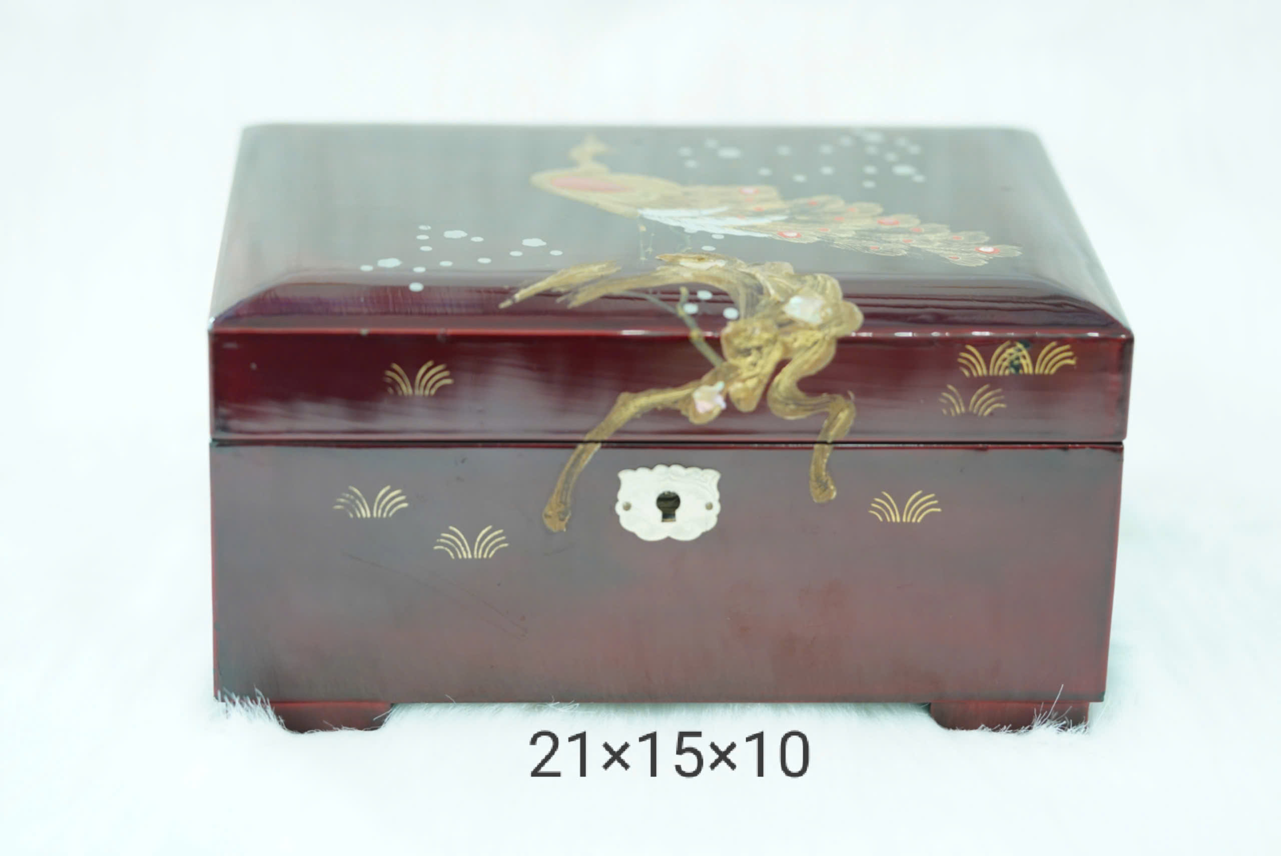 Hộp trang sức có hình chữ nhật, được làm từ gỗ sơn mài bóng màu nâu đỏ đậm, tạo cảm giác sang trọng và cổ điển.