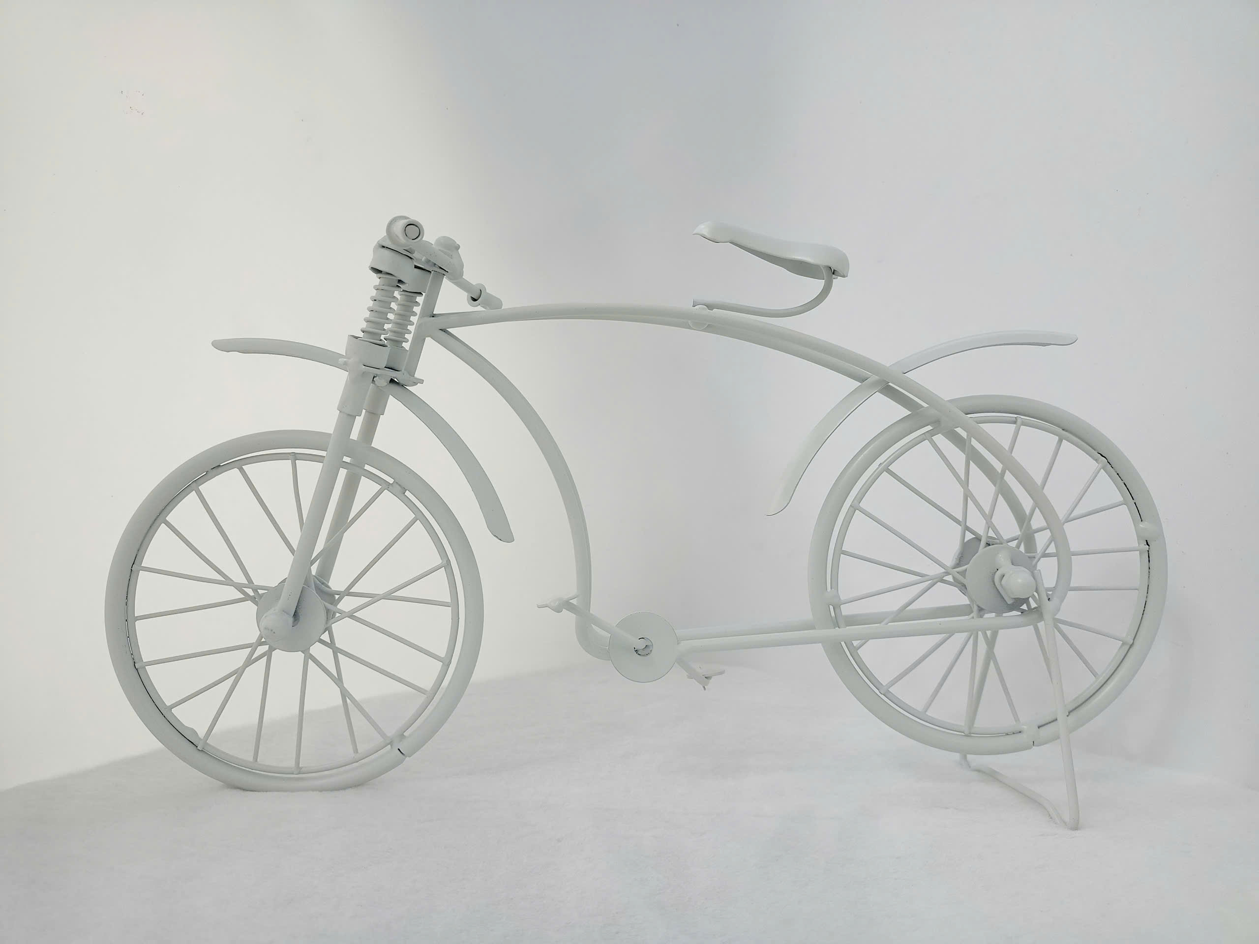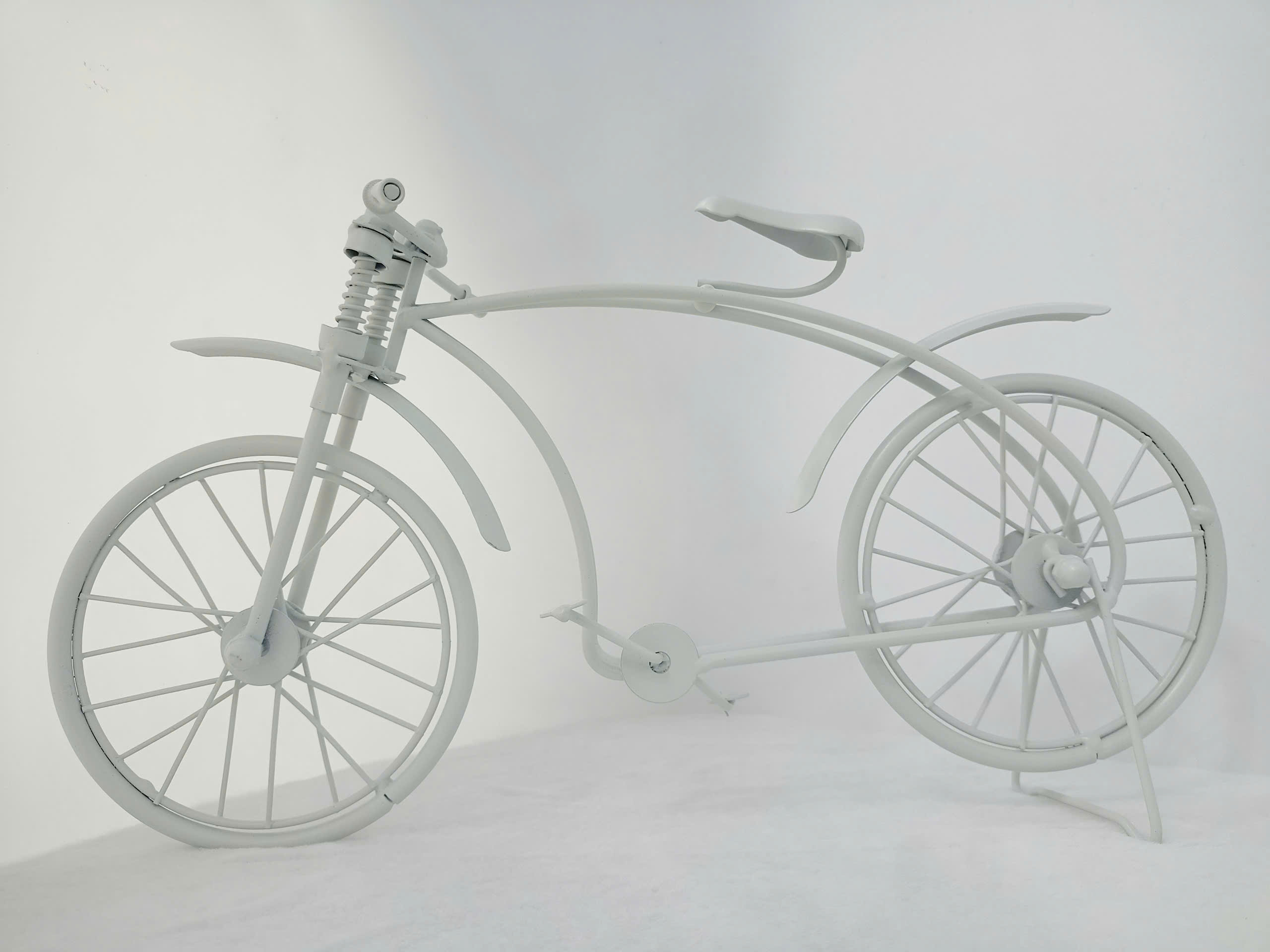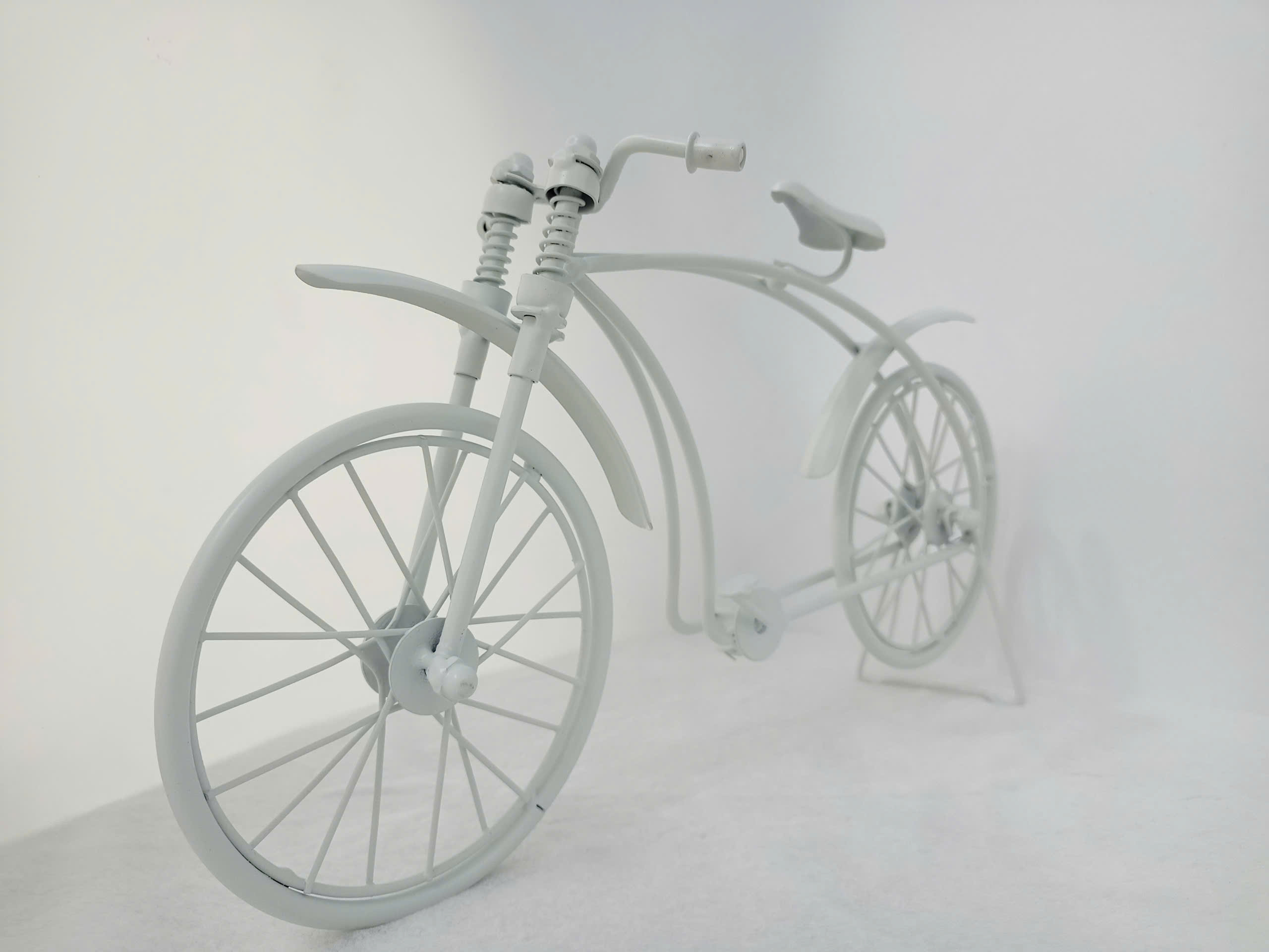 Mô hình xe đạp cổ điển được chế tạo hoàn toàn từ loại kim, phủ lớp sơn trắng tĩnh điện mang lại vẻ ngoài lịch sử và cổ điển. Thiết kế mô phỏng một chiếc xe đạp retro với các chi tiết tinh như khung xe công nghệ thương mại, bánh xe nan hoa đối xứng và yên xe thuôn gọn, tái hiện phong cách thập niên xưa. Phần giảm xoc và chắn trước càng làm tăng thêm độ chân thực và nghệ thuật cho sản phẩm. Đây là món đồ trang trí hoàn hảo để làm điểm nhấn cho bàn làm việc, kệ sách, hay không gian phòng khách, đồng thời cũng là một lựa chọn lý tưởng để làm quà tặng cho những người yêu thích xe cổ và nghệ thuật.