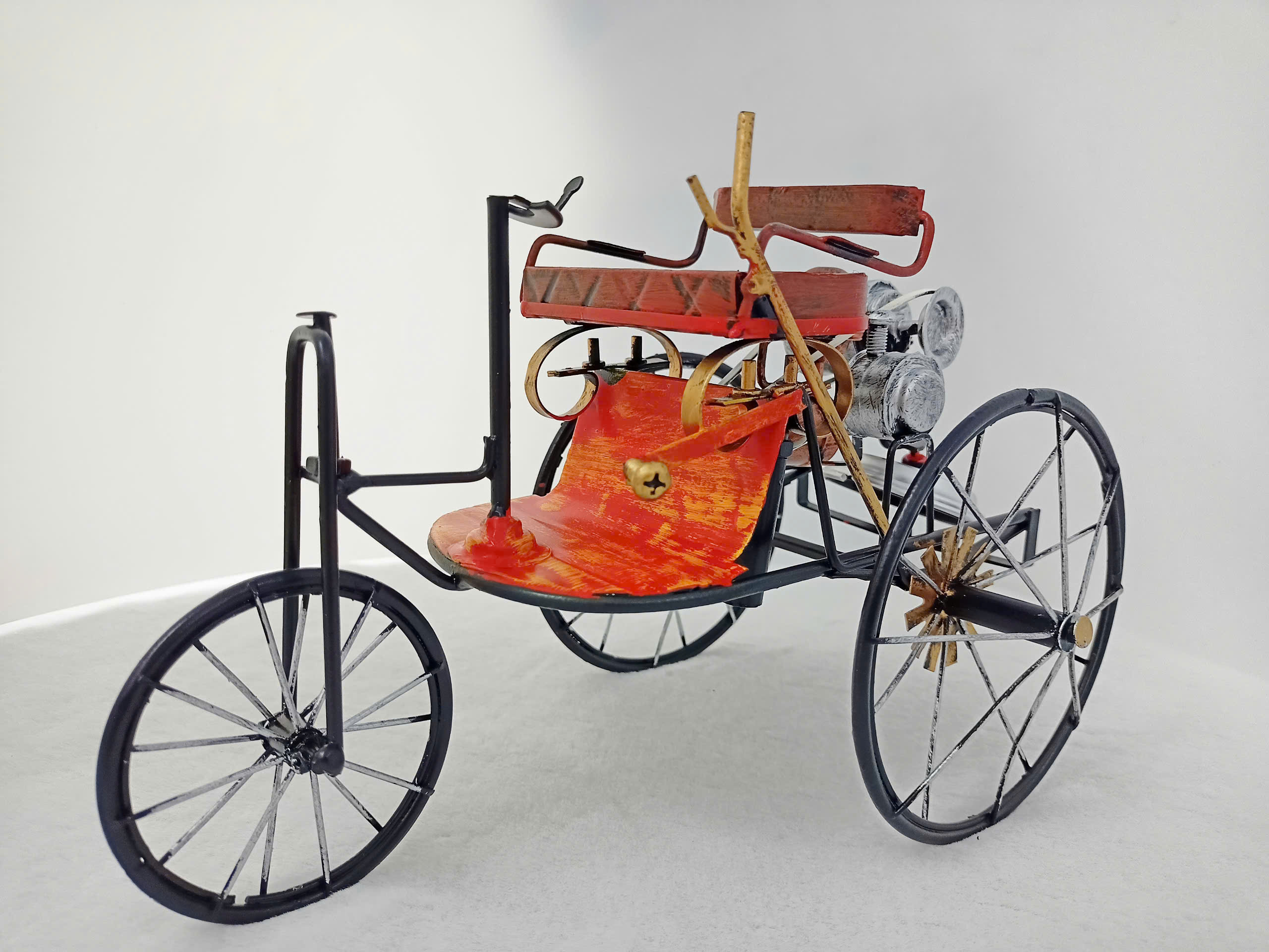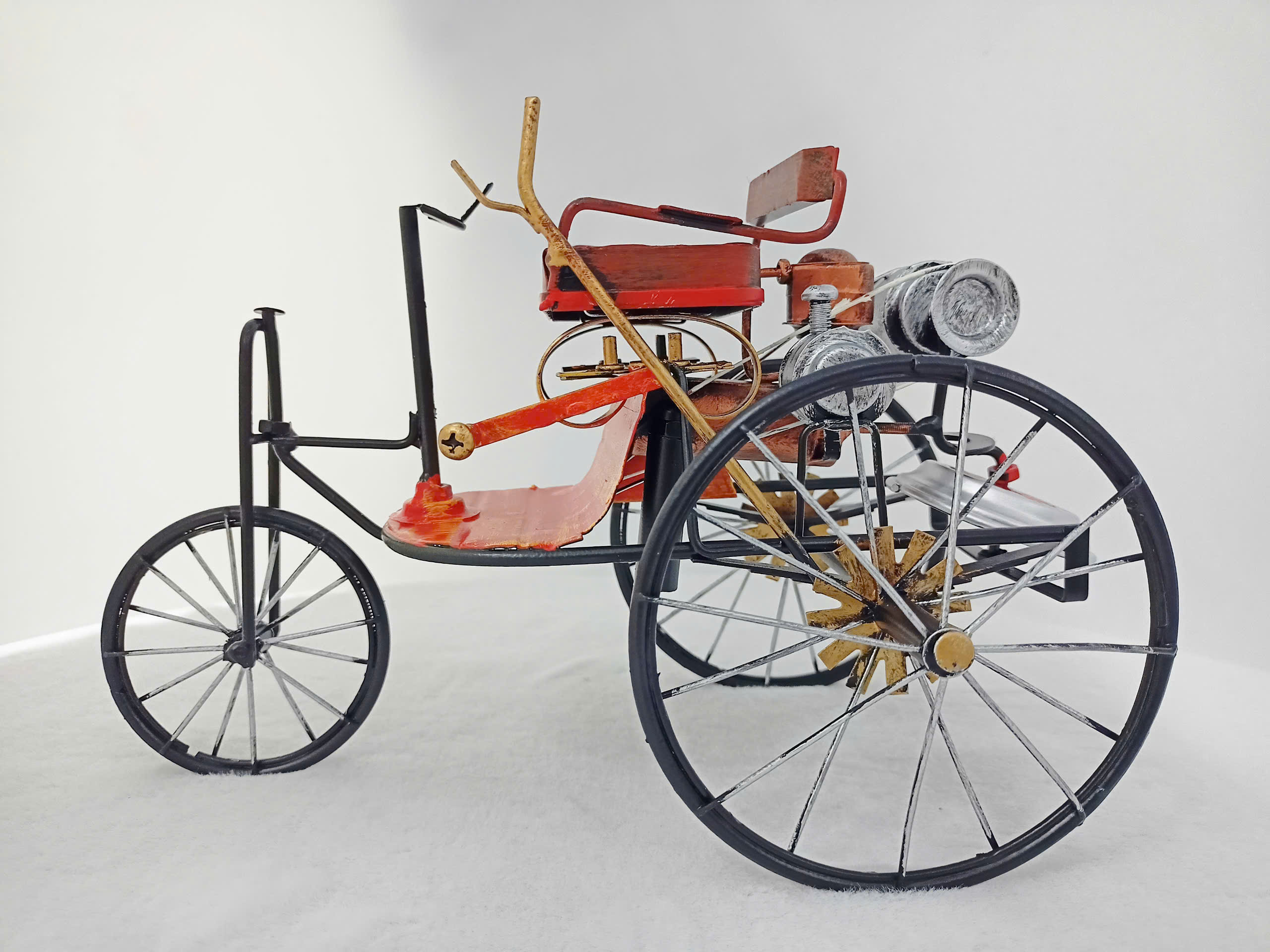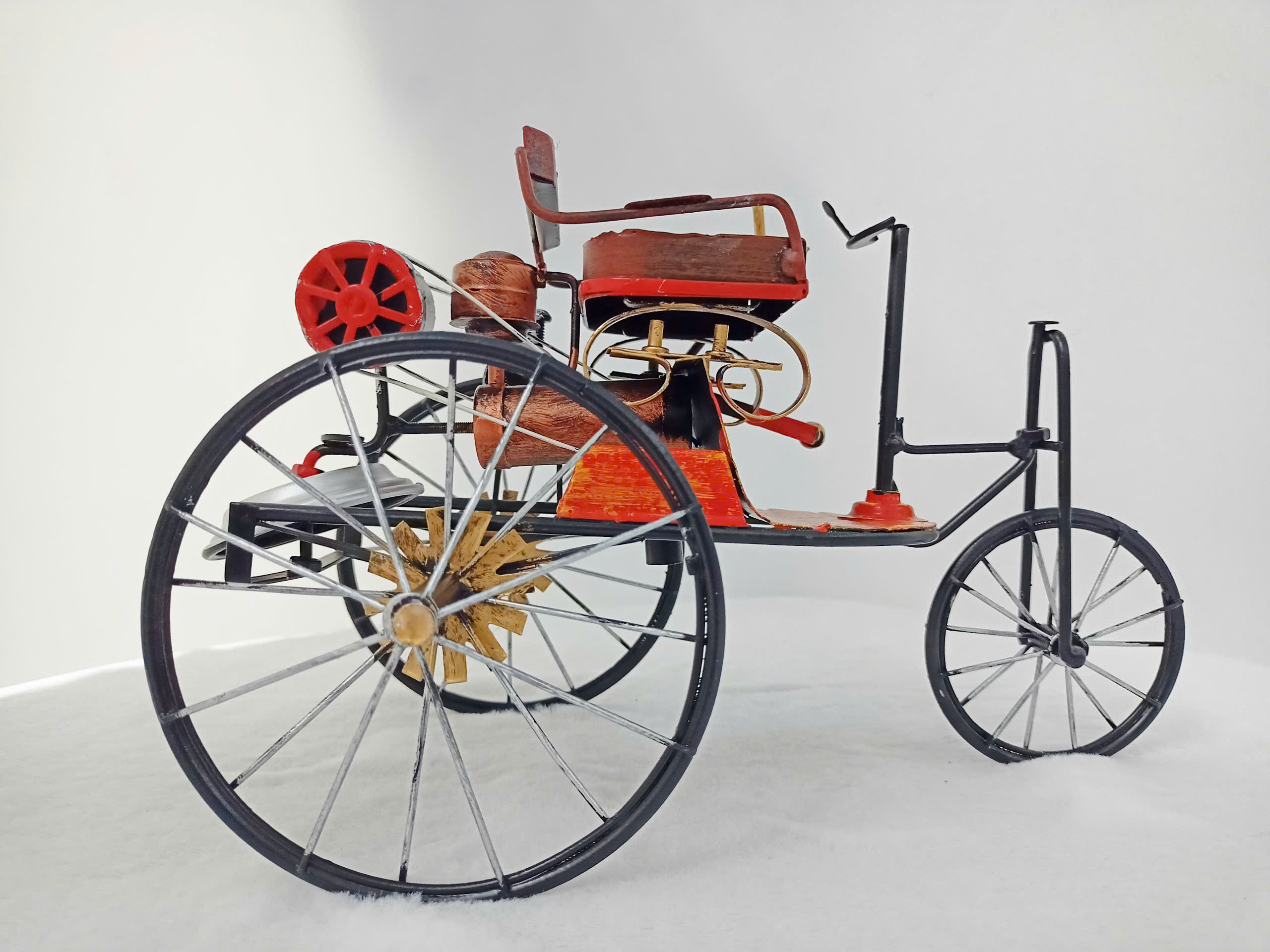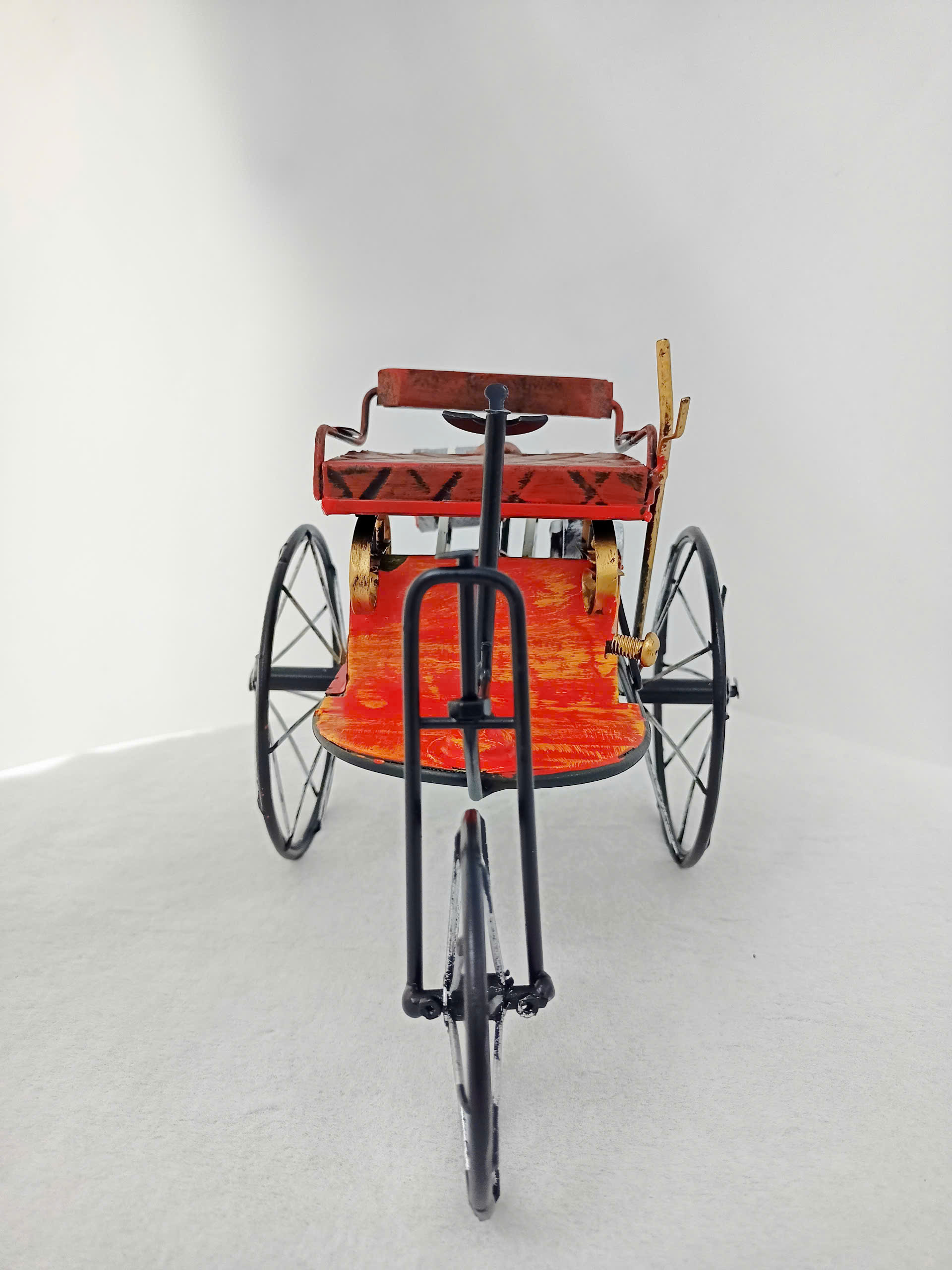 Mô hình xe hơi cổ điển ba bánh được chế tạo tinh hoàn, tái hiện một trong những thiết kế đầu tiên của ngành công nghiệp ô tô. Xe có khung kim loại đen chắc chắn, với phần ghế ngồi và tựa lưng bằng gỗ màu đỏ rực rỡ, tạo điểm nhấn nổi bật. Bánh xe nan hoa được thiết kế chi tiết, kết hợp với các máy chi tiết được mô phỏng chân thực ở phía sau, mang lại vẻ ngoài độc  và đầy hoài cổ. Với phong cách thiết kế cổ điển, đây không chỉ là món đồ trang trí độc đáo mà còn là sản phẩm tập hợp ý tưởng dành riêng cho những người đam mê lịch sử phát triển phương tiện giao thông tiện ích.