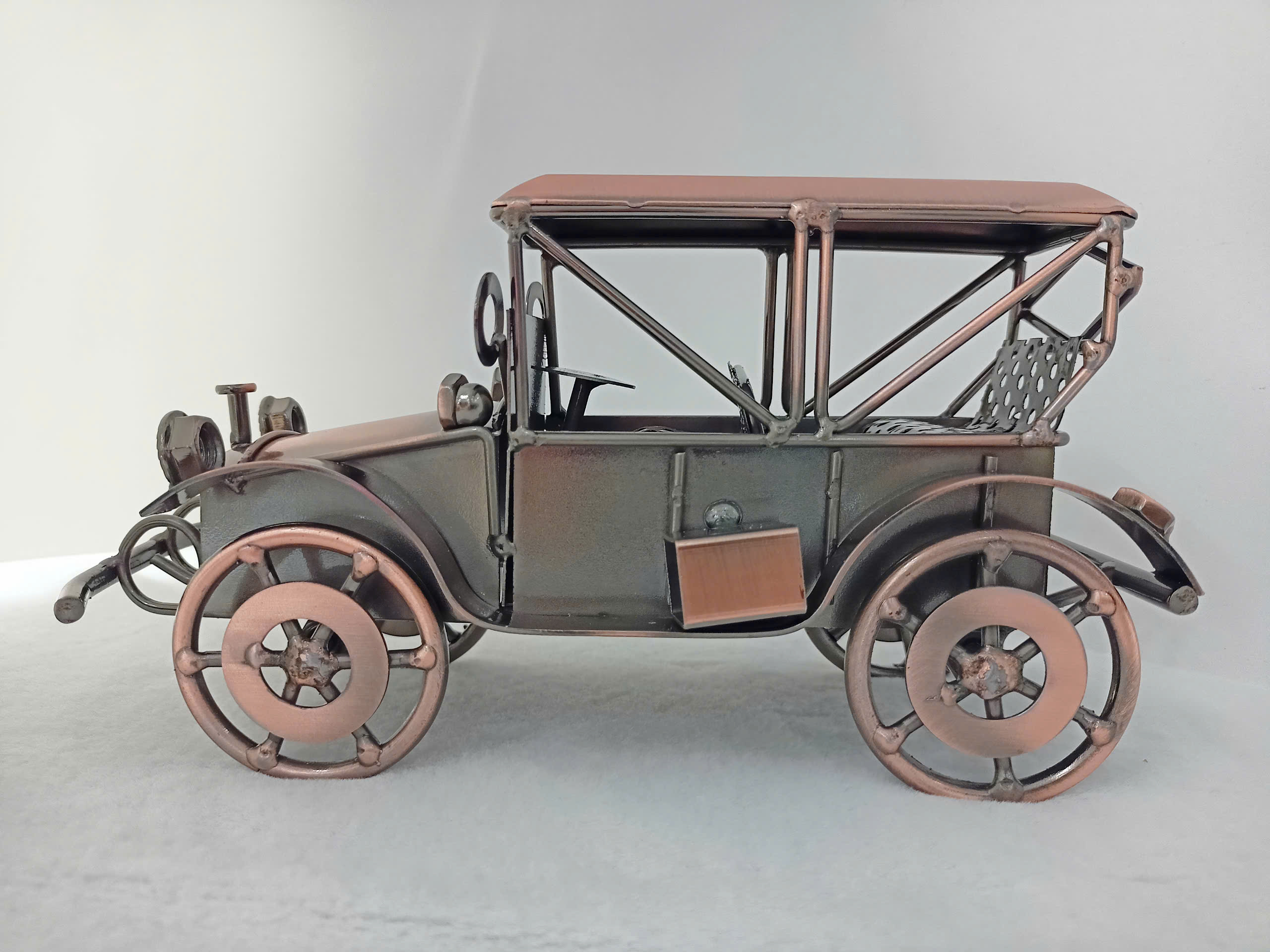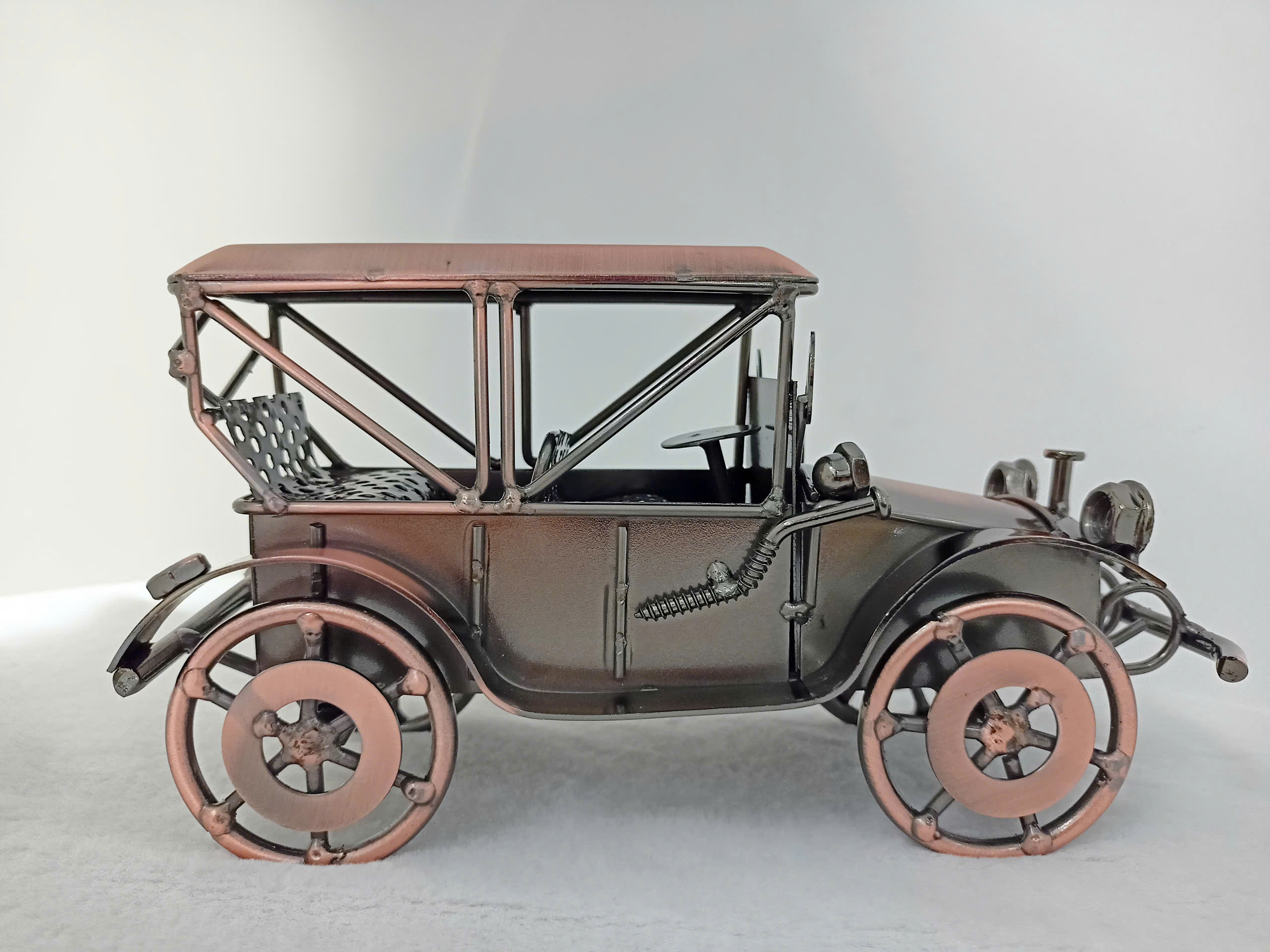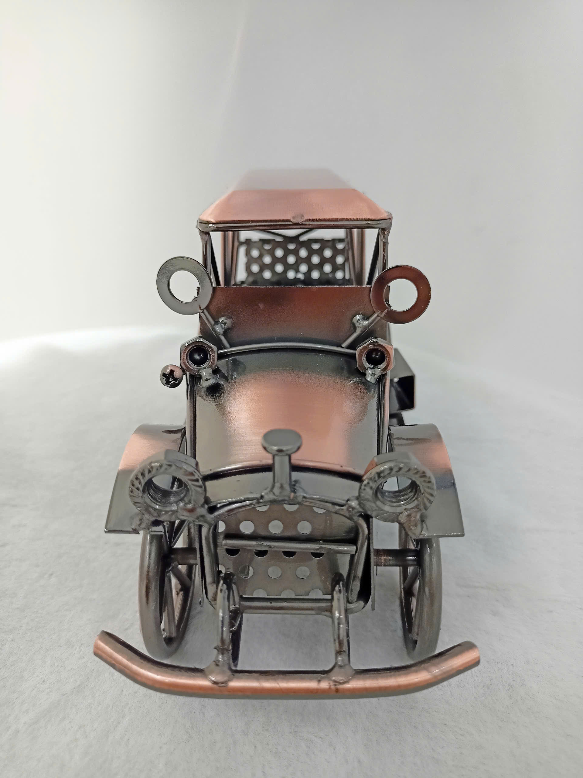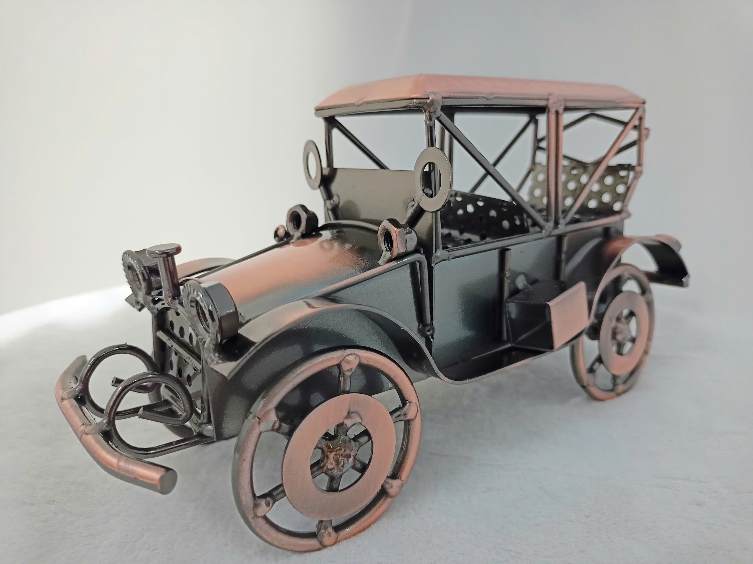 Mô hình xe hơi cổ điển được chế tạo tỉ mỉ từ loại kim, kết hợp giữa phong cách hoài cổ và tinh tế hiện đại. Phần thân xe được hoàn thiện với lớp sơn màu đồng và bạc, tạo vẻ đẹp vừa sang trọng đậm chất retro. Các chi tiết như bánh xe, đèn pha, lò sưởi và cản trước được thiết kế tỉ mỉ, mô phỏng hoàn hảo hình ảnh của những chiếc xe hơi từ đầu thế kỷ 20. Điểm nhấn đặc biệt là phần cửa kính và mái che dạng khung, cùng một thiết kế nội thất độc đáo với dấu chấm văn bản. Đây là một lựa chọn lý tưởng để làm quà tặng, trang trí không gian làm việc, hoặc bổ sung vào bộ sưu tập của những người đam mê xe hơi cổ điển.