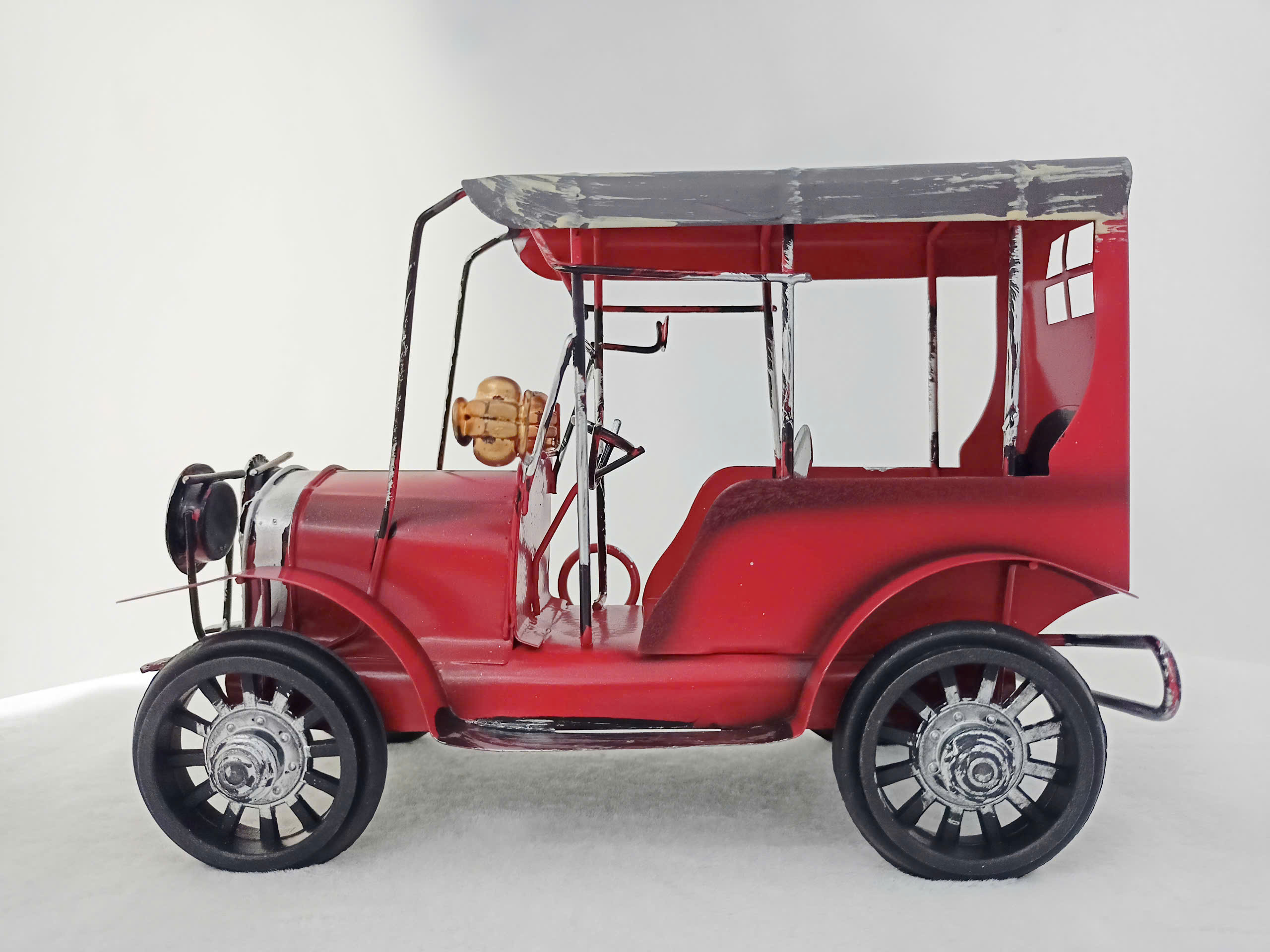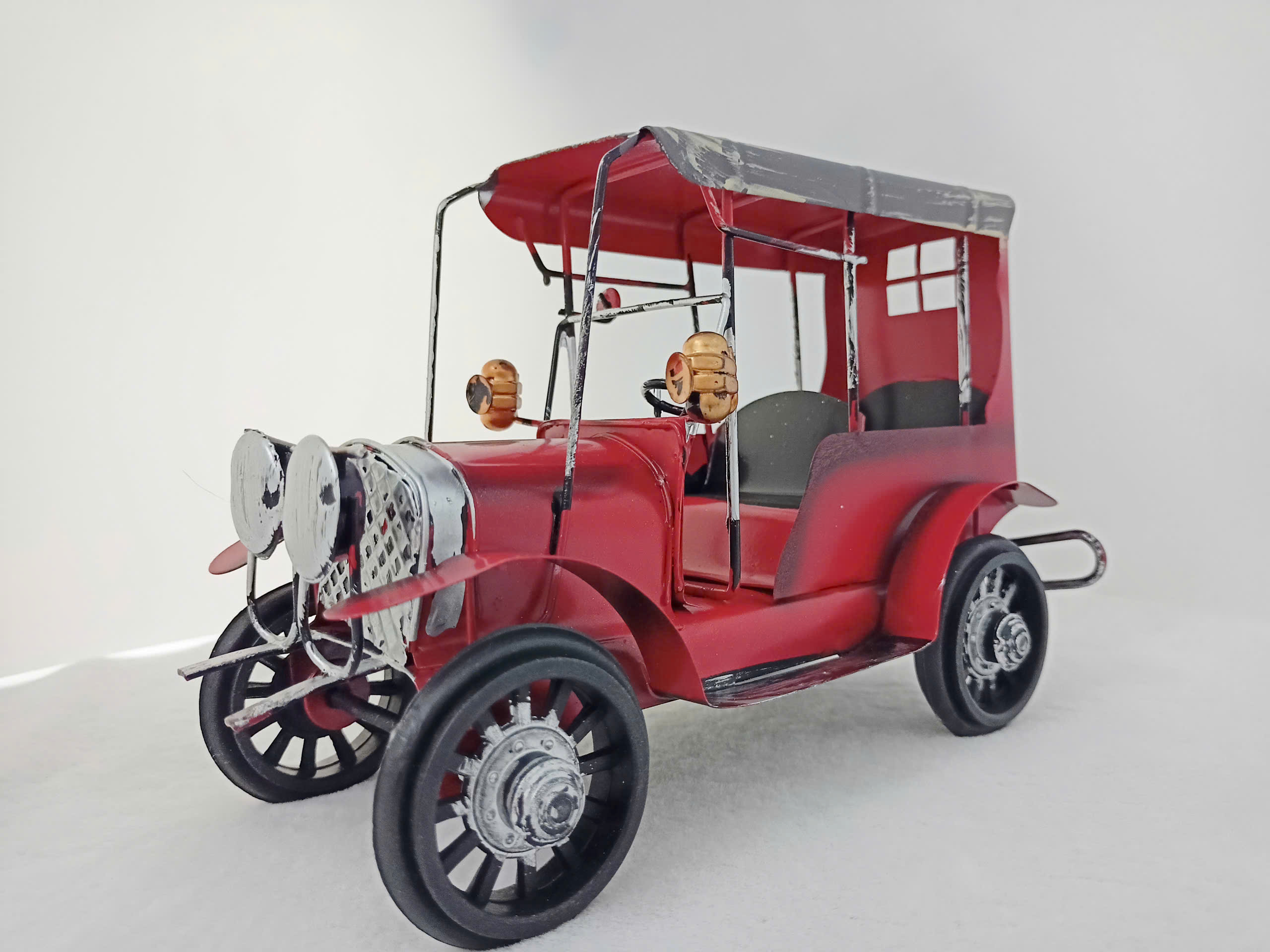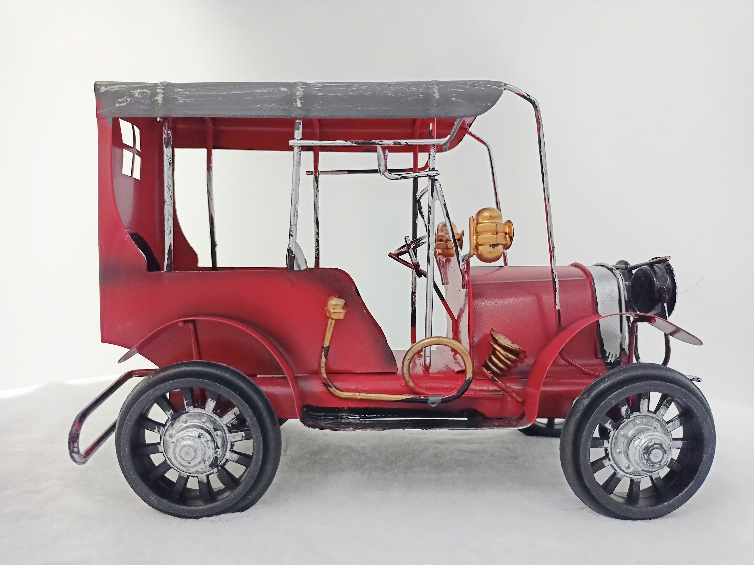 Mô hình xe hơi cổ điển được chế tác tinh hoàn, tái hiện vẻ đẹp lịch trưng bày của những chiếc xe thập niên đầu thế kỷ 20. Xe nổi bật với màu đỏ rực rỡ, khung xe kim loại bền và các chi tiết được gia công công nghệ như đèn pha, bánh xe nan hoa và tấm thép. Phần mui xe được thiết kế mở, với các ghế ngồi bên trong được hoàn thiện, mang đến vẻ sang trọng và cổ điển. Các chi tiết như lò sưởi và kính chiếu hậu được mạ bạc, tăng thêm phần nổi bật và chân thực. Đây là một sản phẩm nghệ thuật lý tưởng để trang trí hoặc làm quà tặng cho những người yêu thích xe cổ và sự tinh tế trong thiết kế.