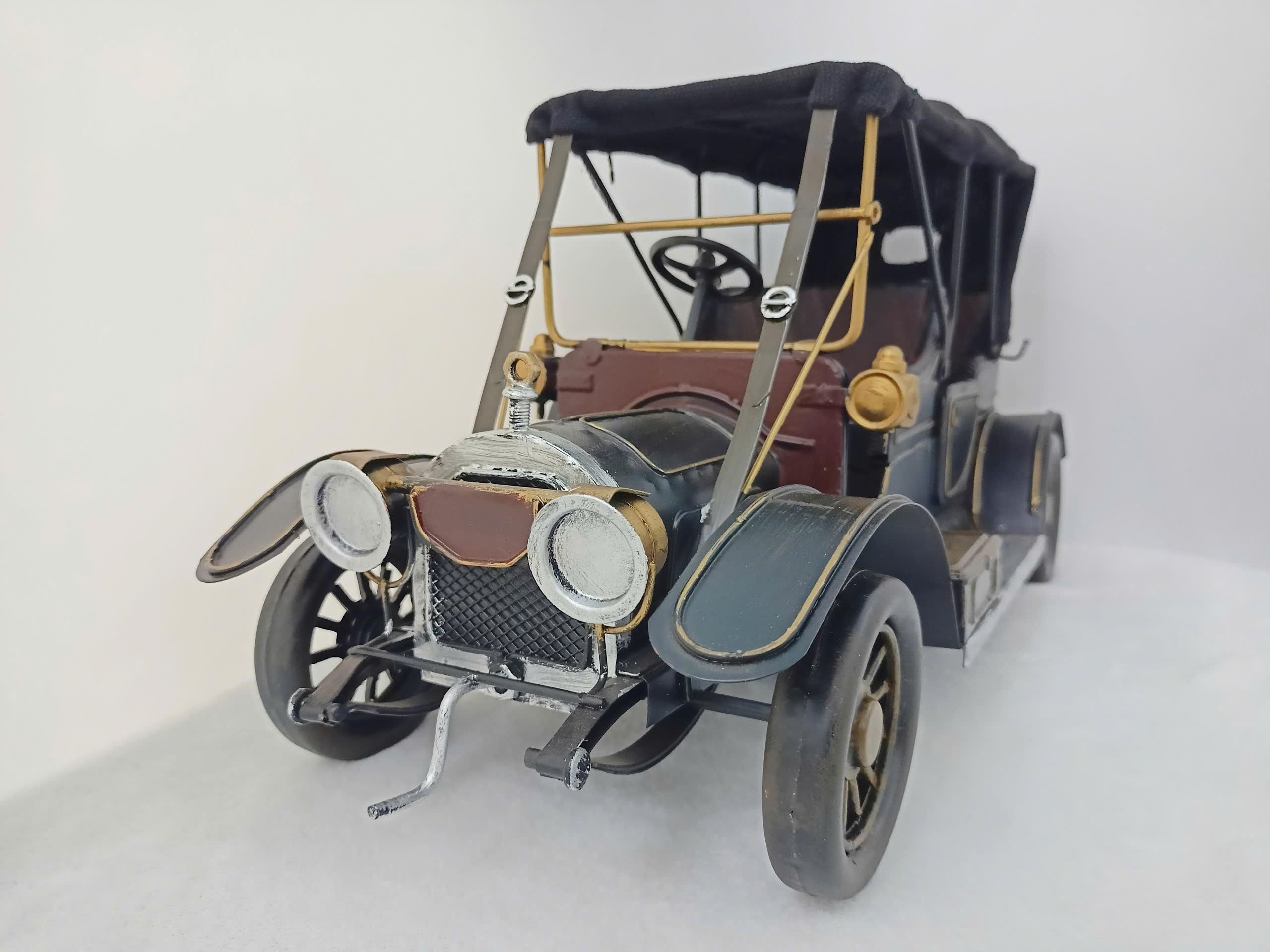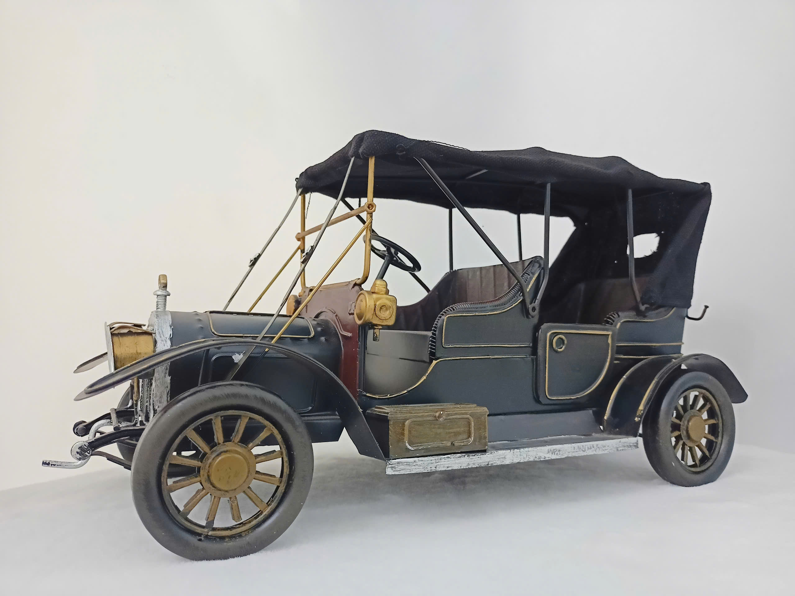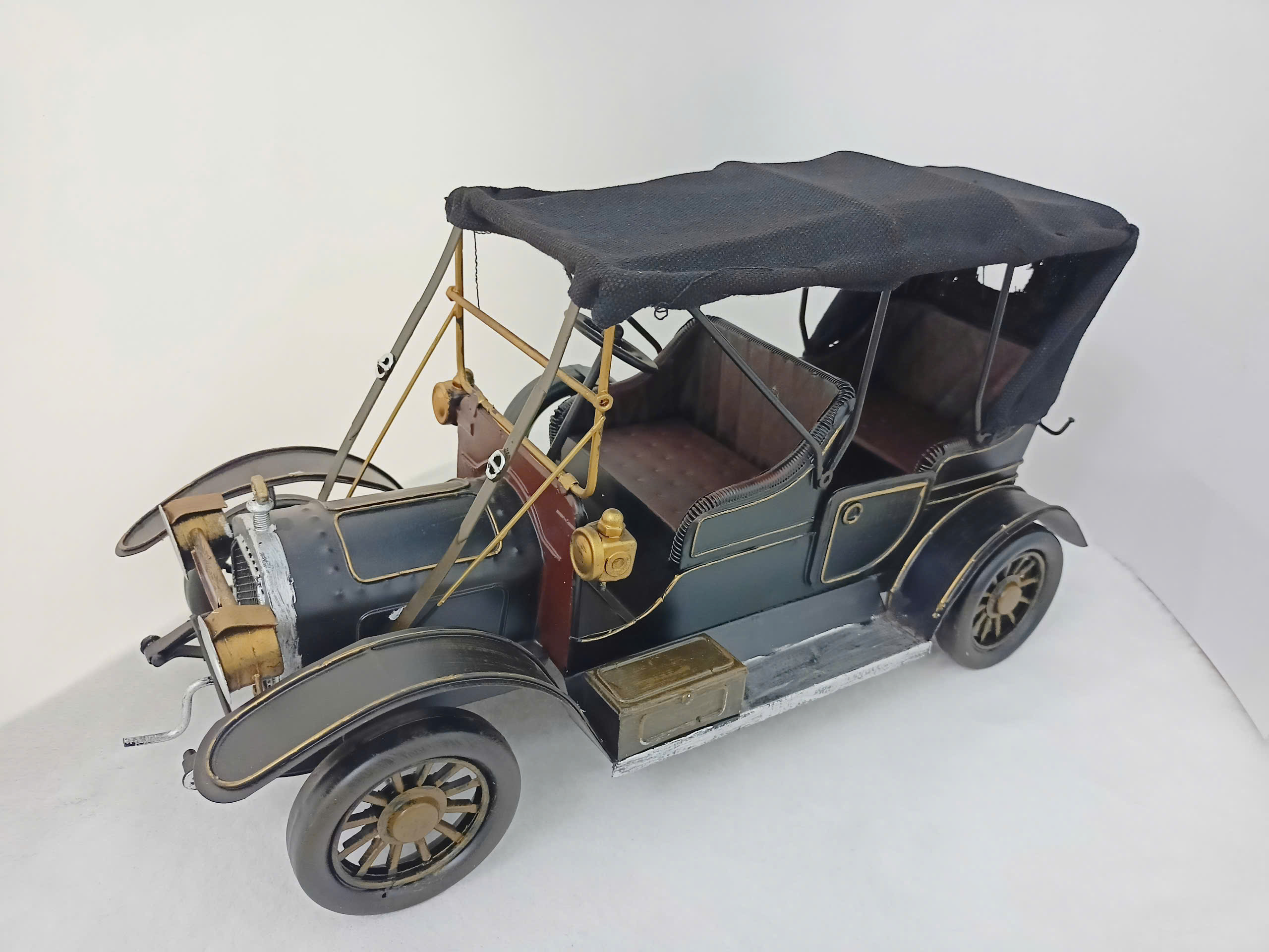 Mô hình xe hơi cổ điển tái hiện phong cách thiết kế độc lập của thập niên thế kỷ 20, nổi bật với sự kết hợp giữa kim loại và chi tiết thủ công tinh tinh. Được phủ lớp sơn đen bóng, điểm nhấn bằng các đường viền vàng, tạo nên vẻ ngoài sang trọng và hoài cổ. Mái che được làm từ vải đen thương mại có thể nhìn thấy được, mang đến chân thực và cổ điển. Phần đầu xe nổi với lưới tản nhiệt, đèn pha đôi tròn lớn và các loại chi tiết kim loại mạ sáng bóng. Thất bại trong thiết kế mở, yên ngồi và tay lái tái sinh đã xác định rõ phong cách cổ xưa. Đây là một món đồ trang trí lý tưởng cho không gian làm việc, phòng khách hoặc bộ sưu tập của những người yêu thích xe hơi cổ.