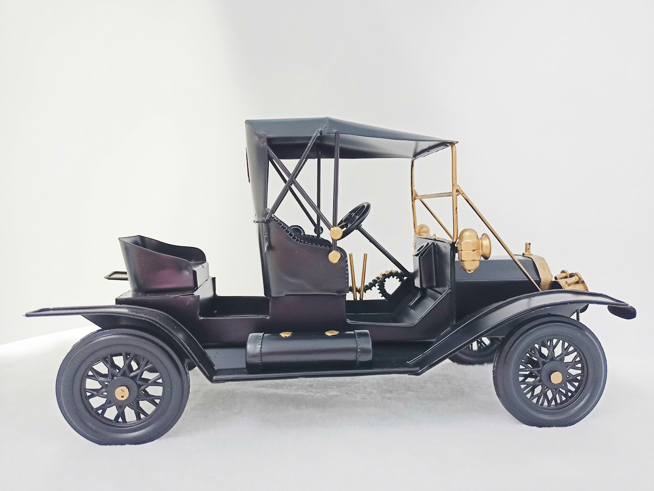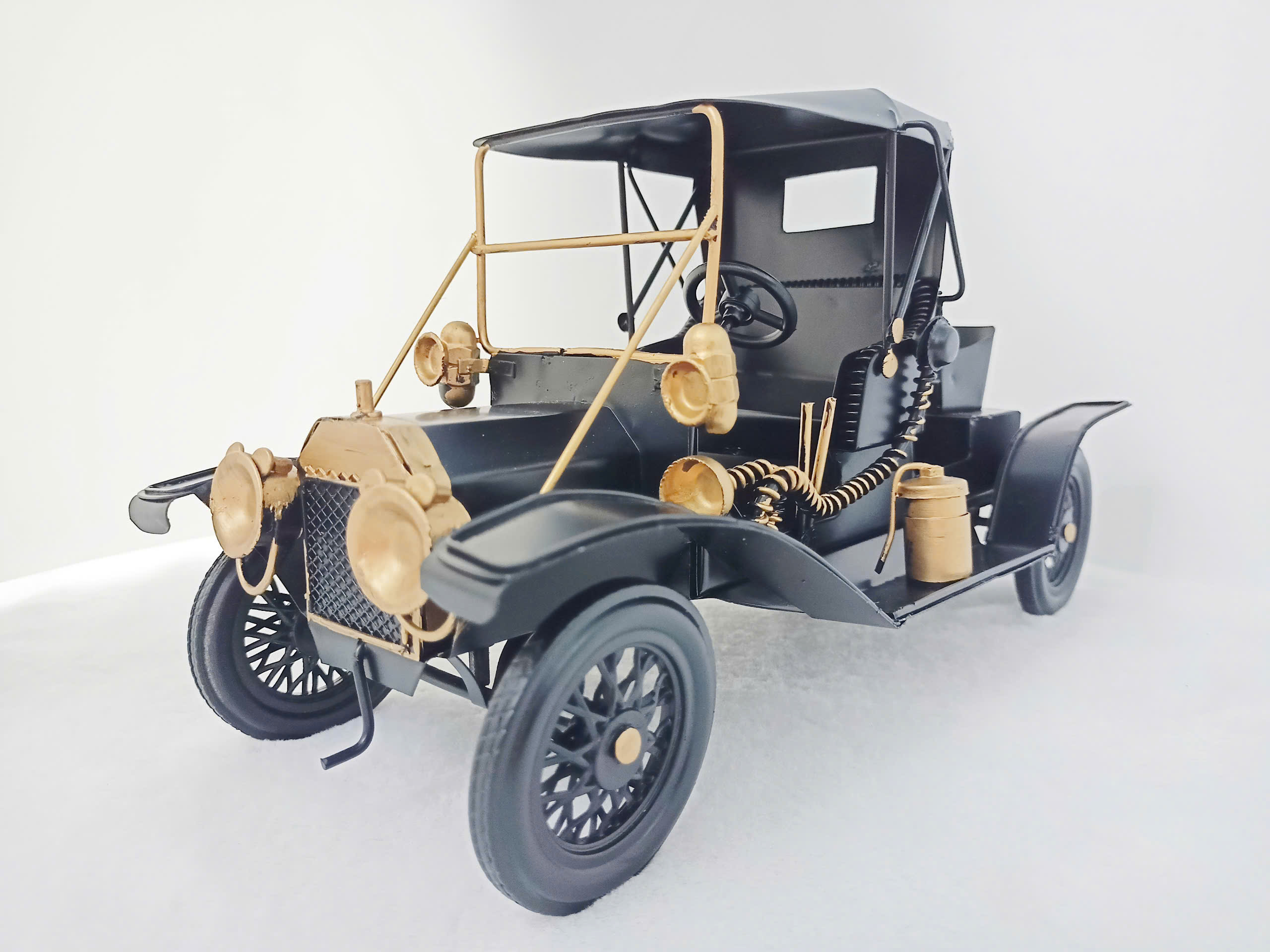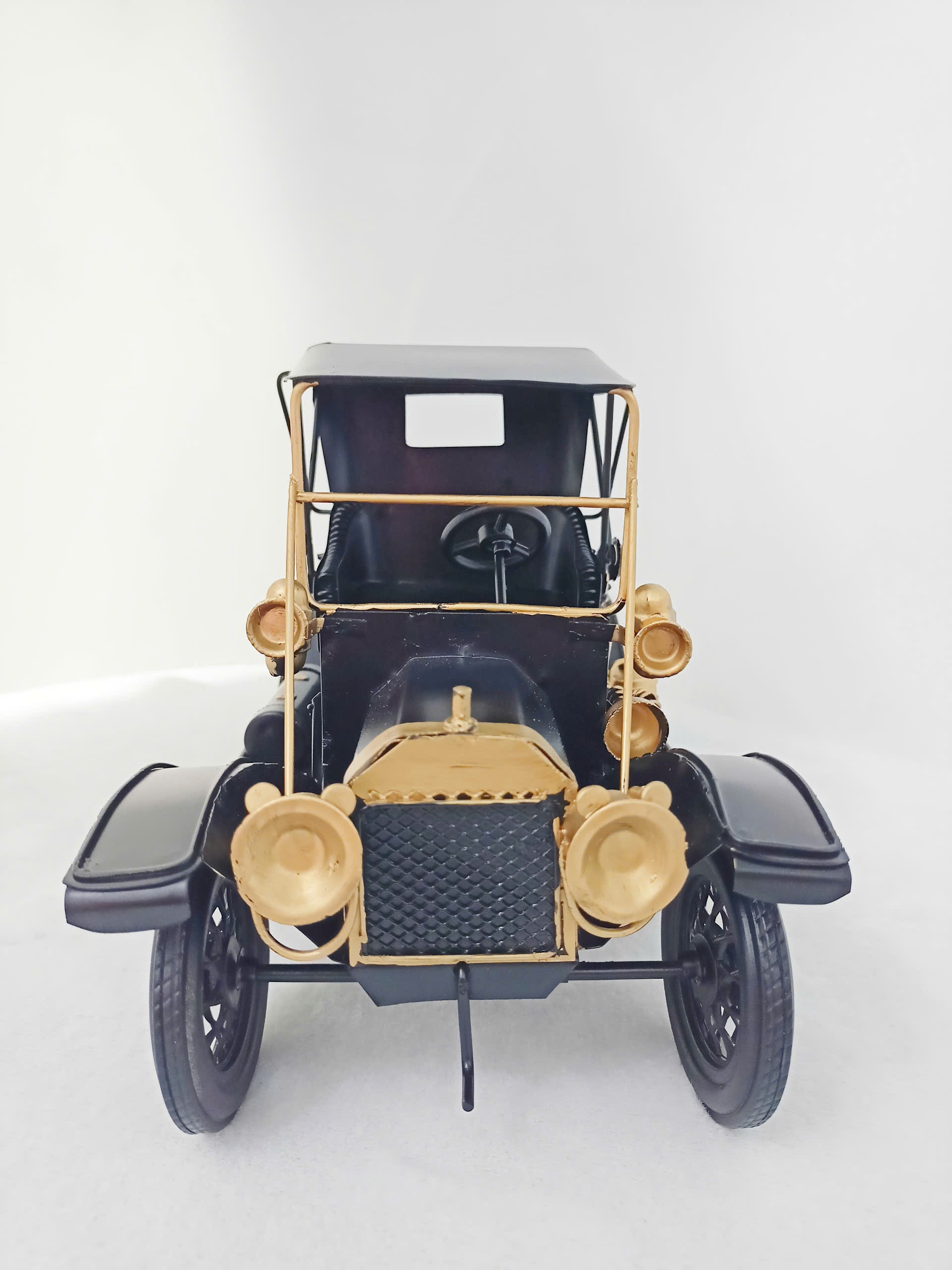 Mô hình xe hơi cổ điển được chế độ tỉ tỉ, tái hiện vẻ đẹp sang trọng và hoài cổ của những chiếc xe từ thập niên đầu thế kỷ 20. Khung xe được sơn đen bóng, tạo sức mạnh và quý phái, kết hợp với các chi tiết kim loại mạ vàng nổi bật như lưới tản nhiệt, đèn pha và tay nắm. Nội thất được thiết kế mở với ghế ngồi bọc da giả và vô lăng cổ điển, mang đến cảm giác chân thực và đầy tinh tế. Điểm nhấn độc nhất còn nằm ở các phụ kiện như ống khí cụ, chủng loại kim loại, và thùng chứa mang phong cách cổ điển, làm nổi bật tính lịch sử của sản phẩm. Đây là lựa chọn lý tưởng để làm quà tặng hoặc trang trí cho không gian sống, phòng làm việc hoặc bộ sưu tập của những người đam mê xe cổ.