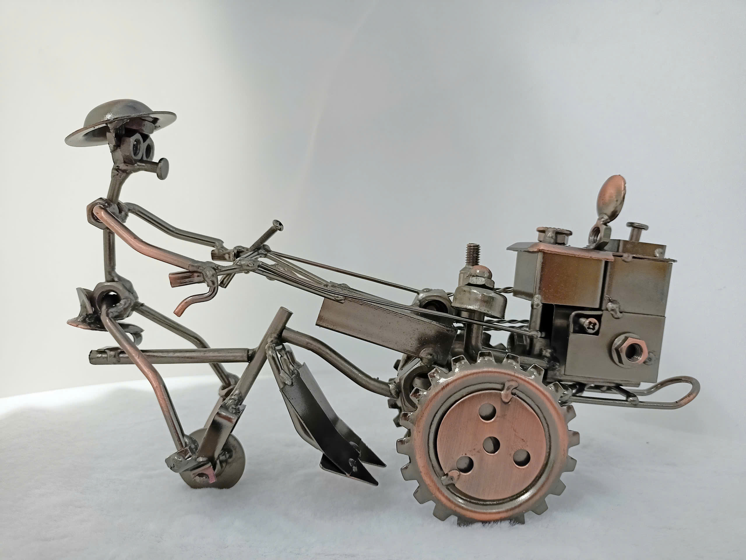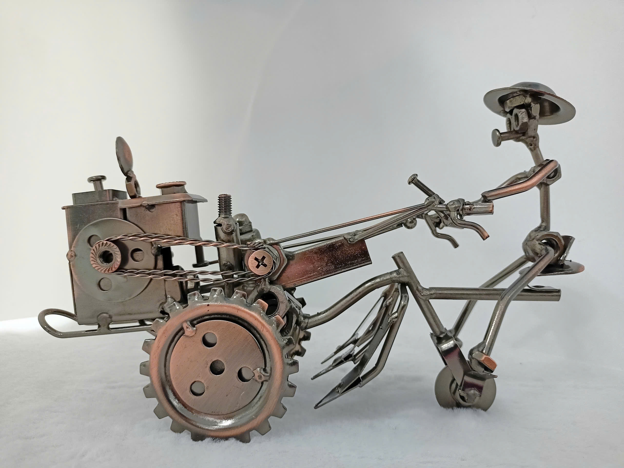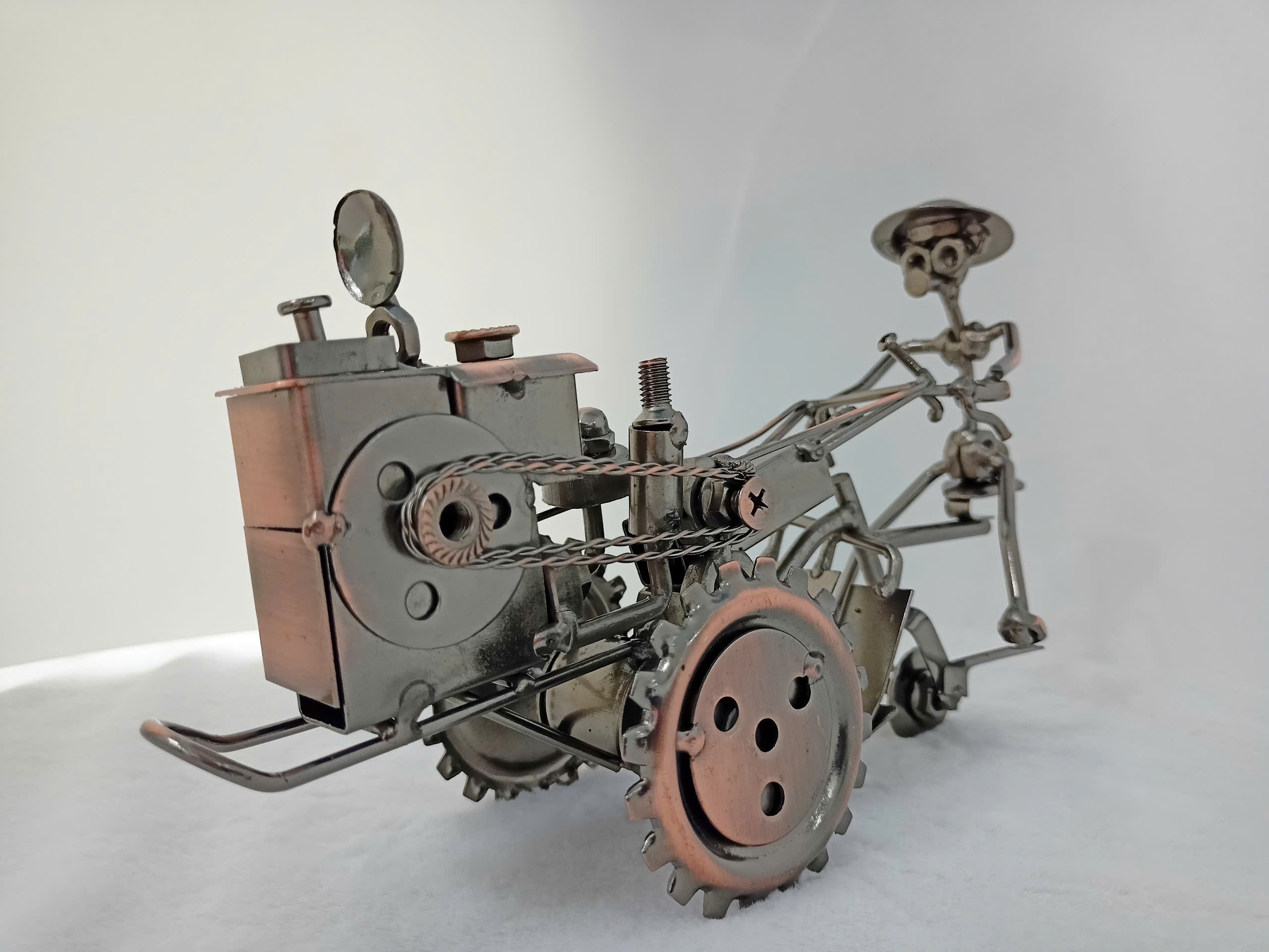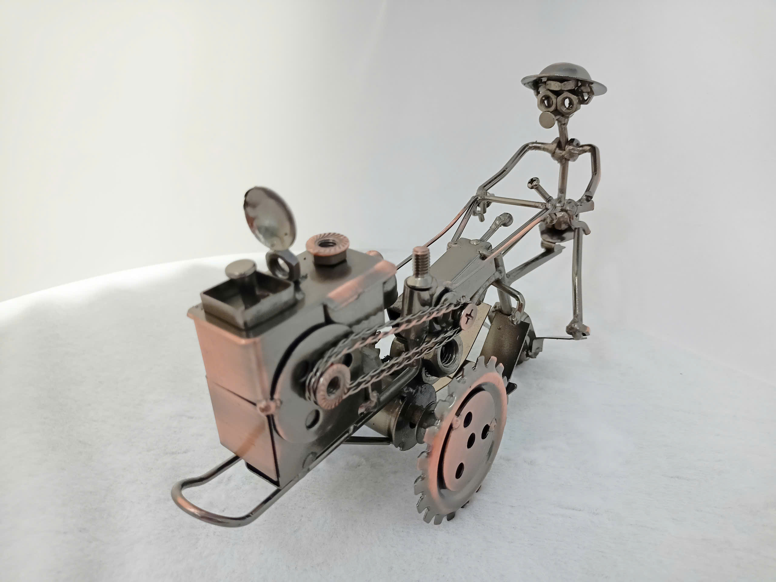 Mô tả máy kéo được chế tạo hoàn toàn từ loại kim với phong cách sáng tạo, kết hợp giữa tính thực tế và nghệ thuật. Thiết kế bao gồm các chi tiết tỉ mỉ như bánh răng, xích chuyển động, và động cơ, tái chế chân thực hình ảnh máy kéo tay truyền động. Điểm nhấn của mô hình là người lái tượng trưng, được làm từ các chi tiết kim loại nhỏ ghép lại, mang đến sự hài hước và độc lập. Lớp hoàn thiện bạc bóng tạo nên vẻ ngoài tinh tế và thu hút, phù hợp để trưng bày hoặc làm quà tặng cho những ai yêu thích phong cách retro và cơ khí.