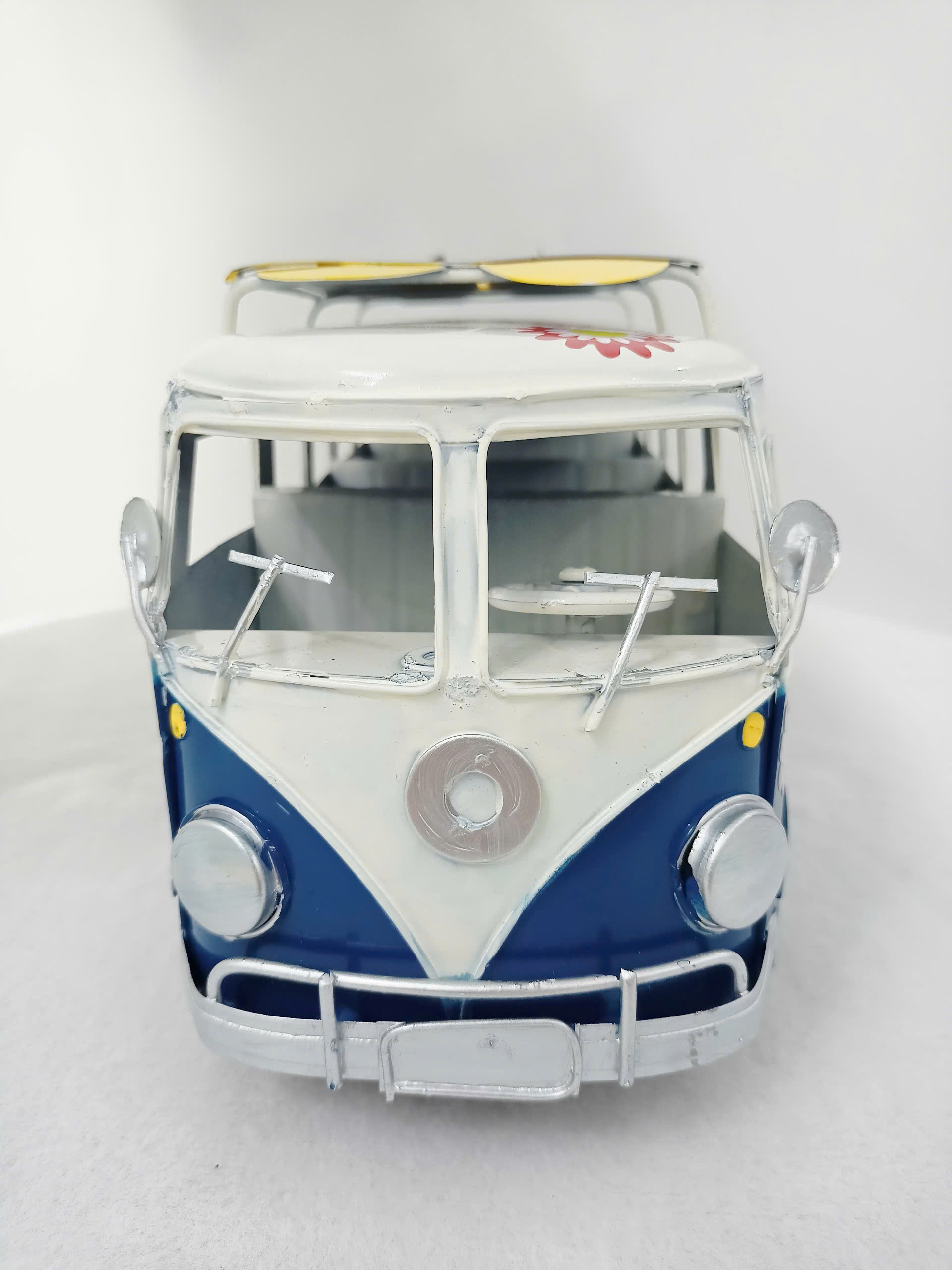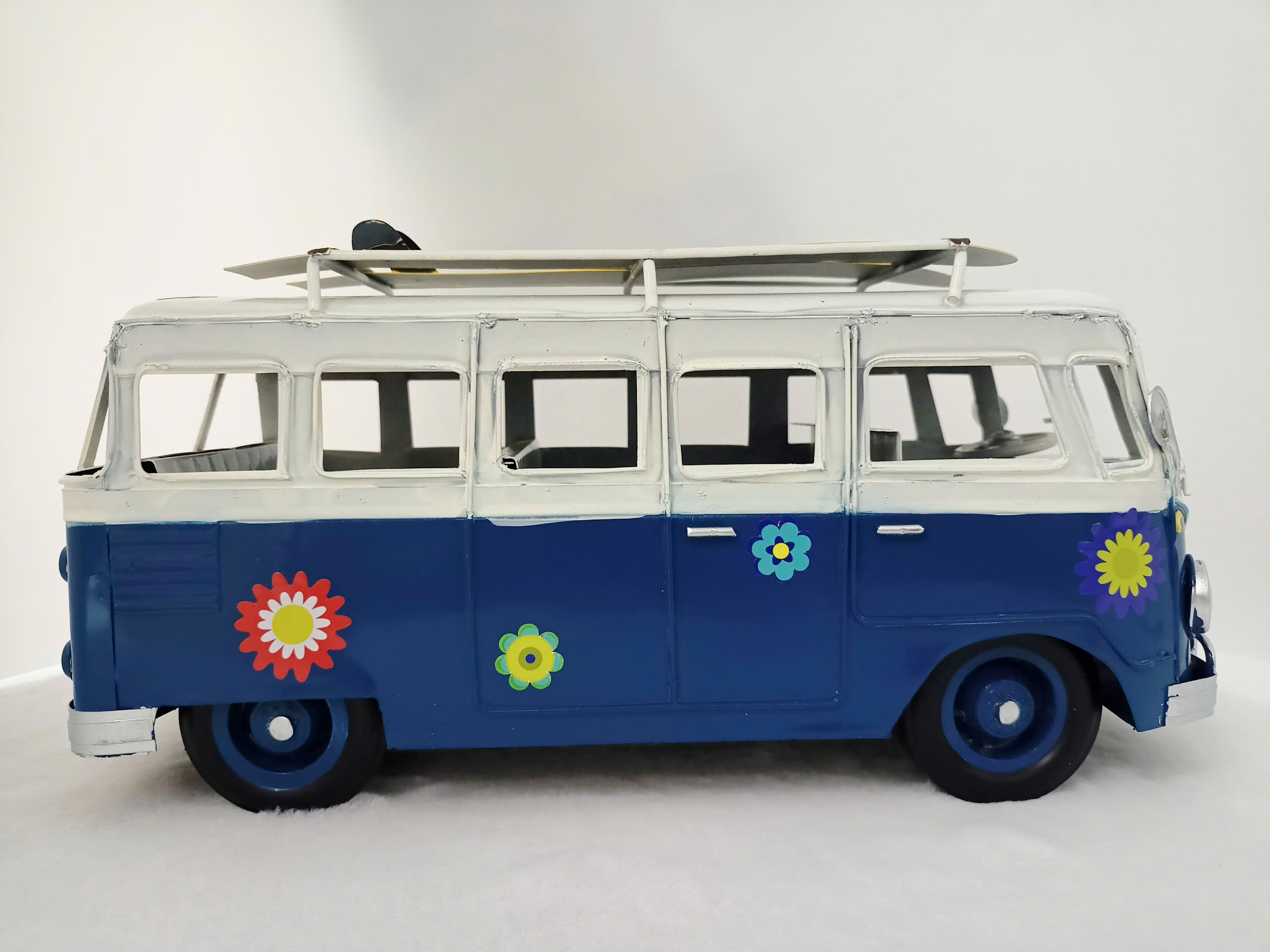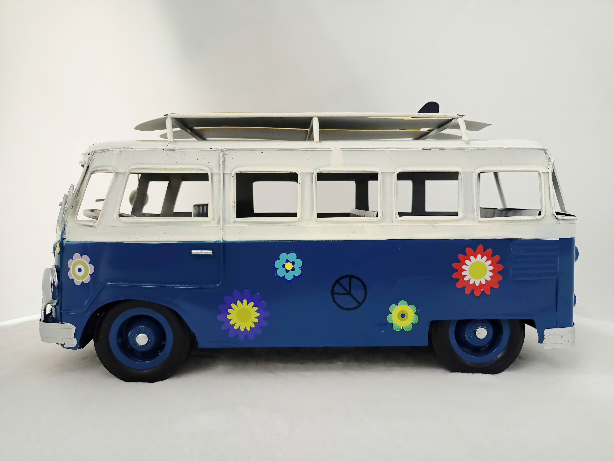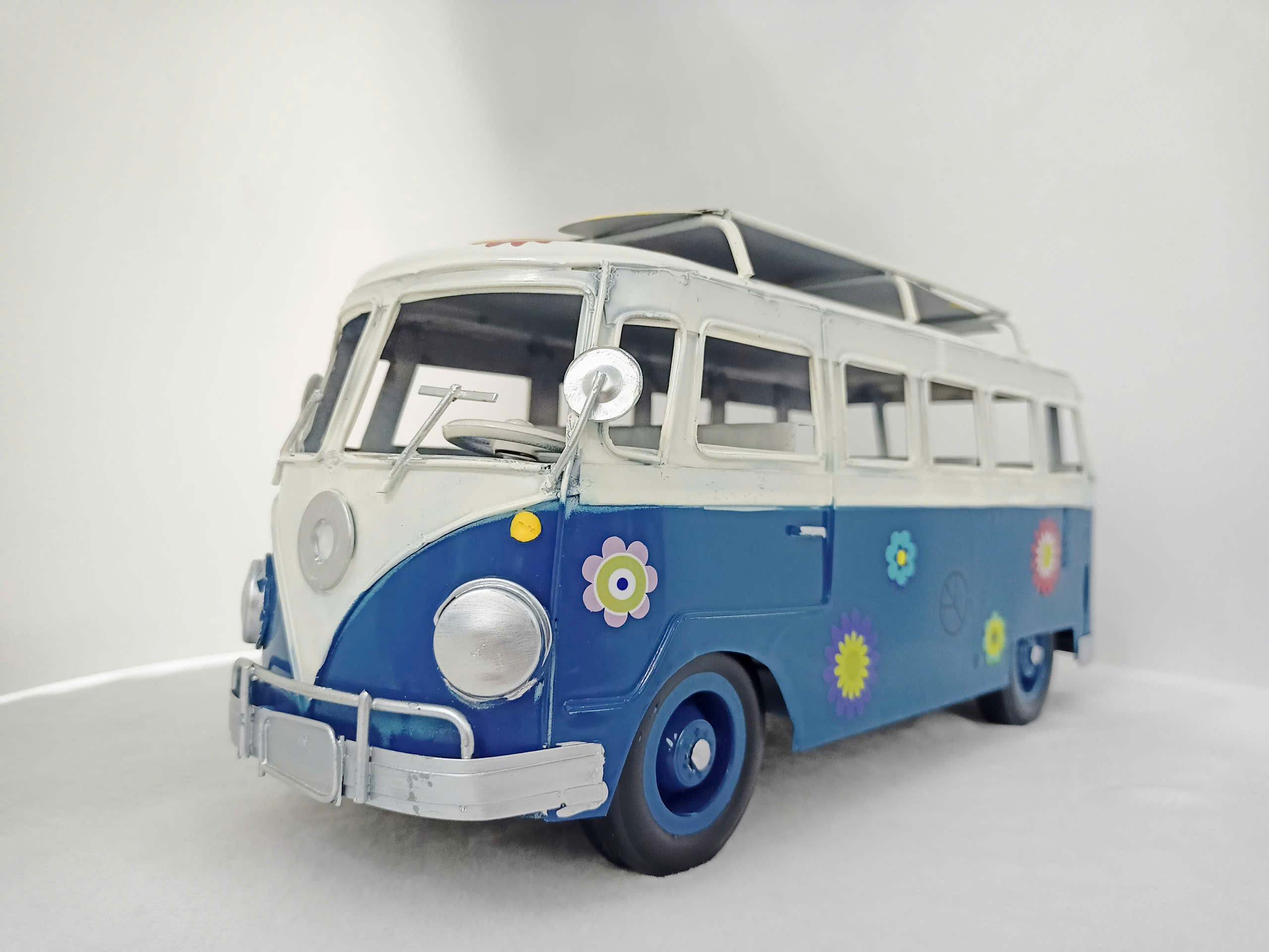 Mô hình xe van cổ điển được chế tác tỉ tỉ, lấy cảm hứng từ phong cách hoài cổ của thập niên 60. Xe mang hai tông màu xanh dương và trắng, kết hợp hài hòa hòa với họa tiết hoa lá đầy màu sắc, tip lên tinh thần tự do, tự làm và sáng tạo. Các chi tiết như kính chắn gió, kính chiếu hậu, đèn pha và bánh xe được tái sinh chính xác, tạo cảm giác chân thực và sống động. Đây không chỉ là món đồ trang trí tuyệt đẹp mà còn là biểu tượng của văn hóa retro và lối sống lạc quan, phù hợp cho người yêu thích phong cách cổ điển hoặc bộ sưu tập mô hình xe độc đáo.